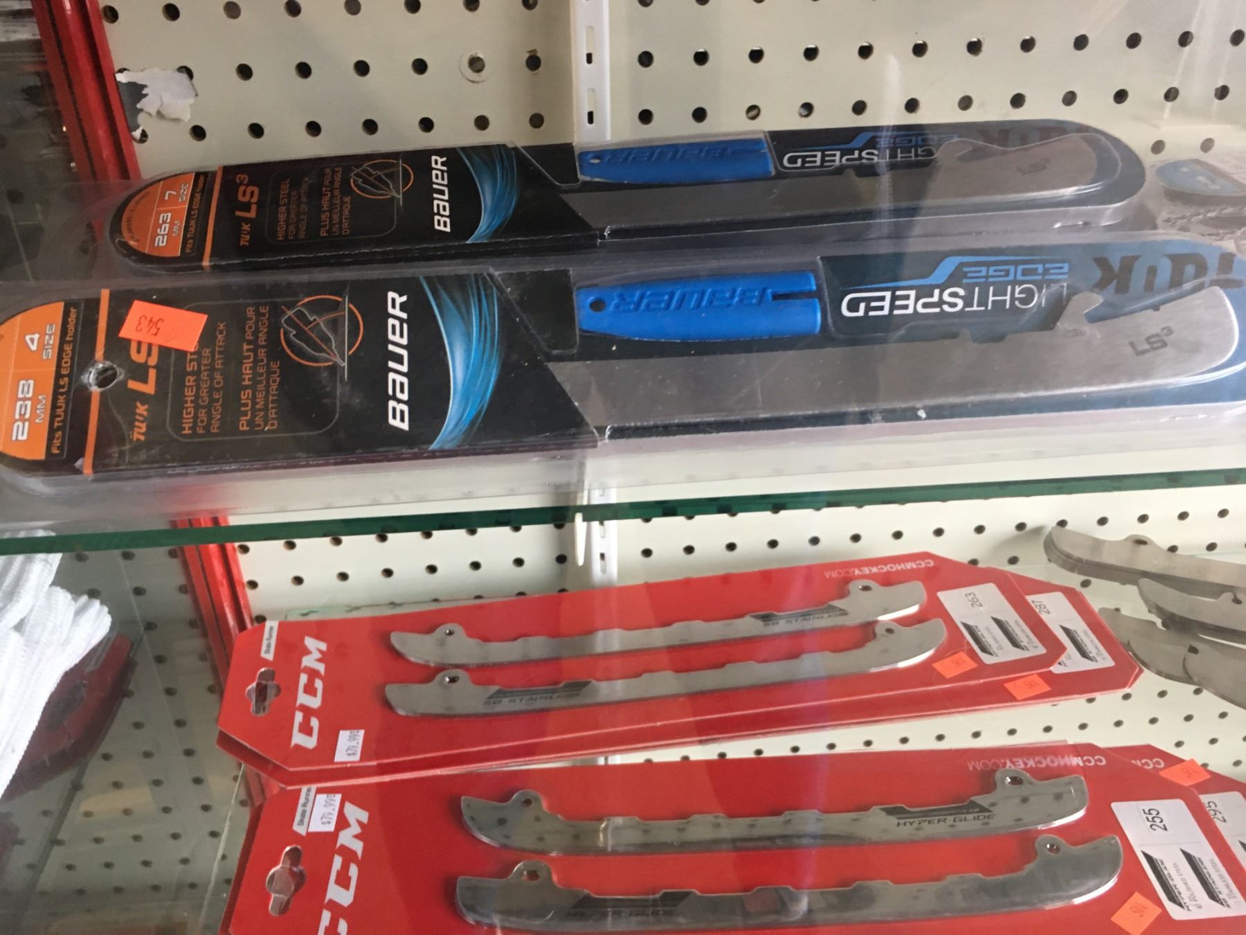 SHELF OF ASSORTED BAUER PERFORMANCE SKATE BLADES