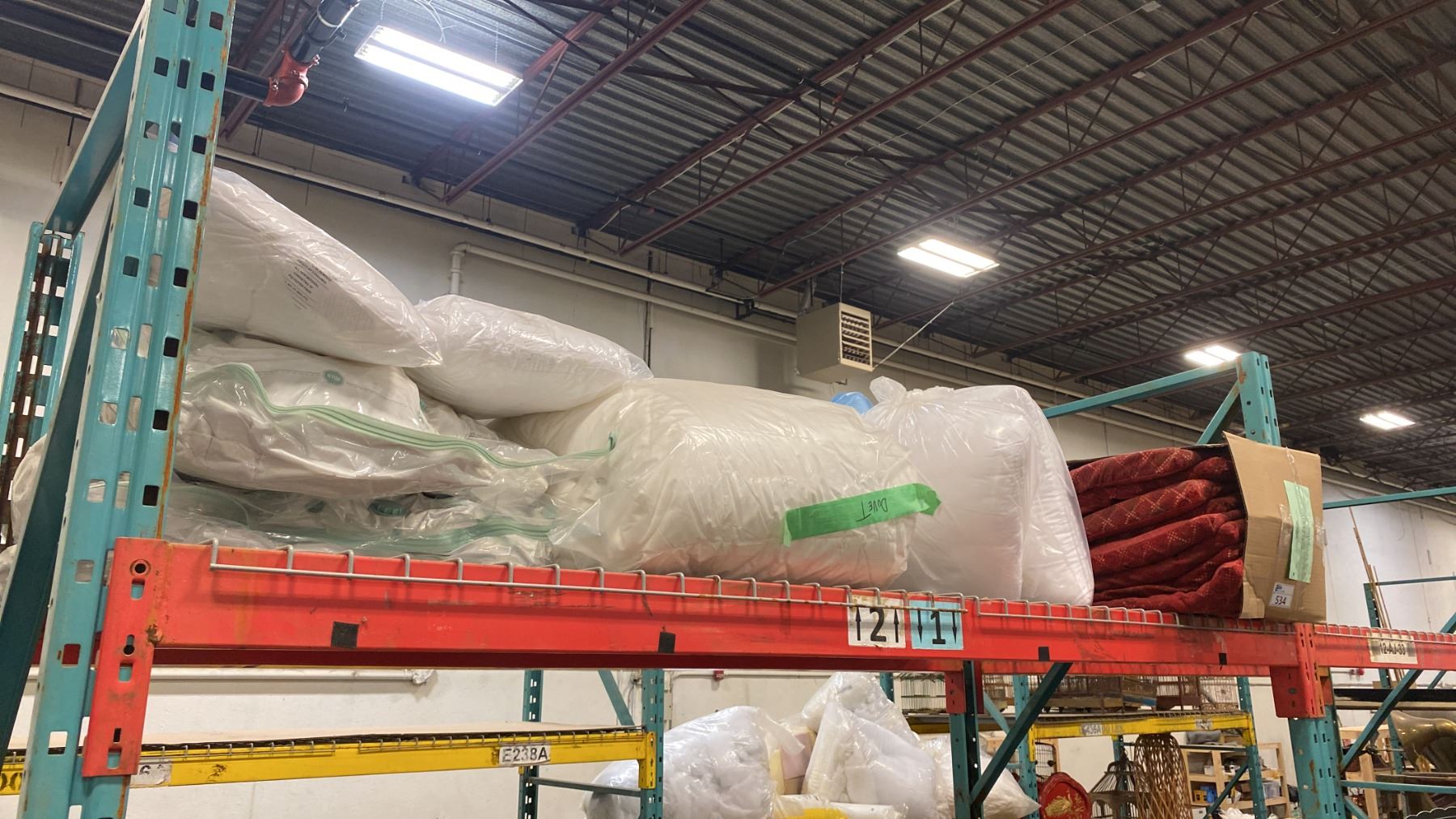 SHELF OF ASSORTED BEDDING ITEMS INCLUDING PILLOWS & DUVET