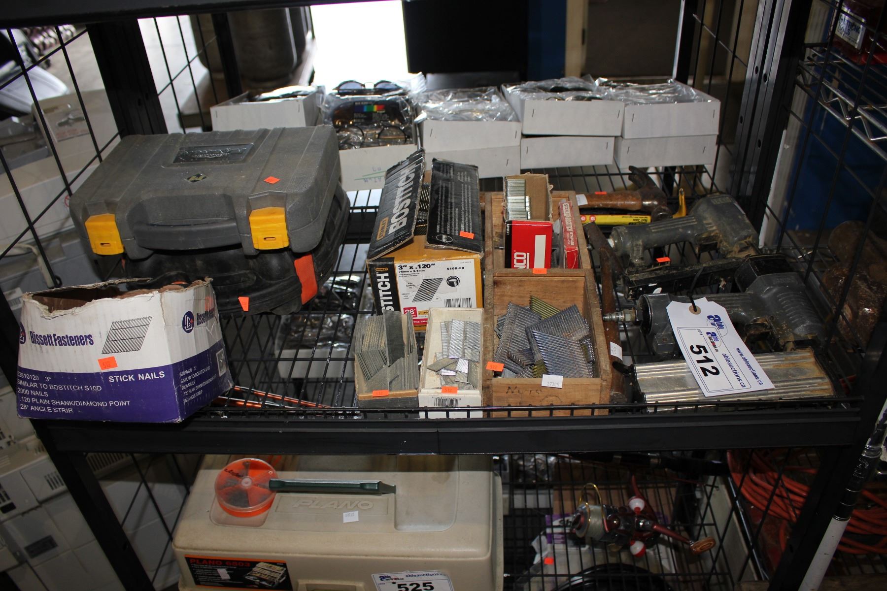 SHELF OF ASSORTED BRAD NAILERS & BRAD NAILS AND MISC TOOLS