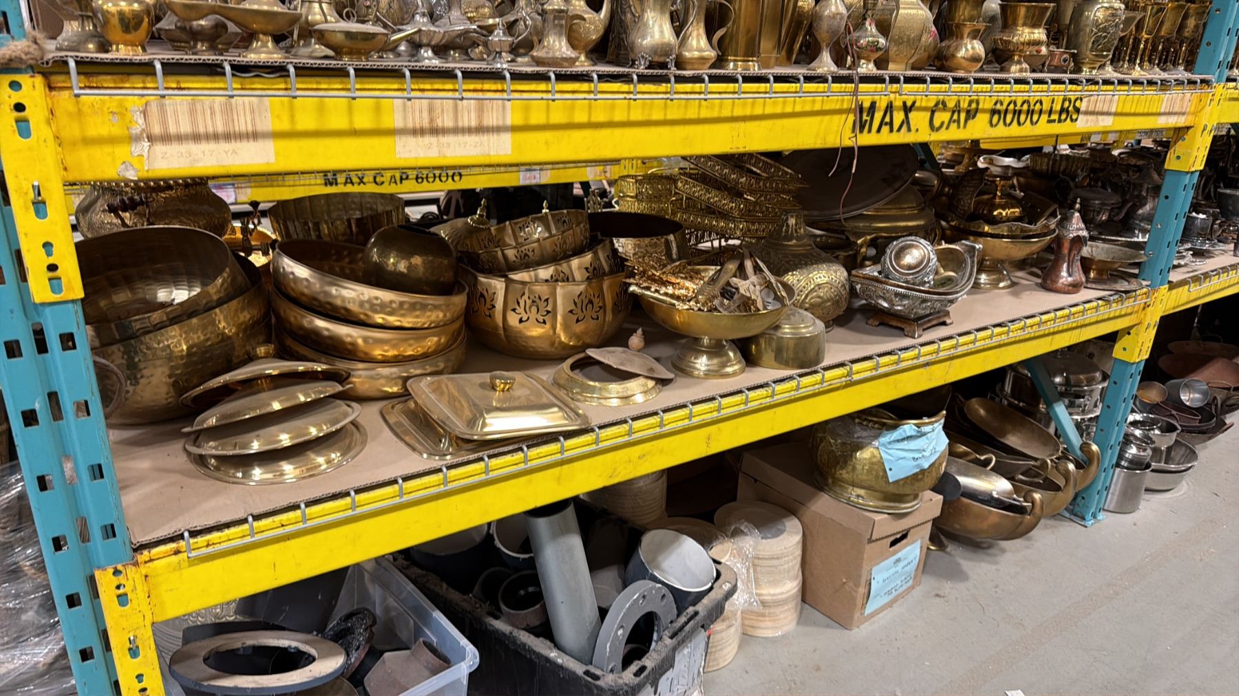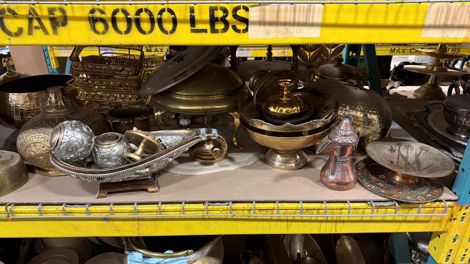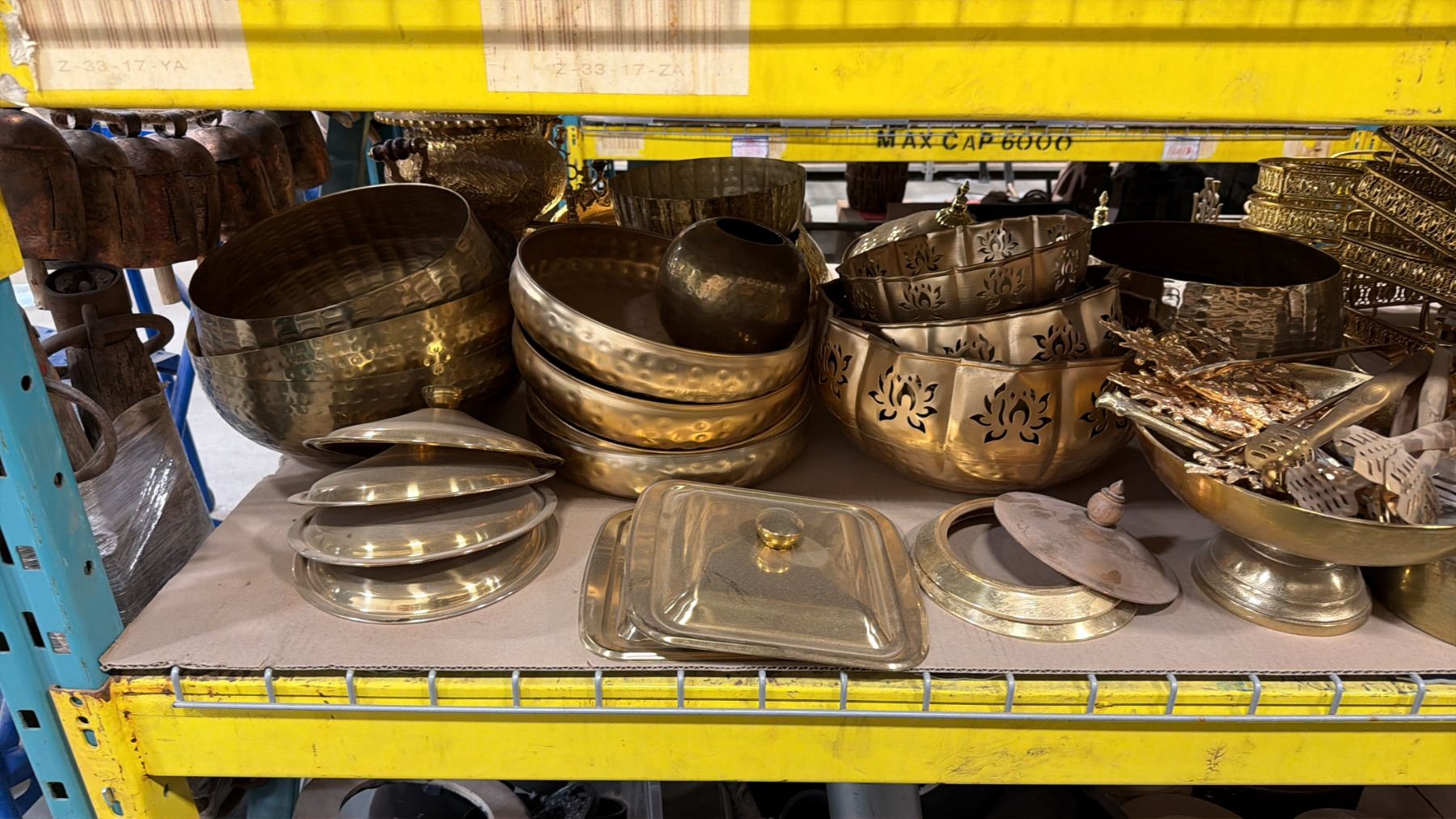 SHELF OF ASSORTED BRASS DECORATIVE BOWLS, CLOCHES, BEVERAGE DISPENSERS, FONDUE POT STANDS, SERVING UTENSILS & MORE