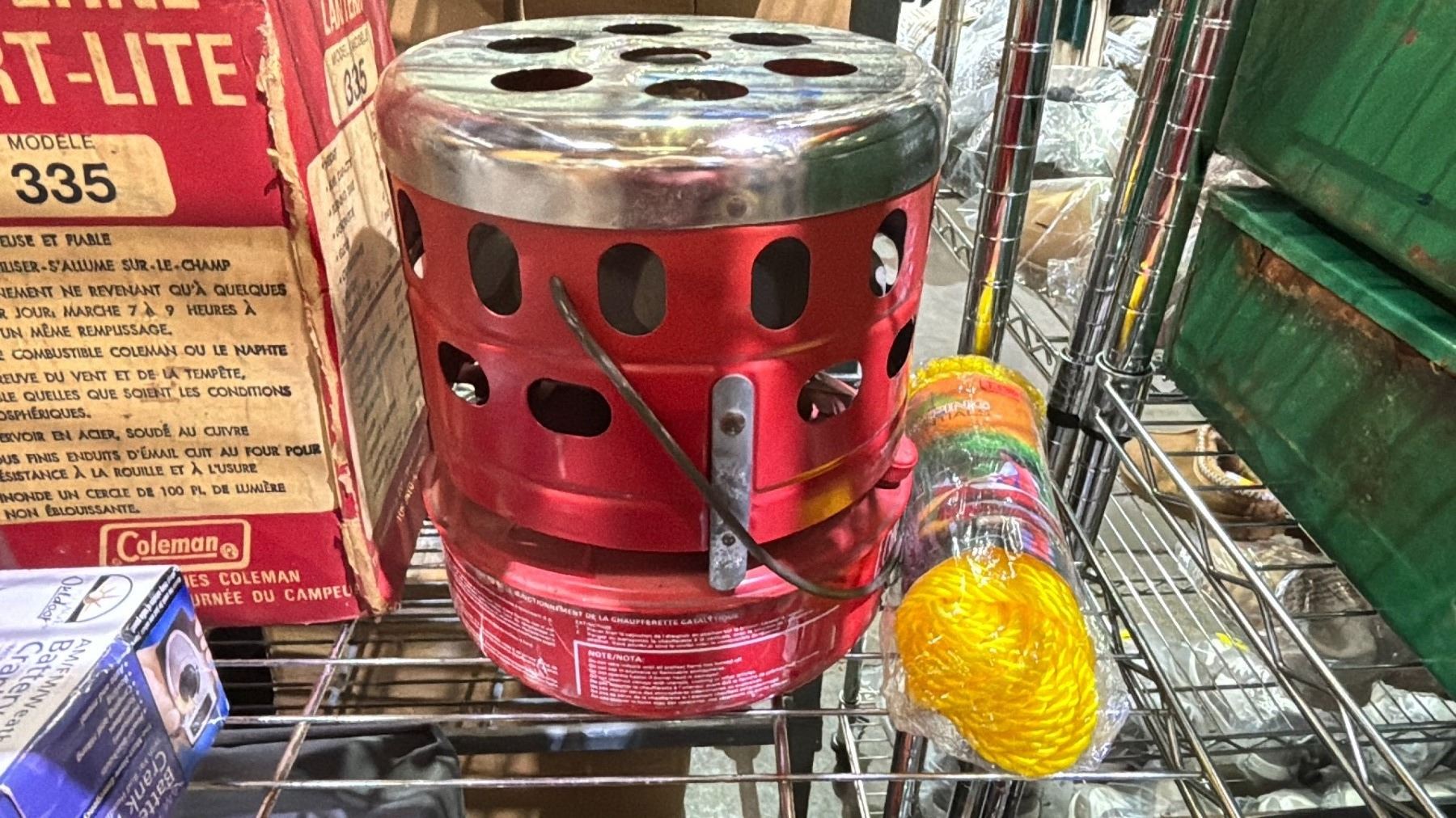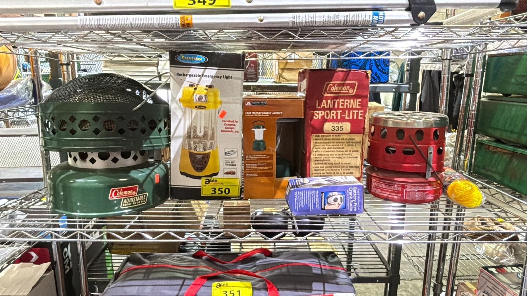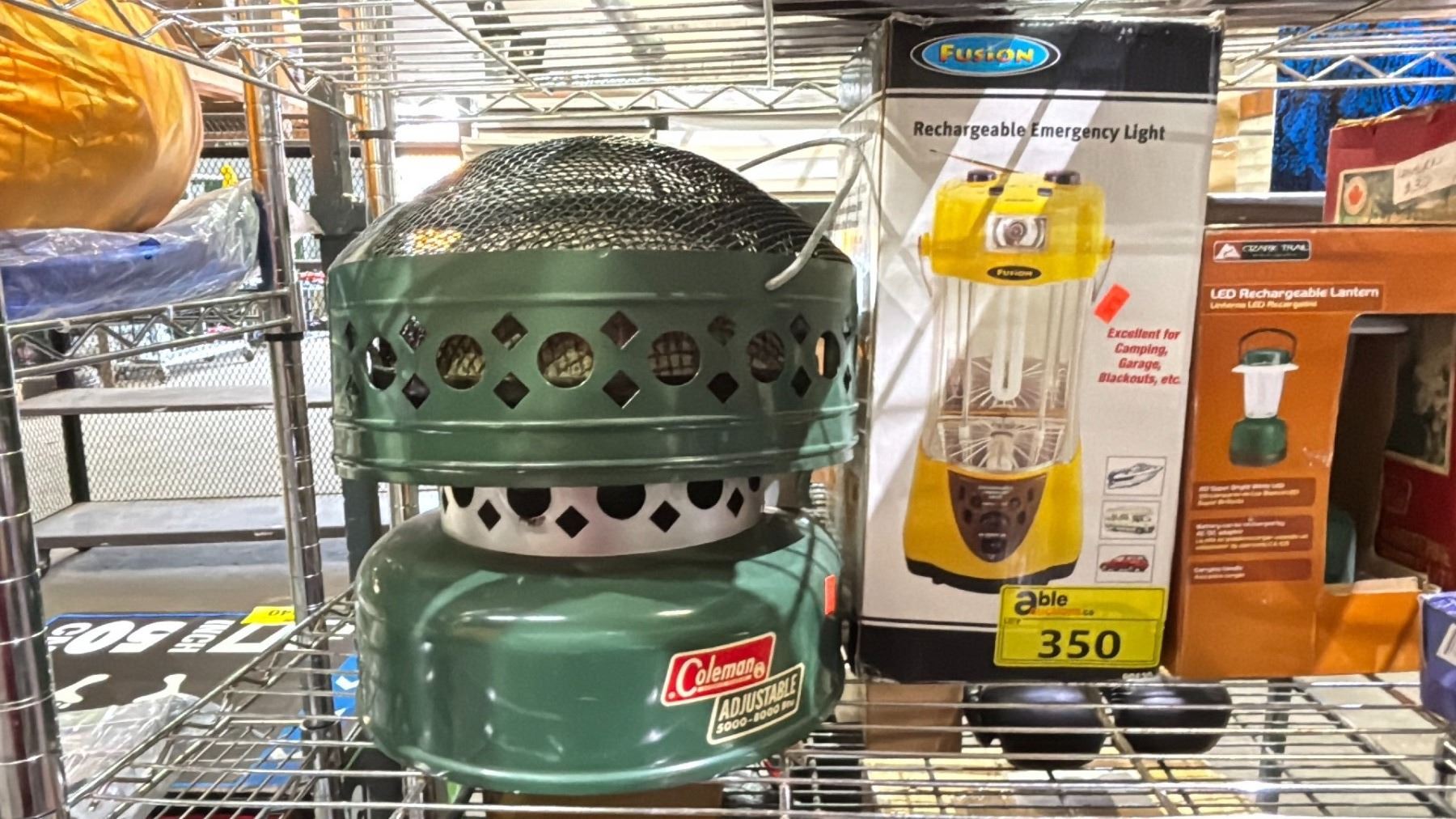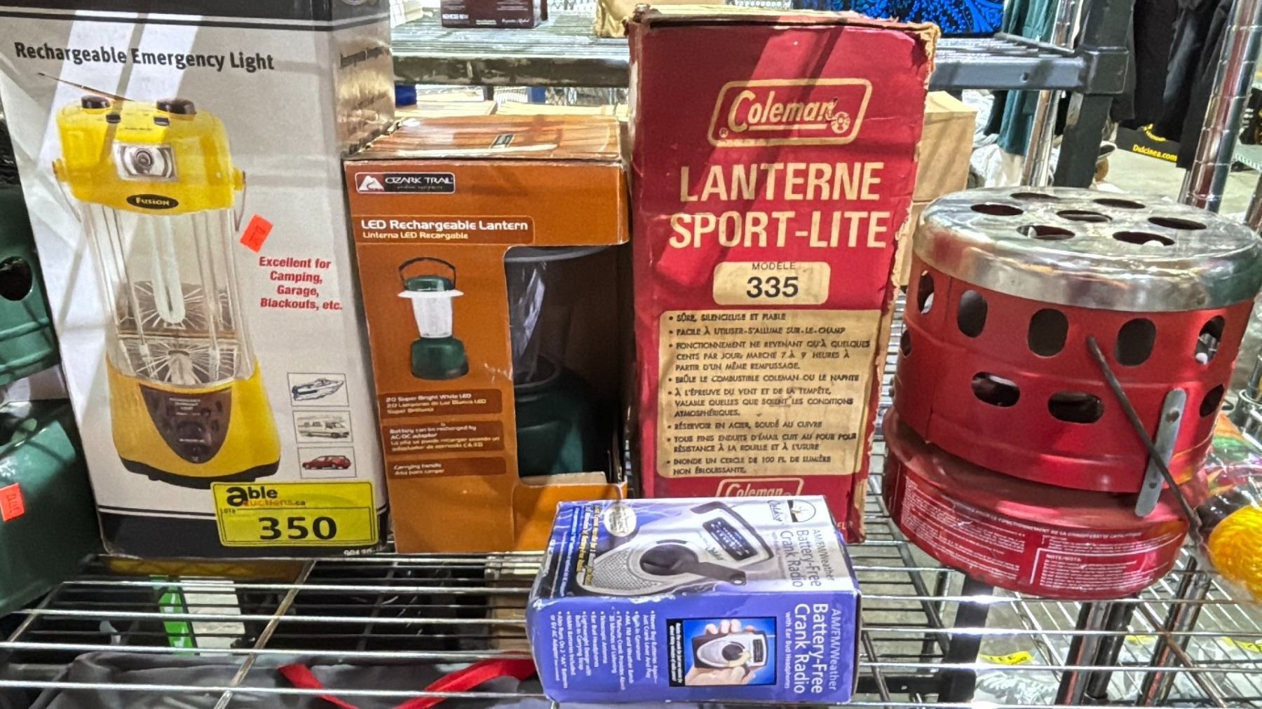 SHELF OF ASSORTED CAMPING LANTERNS, HEATER, ROPE & RADIO