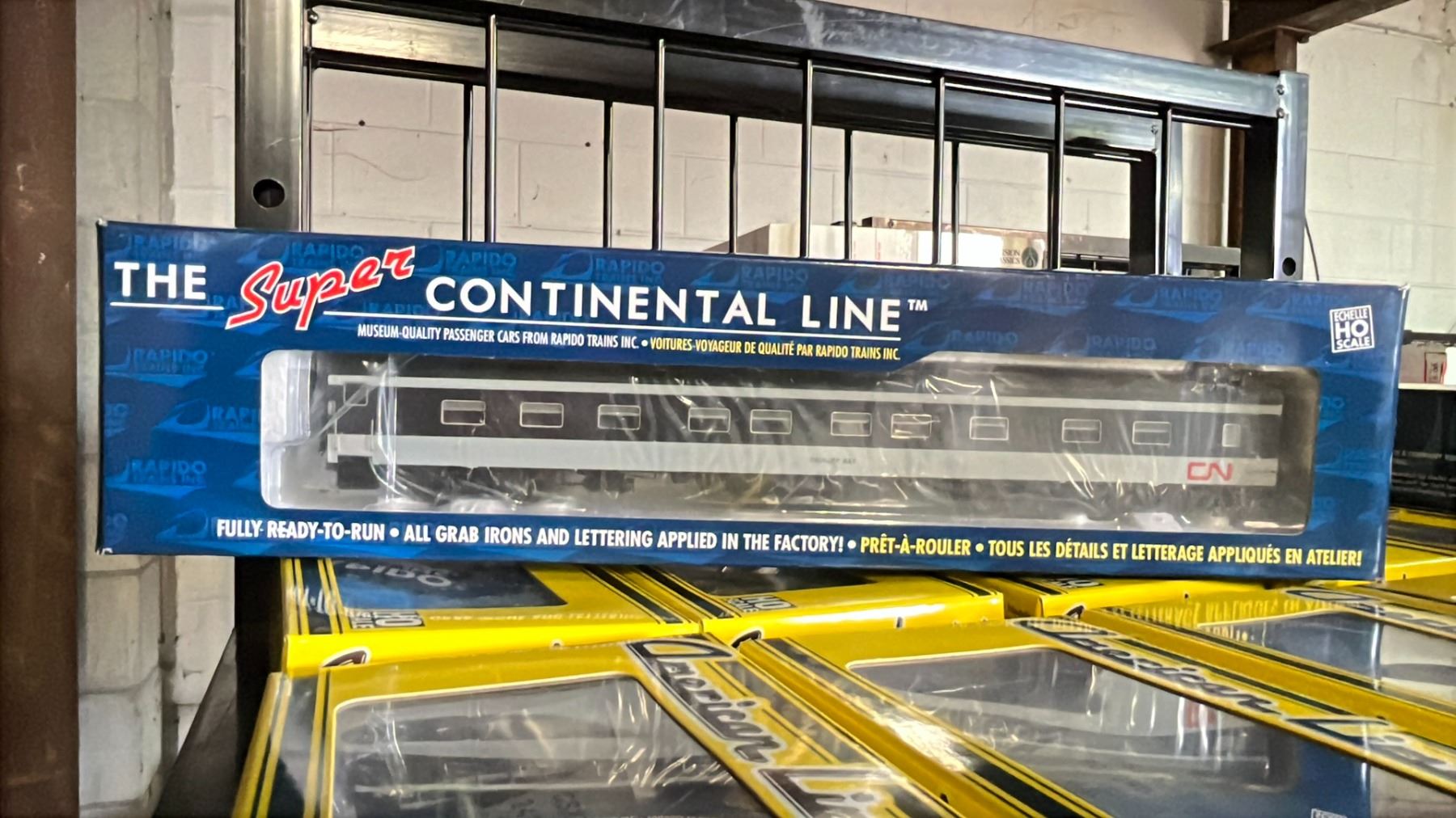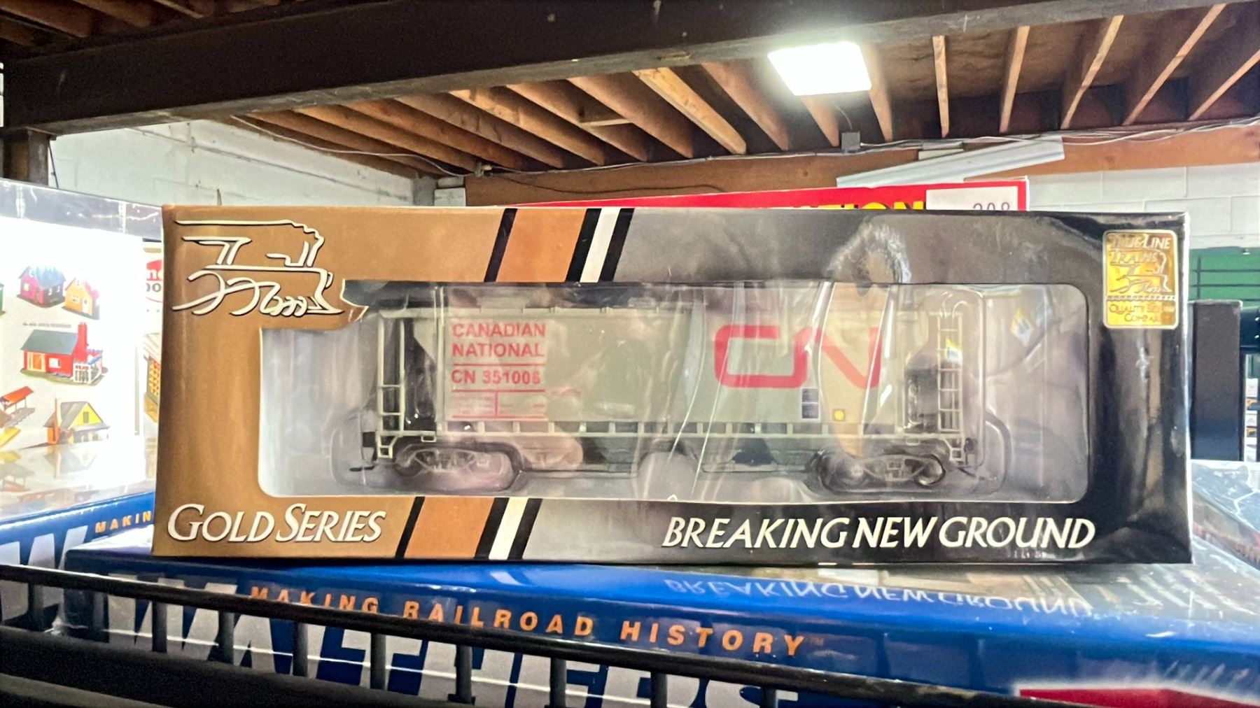 SHELF OF ASSORTED CANADIAN NATIONAL + CANADIAN PACIFIC HO SCALE MODEL TRAINS - TRUELINE TRAINS GOLD SERIES, RAPIDO TRAINS INC & THE SUPER CONTINENTAL