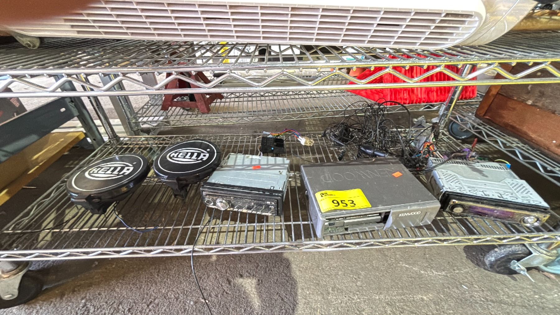 SHELF OF ASSORTED CAR AUDIO ITEMS INCLUDING; KENWOOD CD AUTO CHANGER, JVC STEREO, HELLA SUBWOOFER SPEAKERS & MORE
