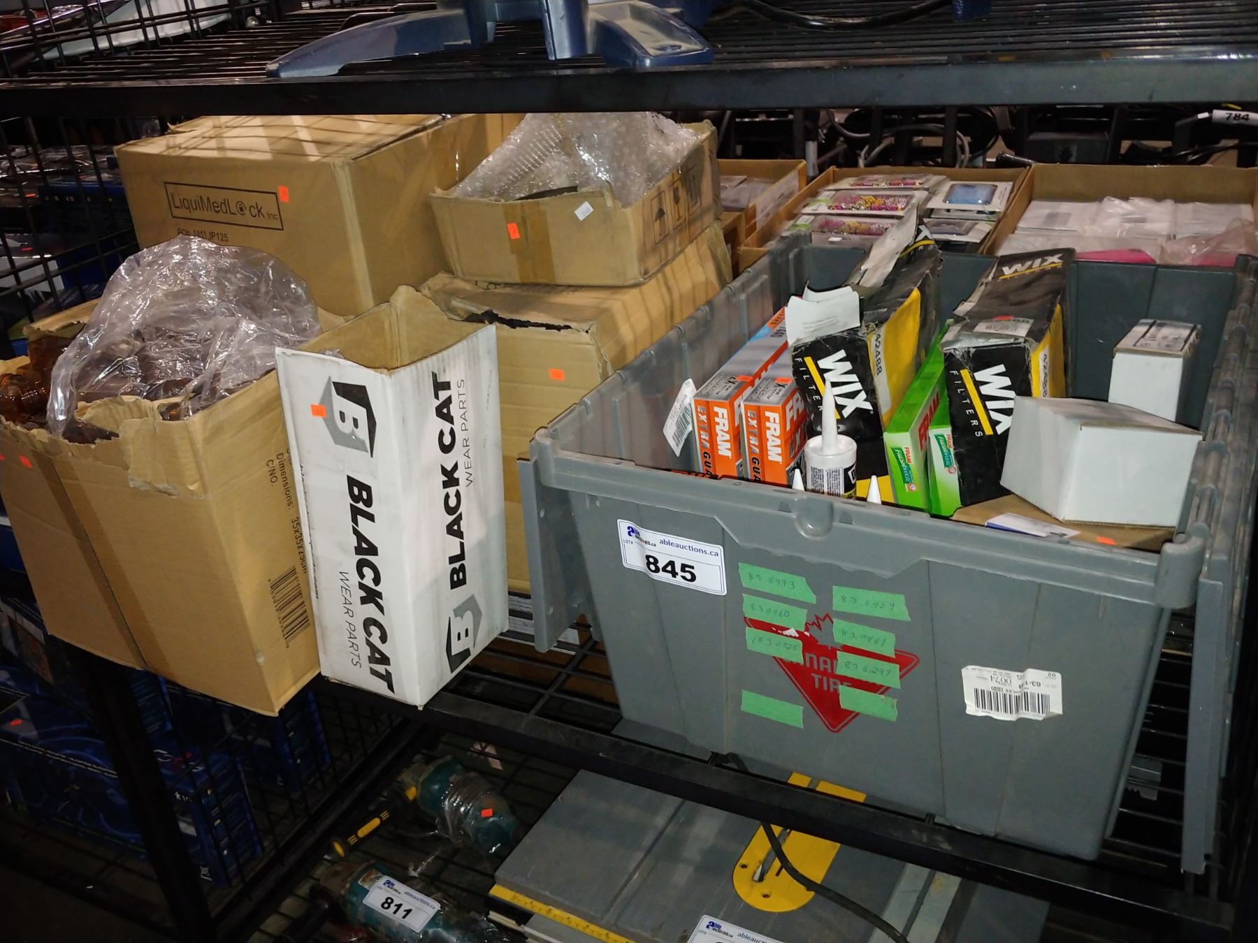 SHELF OF ASSORTED CAR FILTERS & PARTS, PLASTIC BOTTLES AND MORE