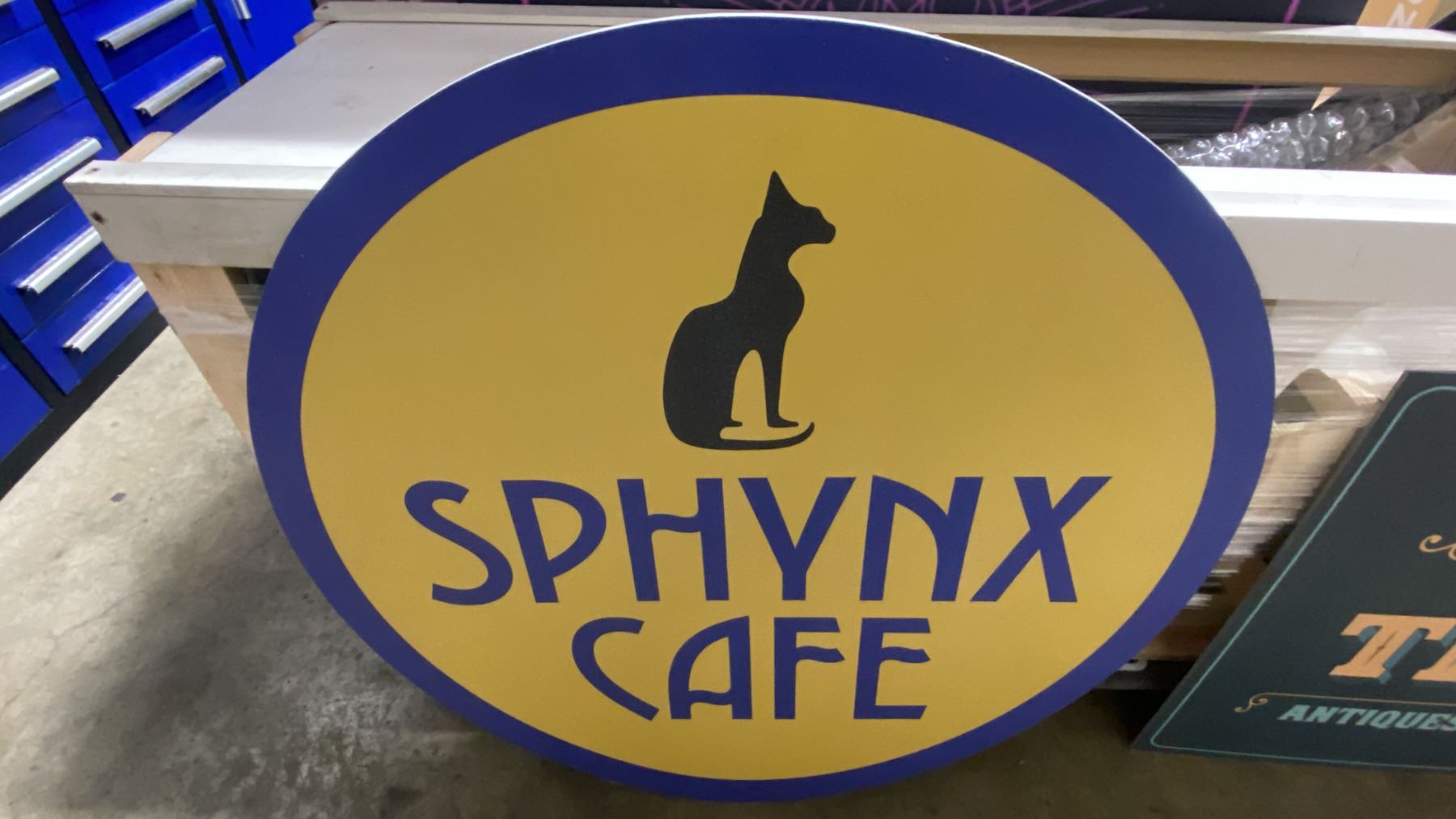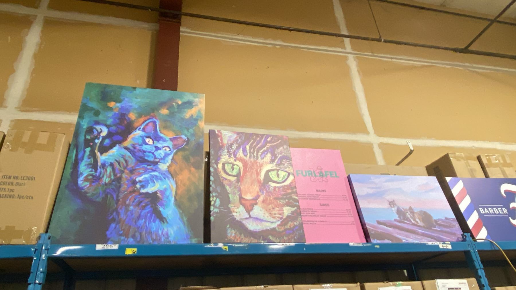 SHELF OF ASSORTED CAT ARTWORK & SIGNS