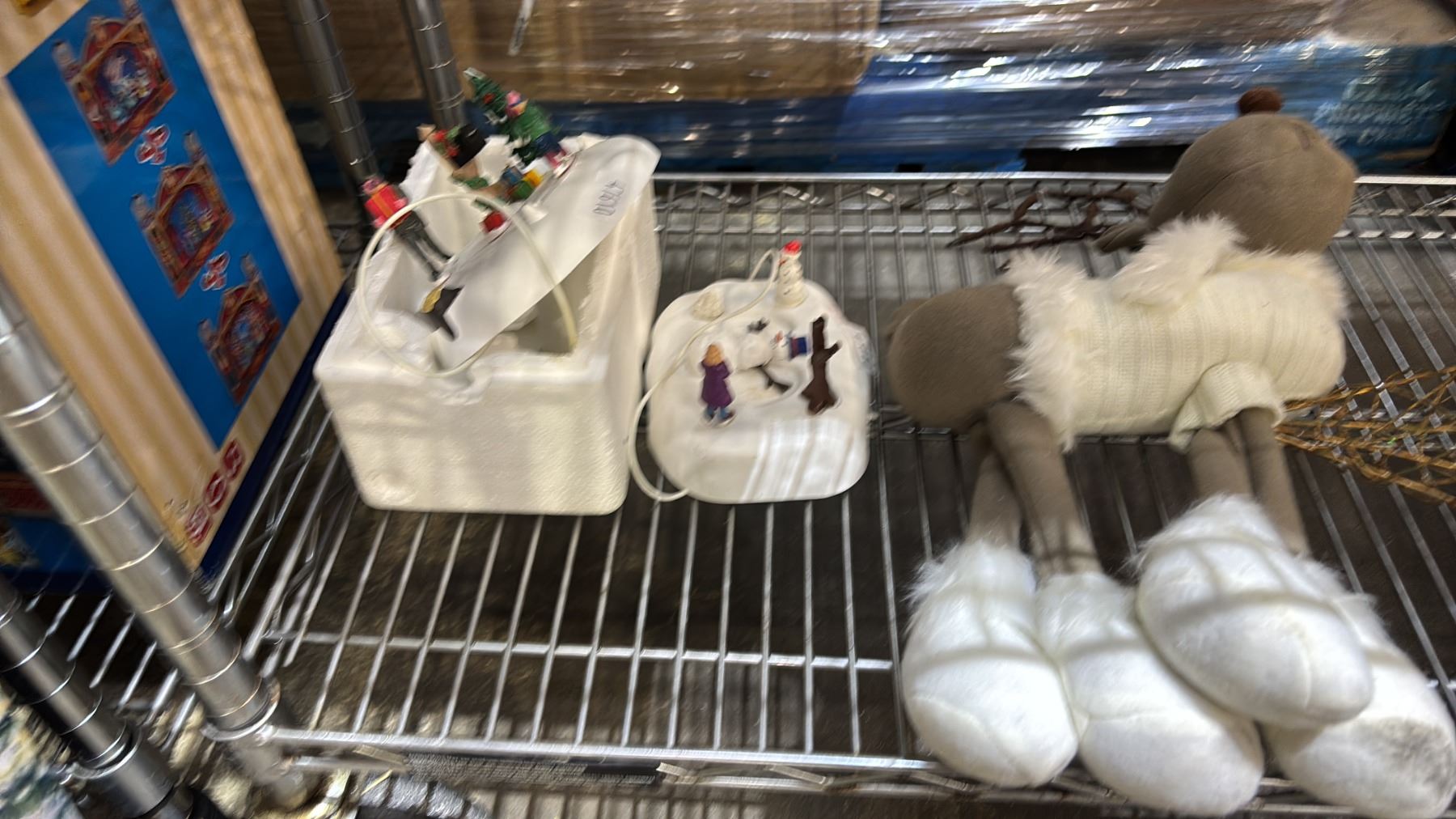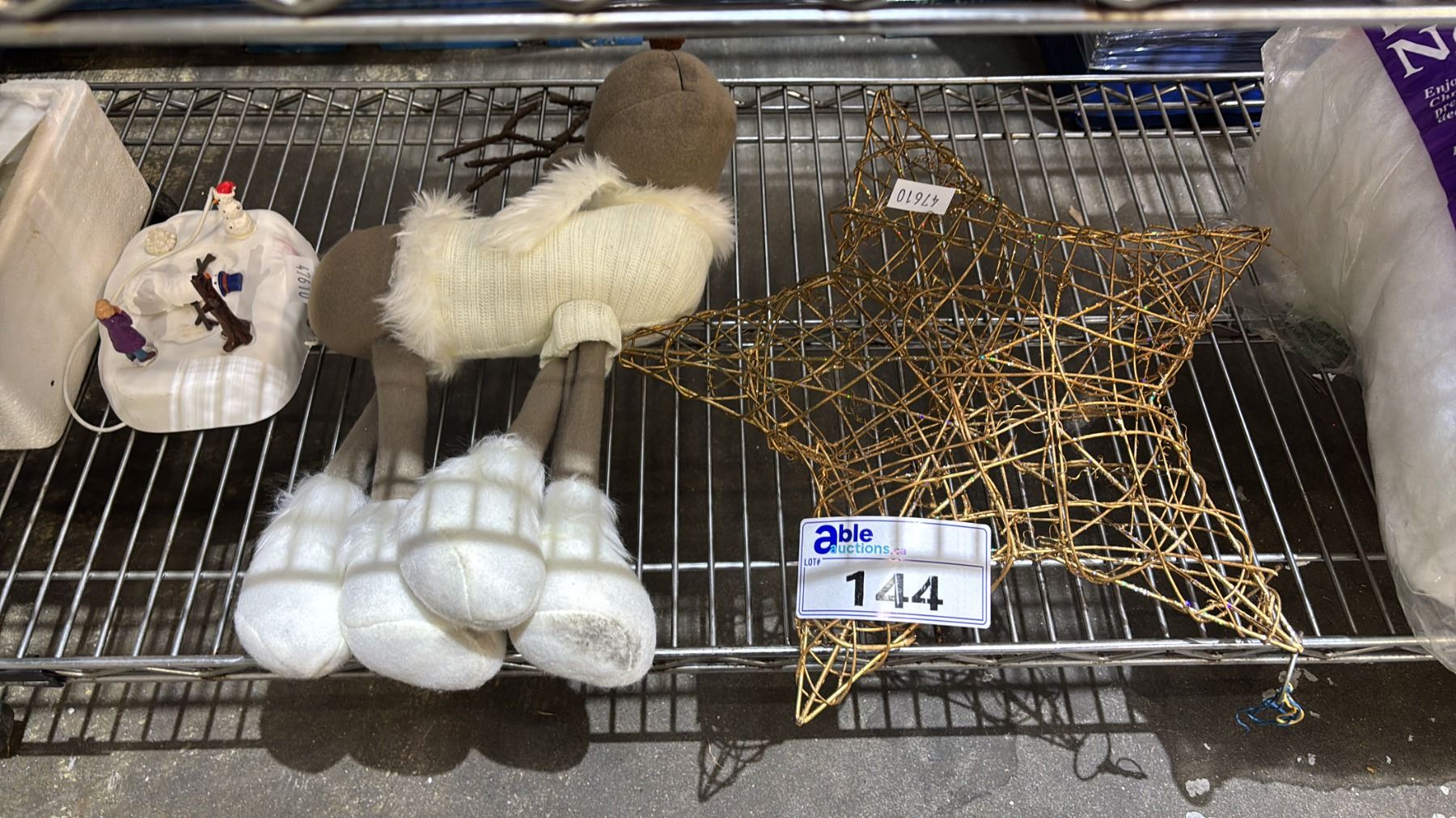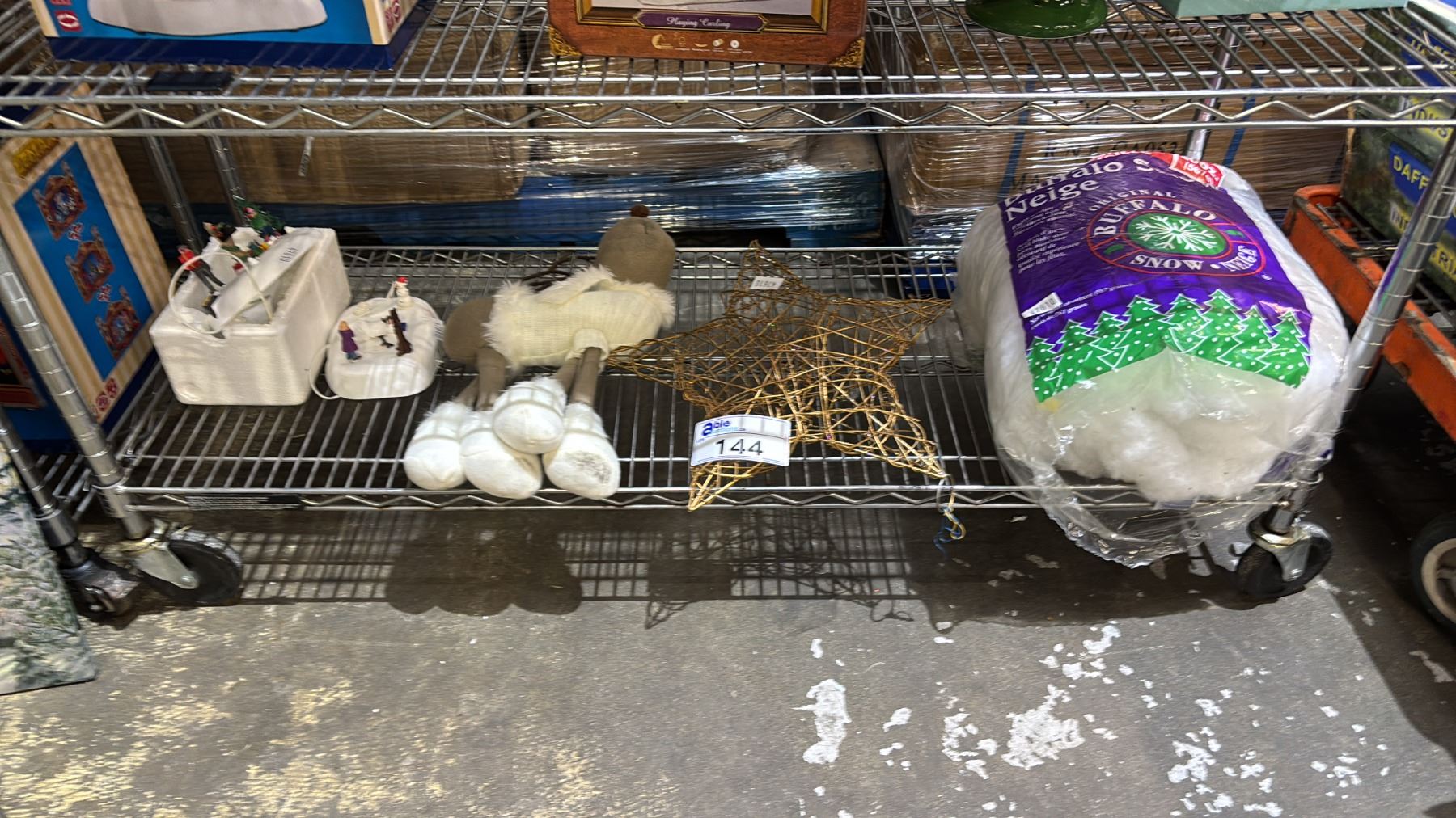 SHELF OF ASSORTED CHRISTMAS DECOR INCLUDING; FAKE SNOW, REINDEER FIGURE, TREE TOPPER & MORE