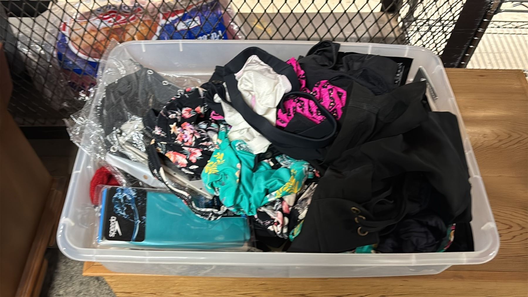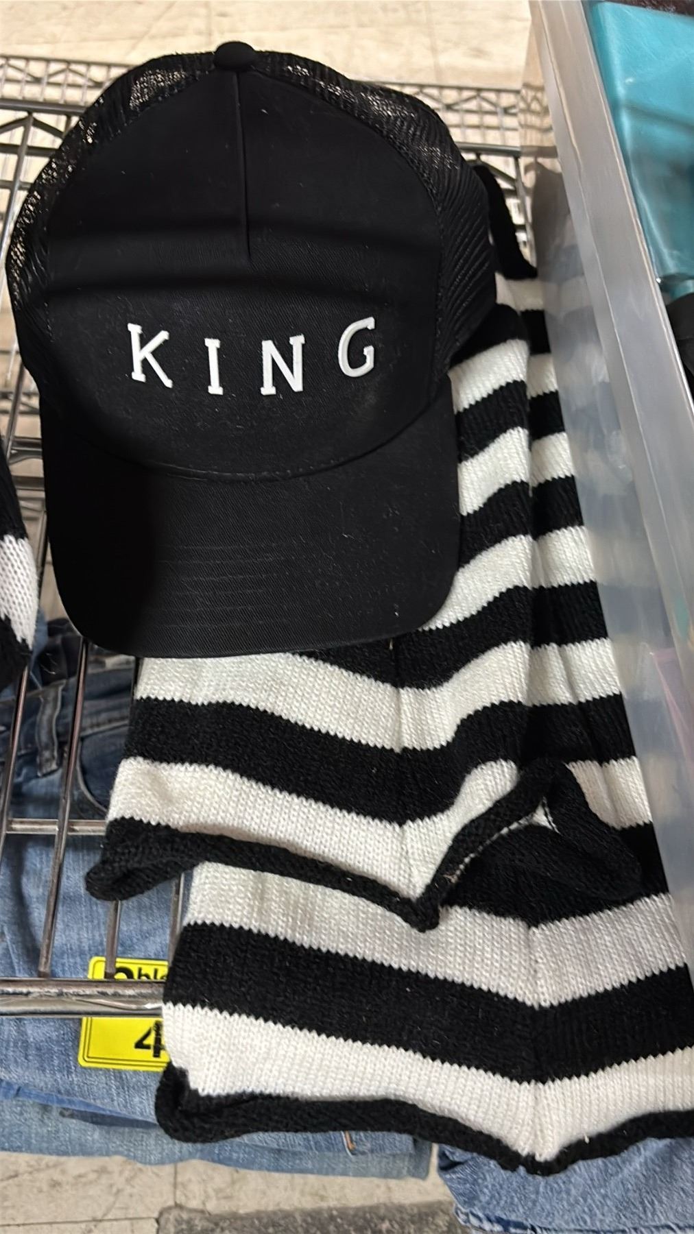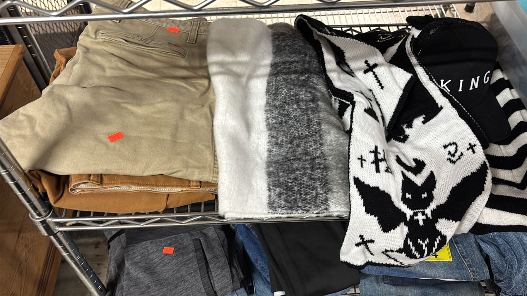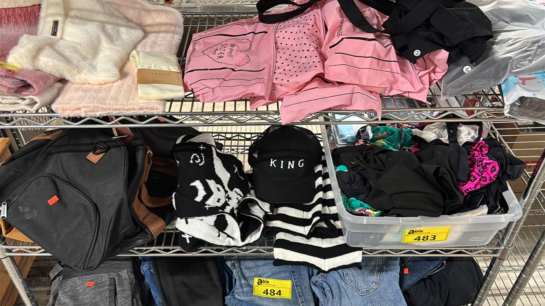 SHELF OF ASSORTED CLOTHING, BAG, HAT & MORE