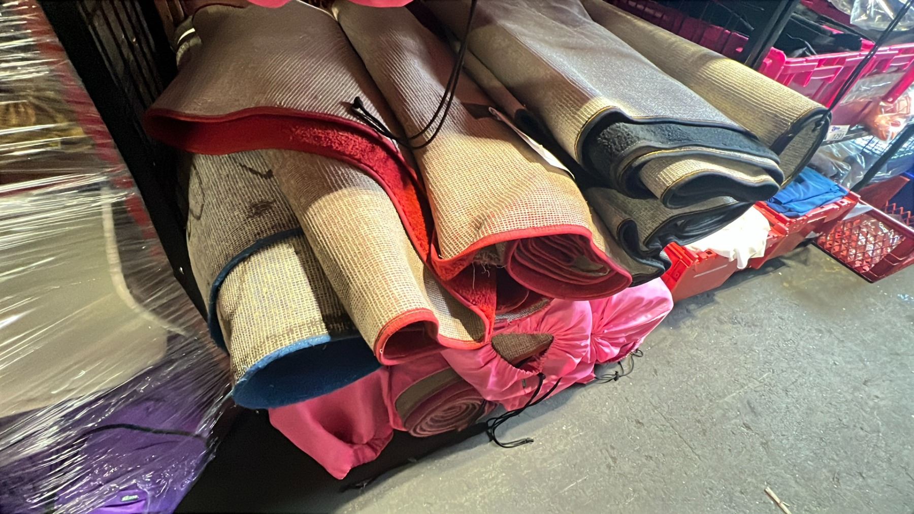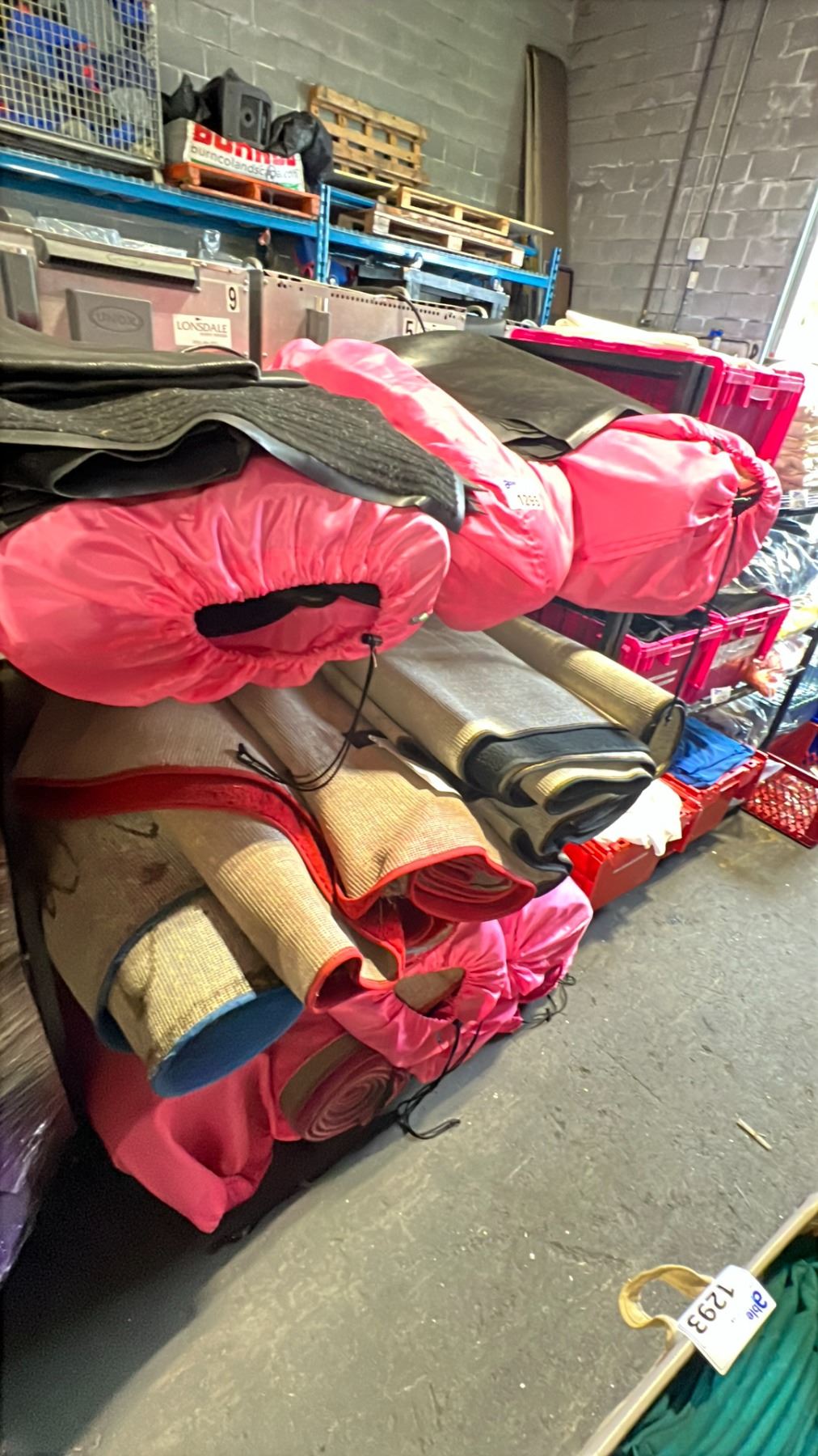SHELF OF ASSORTED COMMERCIAL EVENT MATS / AREA RUGS, SOME IN BAGS *SHELF NOT INCLUDED*