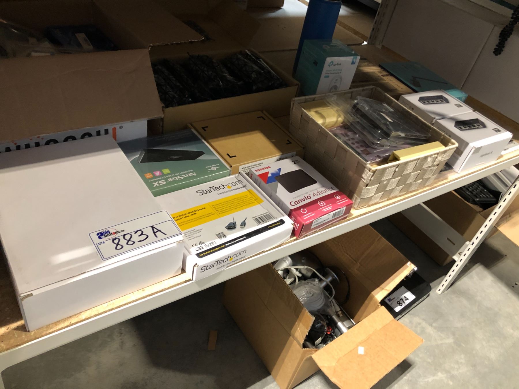 SHELF OF ASSORTED COMPUTER COMPONENTS, SWITCHES, & HARD DRIVE PORTABLE STORAGE HOLDERS