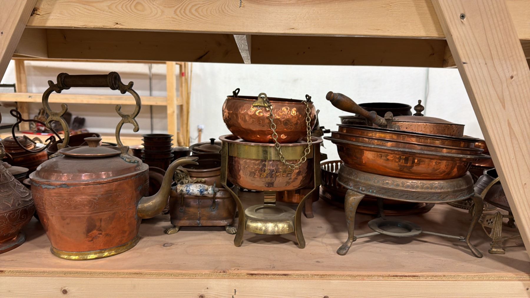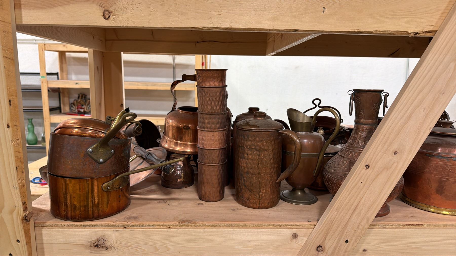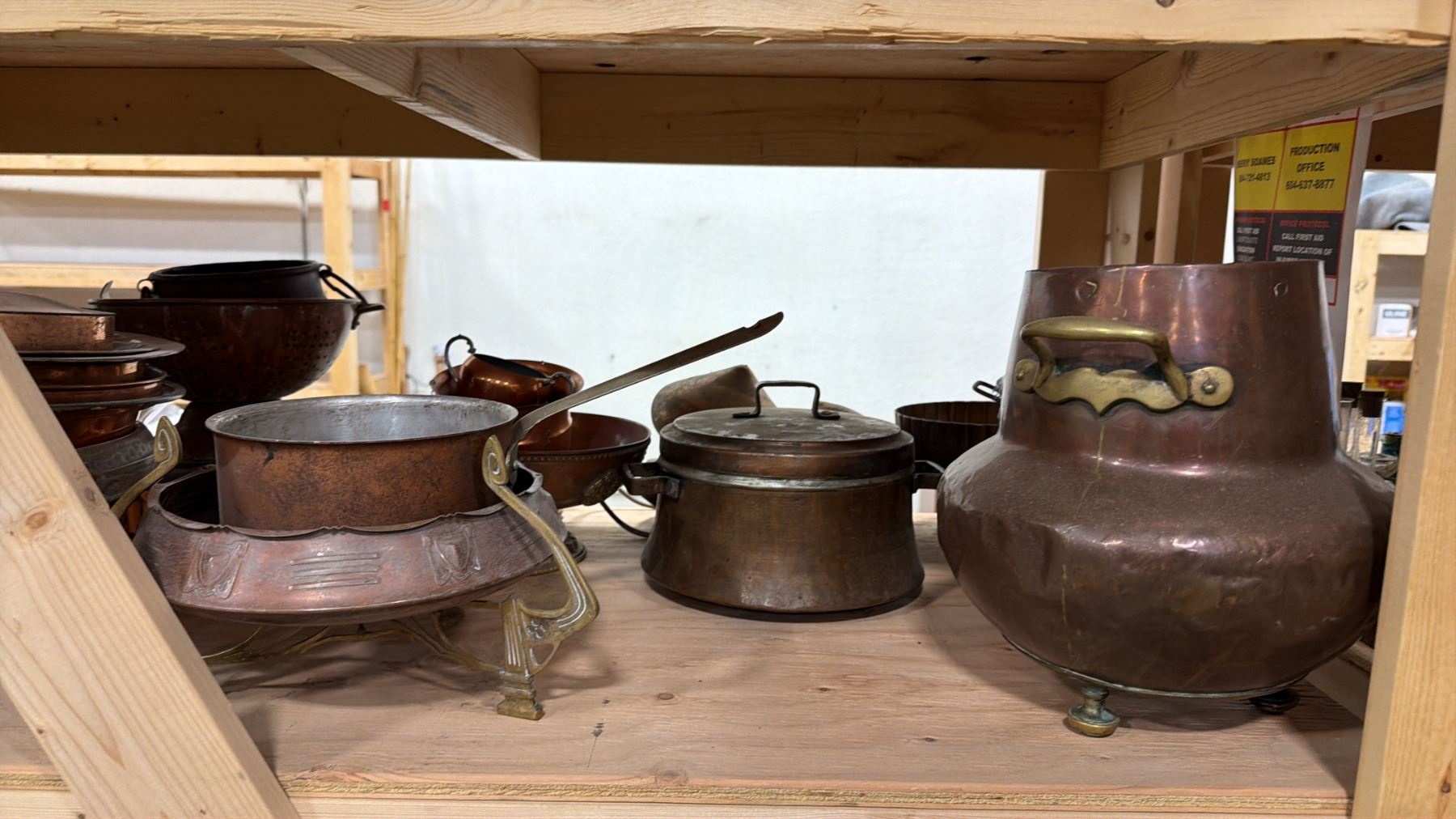SHELF OF ASSORTED COPPER PLATES, BOWLS, CUPS & DECOR ITEMS