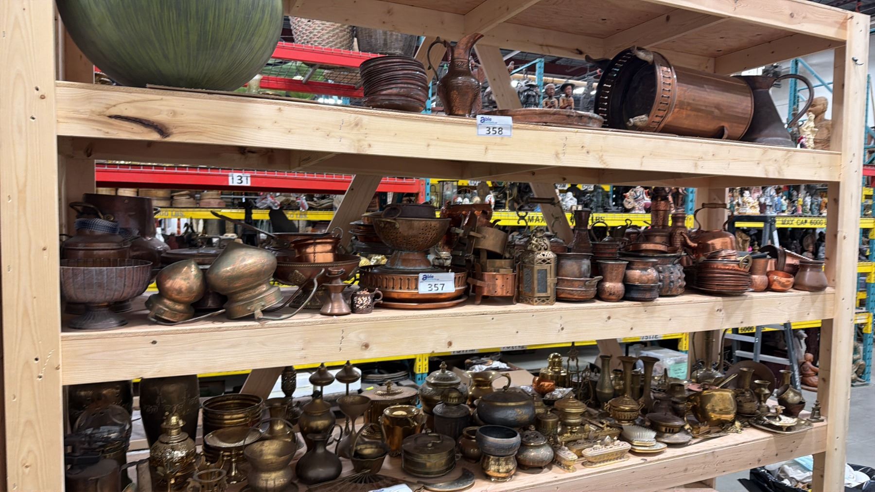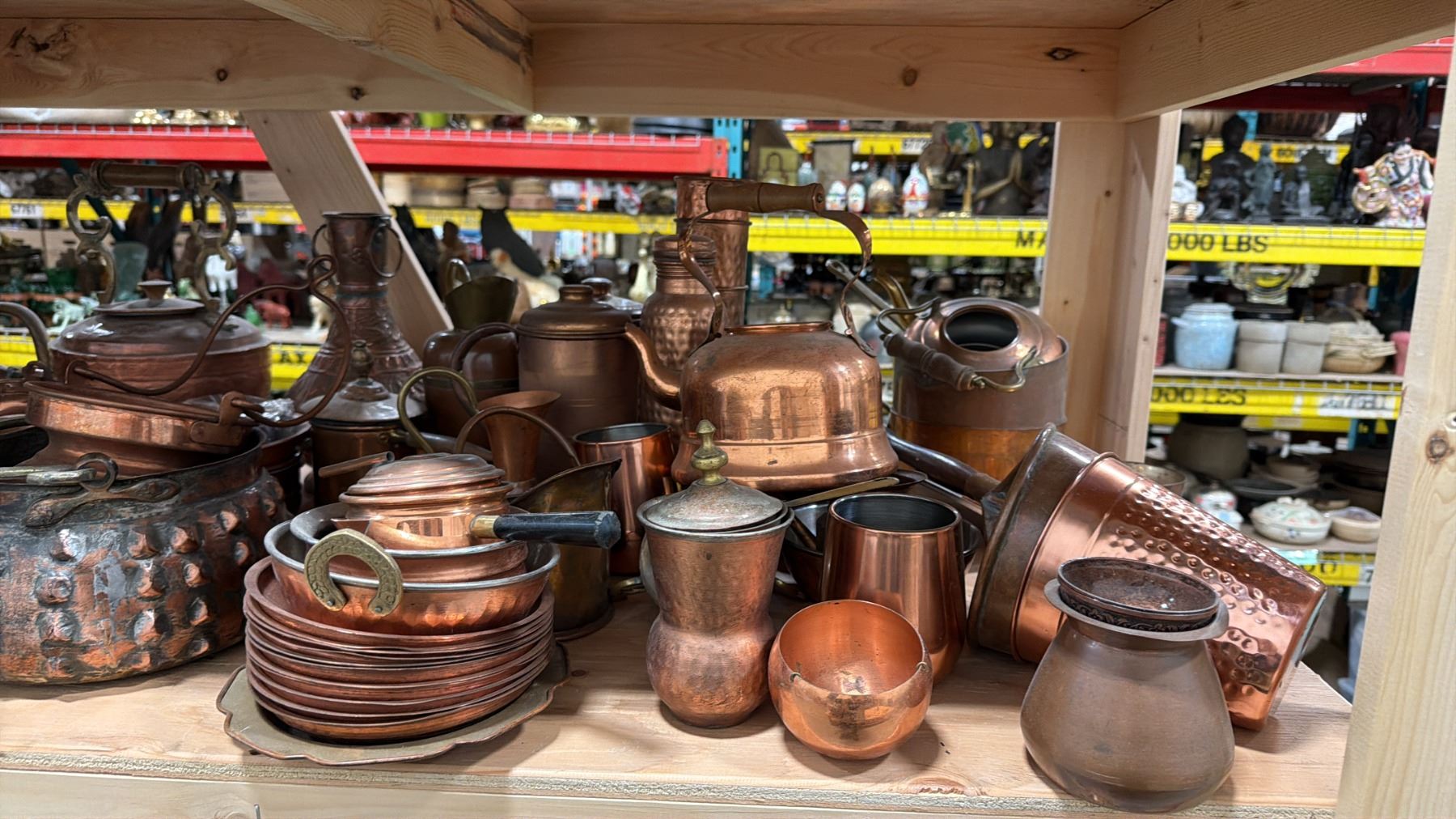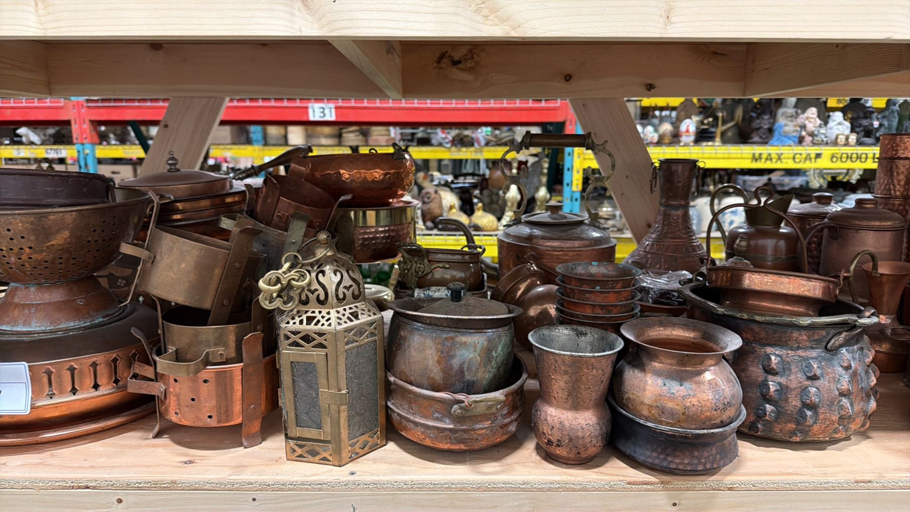 SHELF OF ASSORTED COPPER PLATES, BOWLS, CUPS & DECOR ITEMS