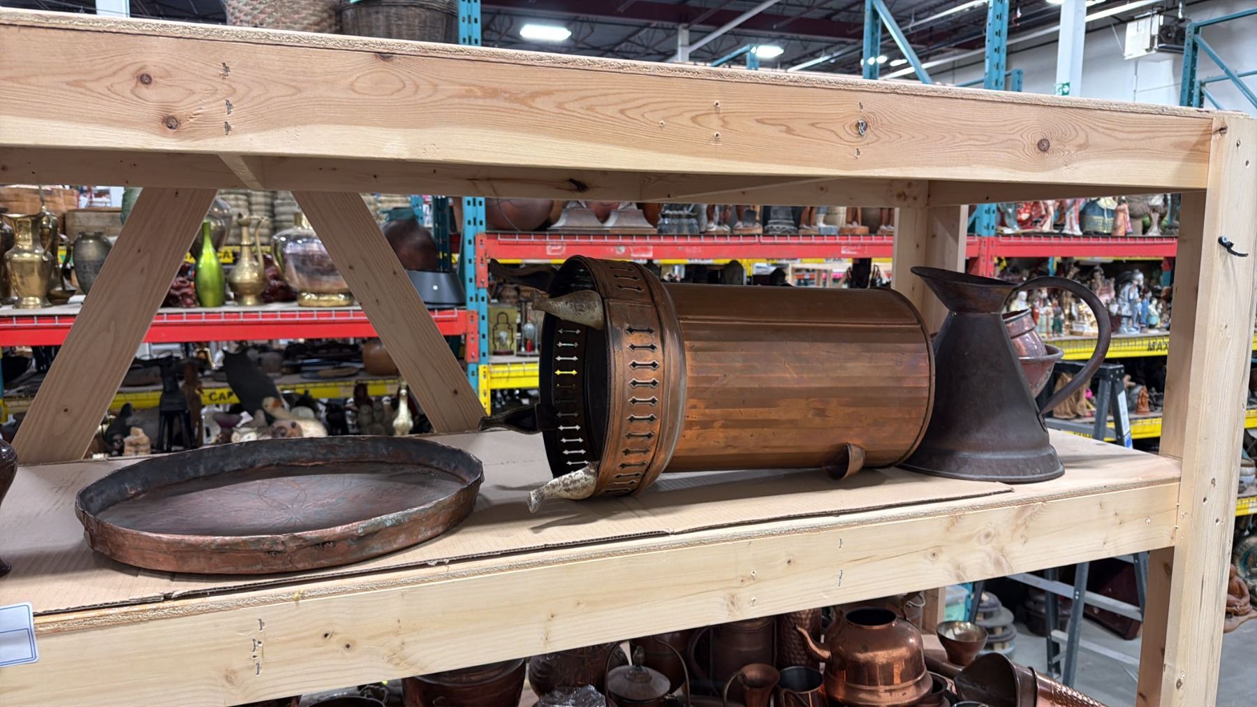 SHELF OF ASSORTED COPPER PLATES, JUGS, BOWLS & MORE