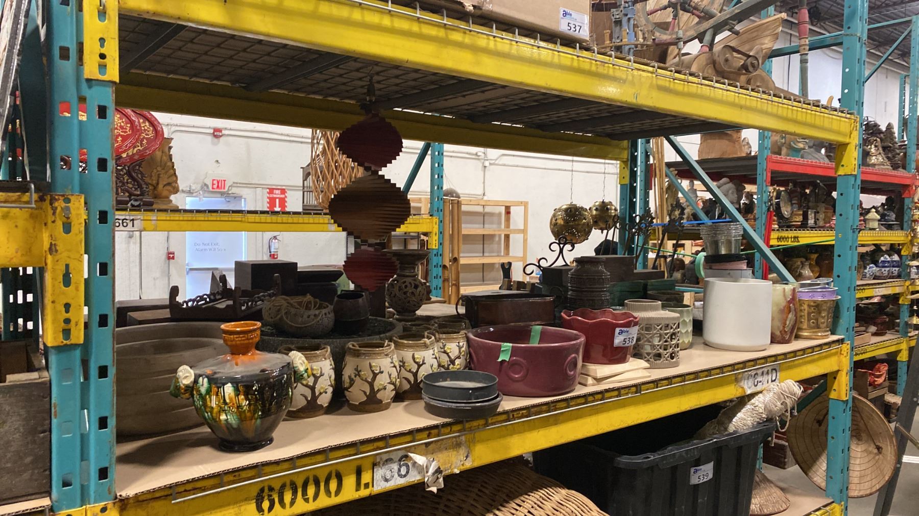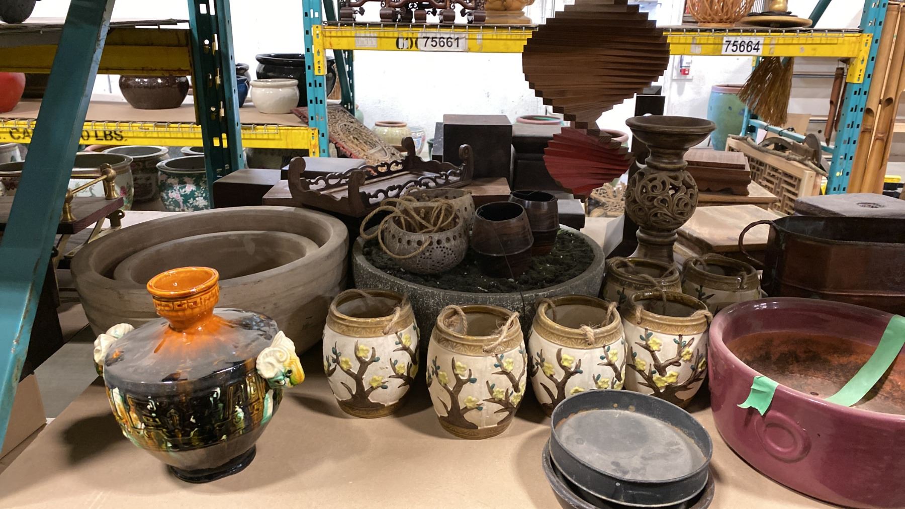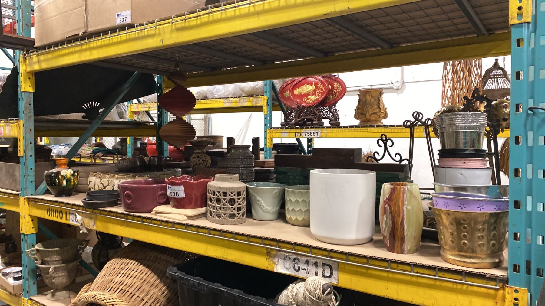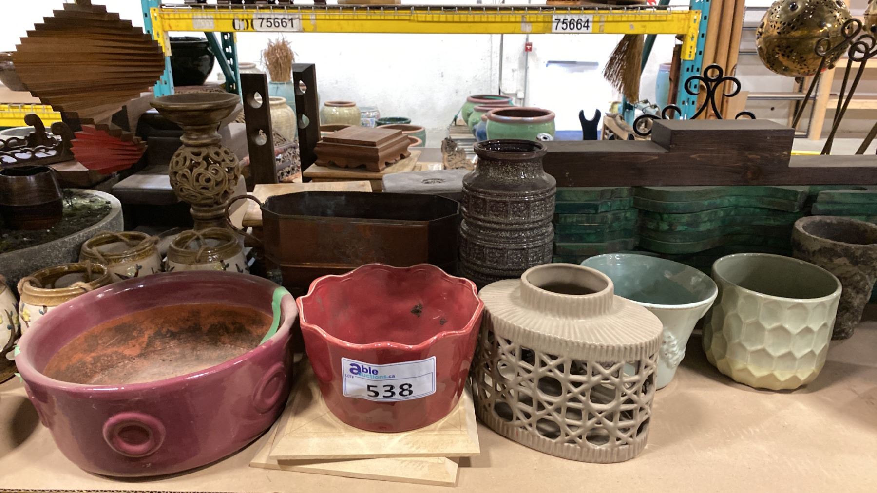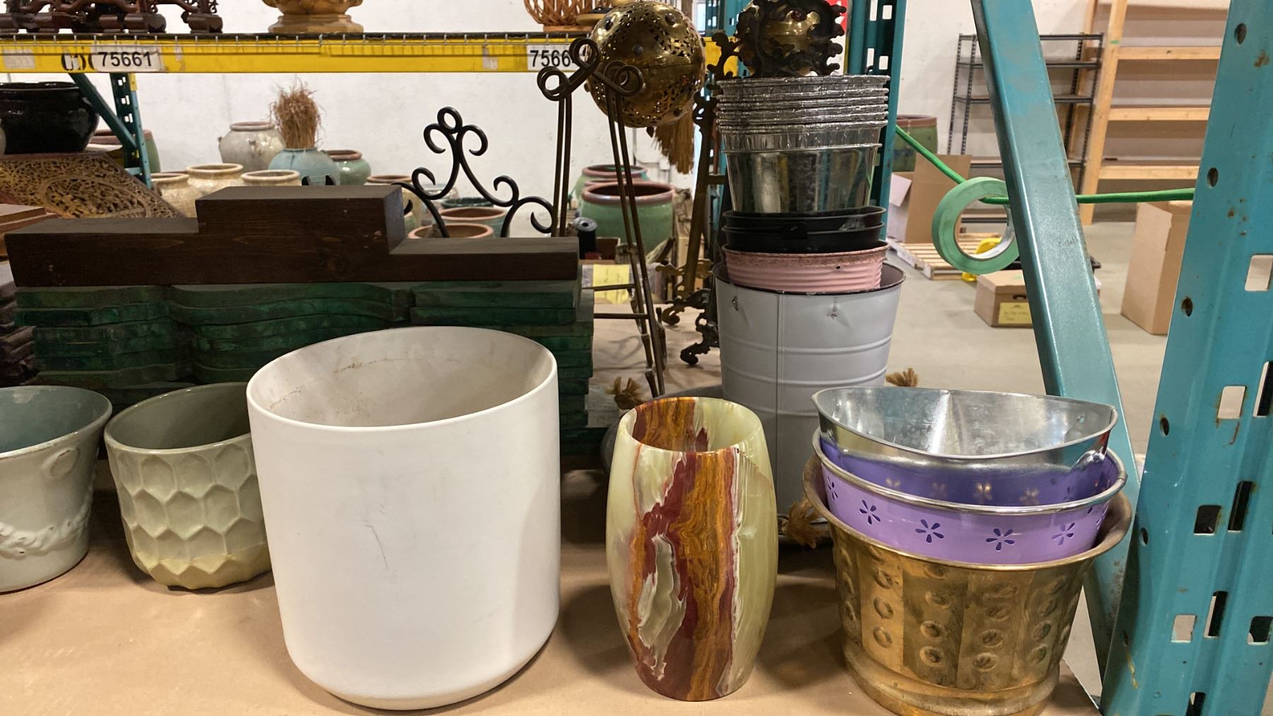 SHELF OF ASSORTED DECOR ITEMS, VASES, FLOWER POTS & STANDS