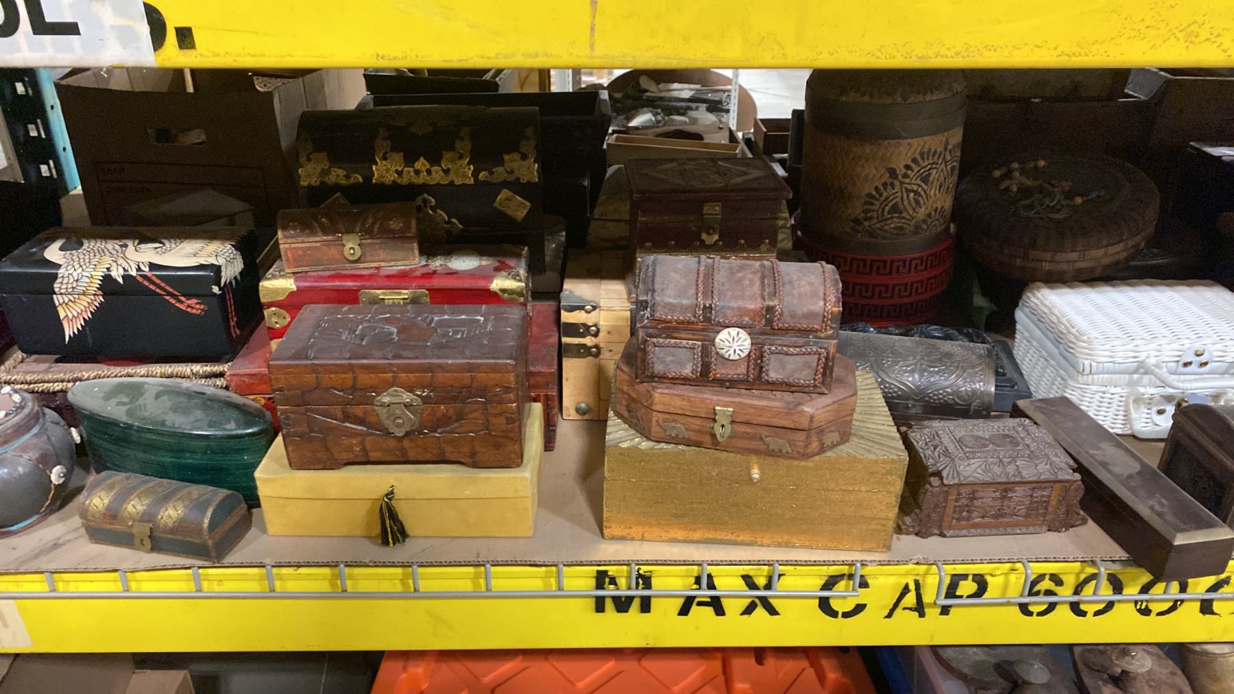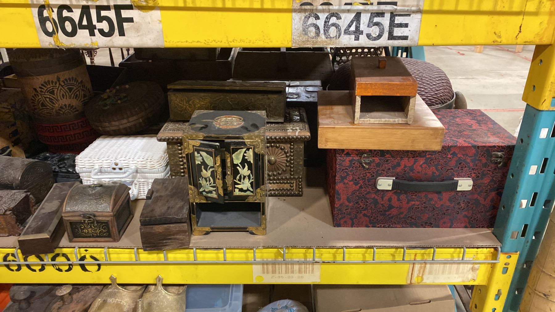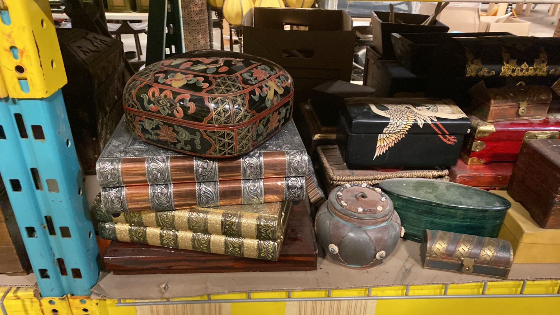 SHELF OF ASSORTED DECORATIVE BOXES, JEWELRY BOXES & BASKETS