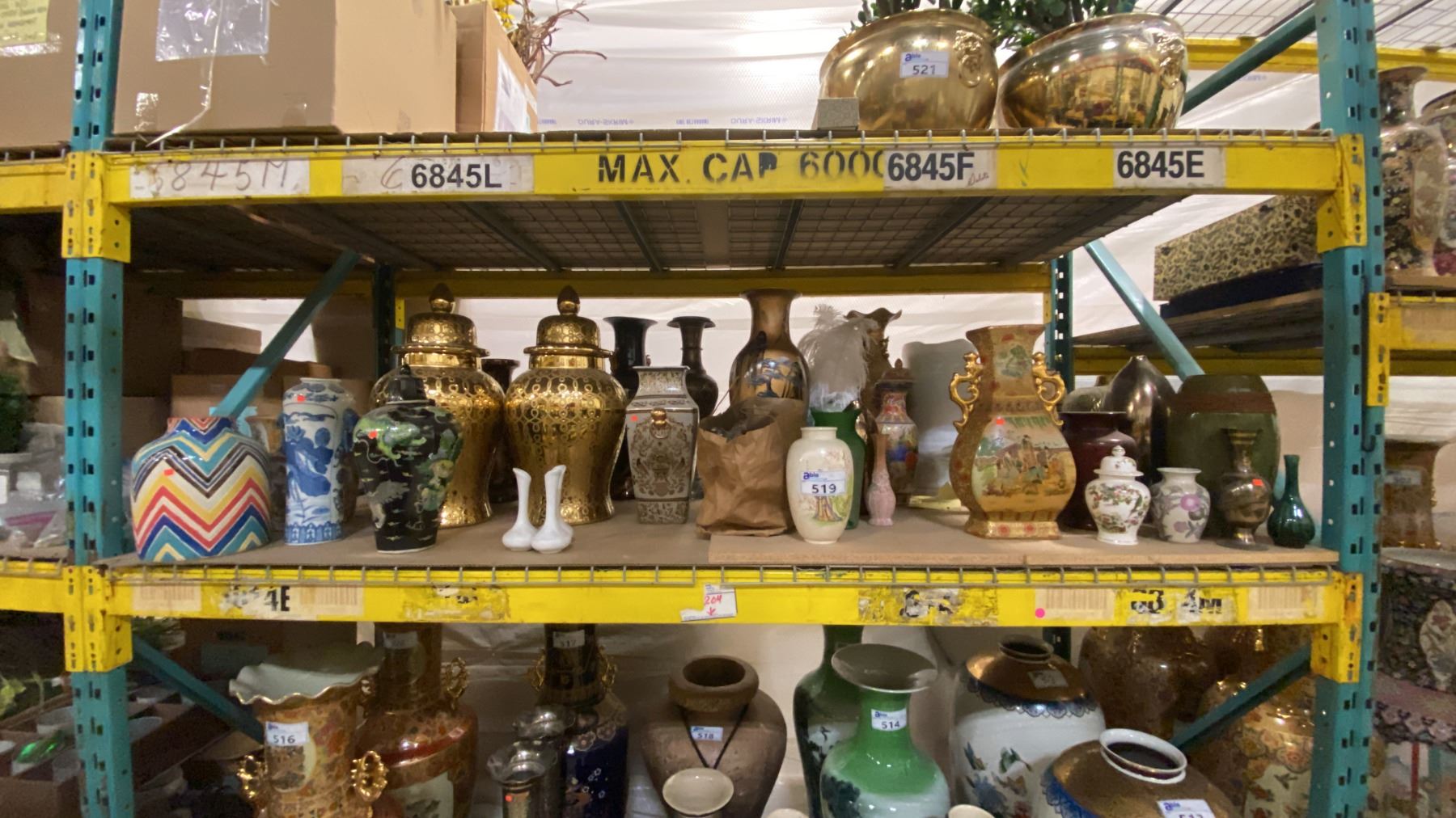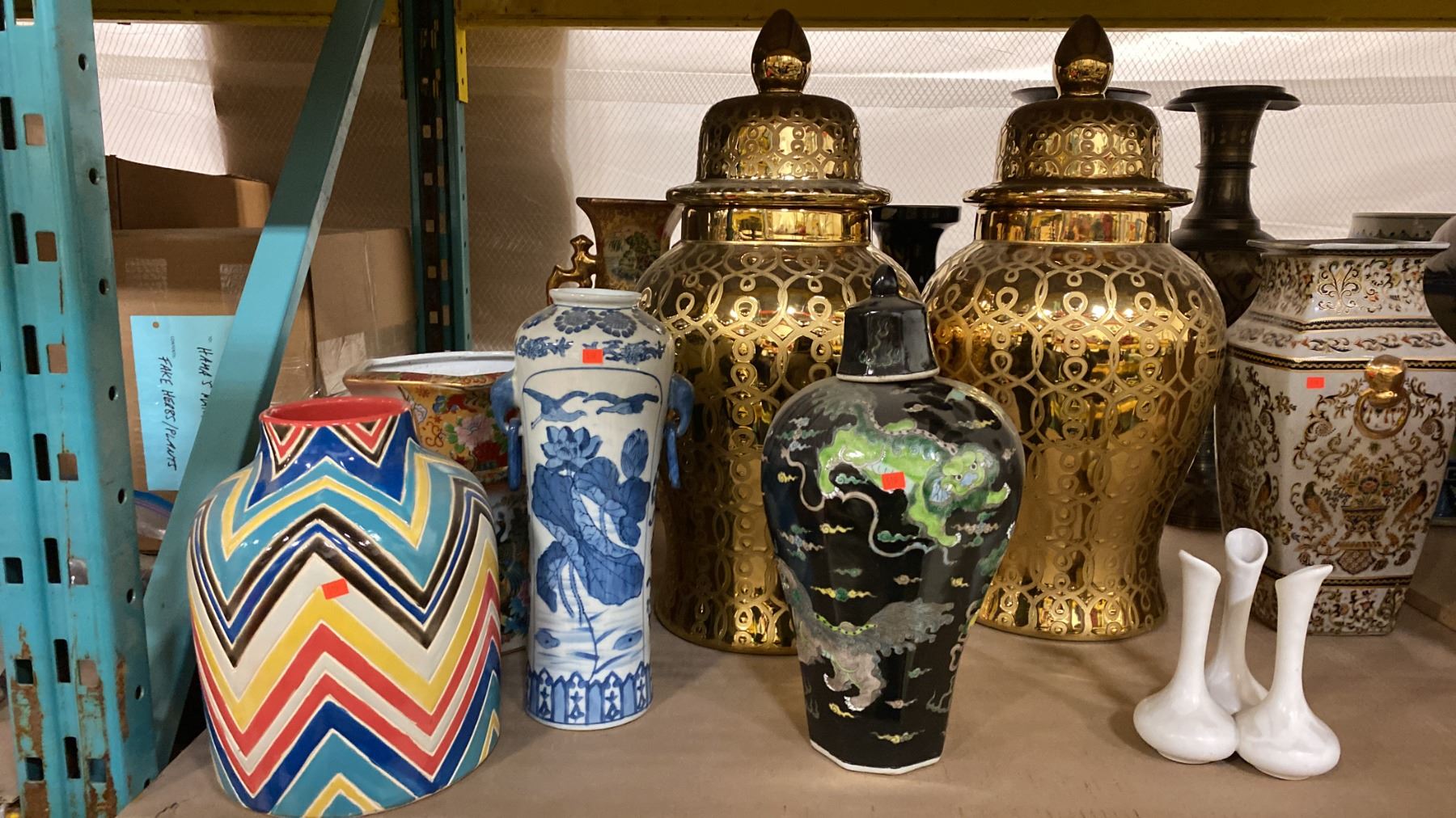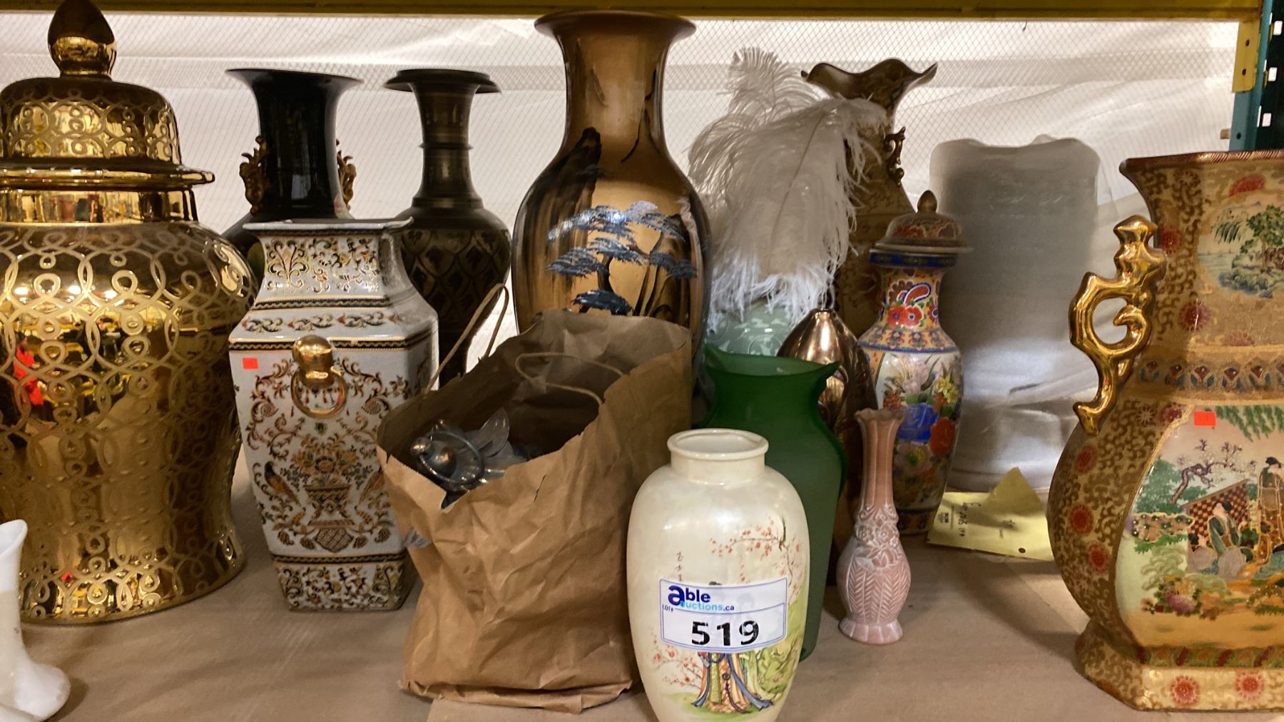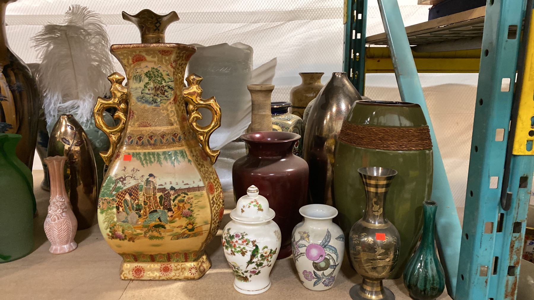 SHELF OF ASSORTED DECORATIVE FLOWER VASES