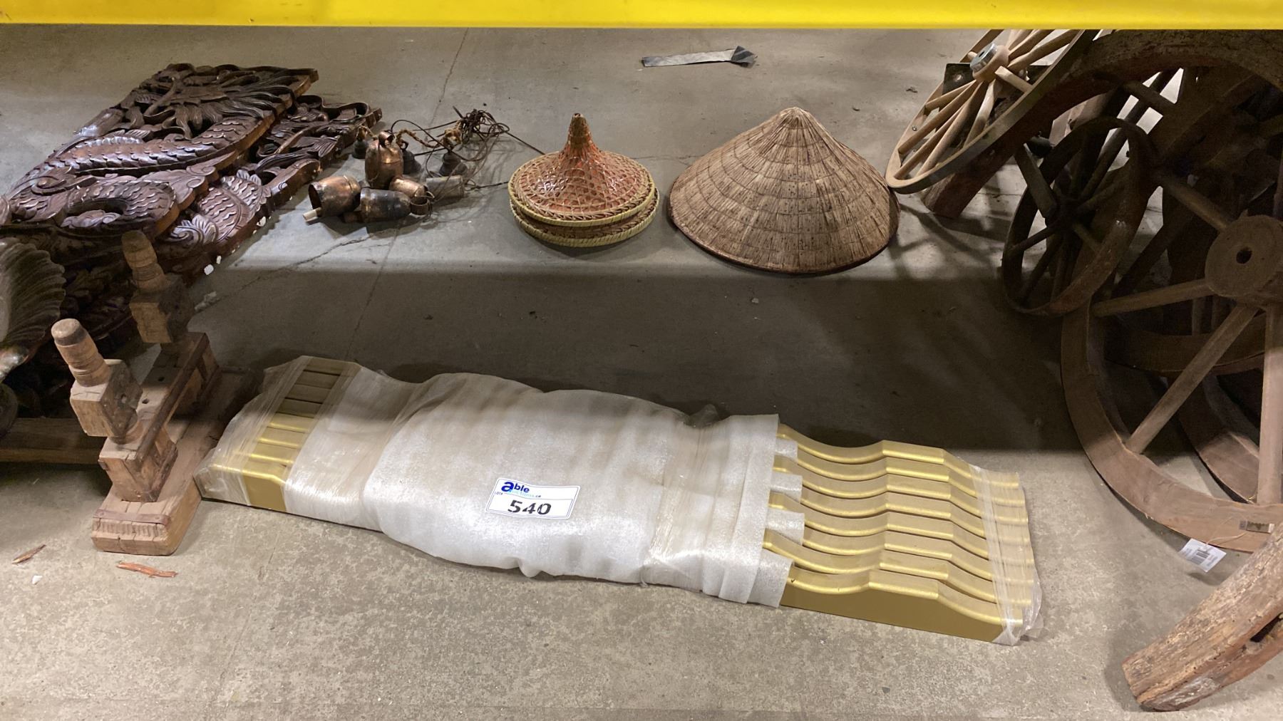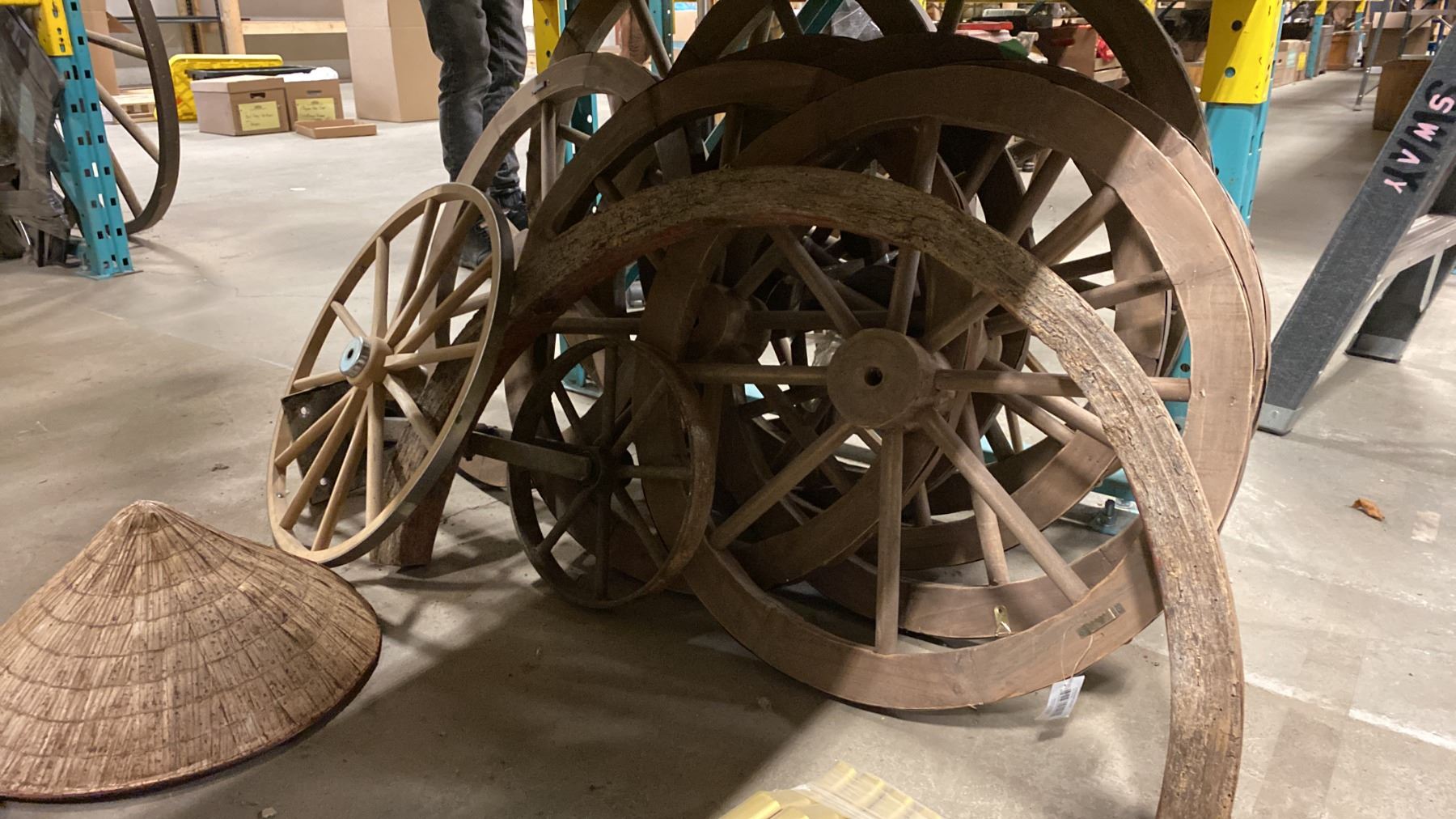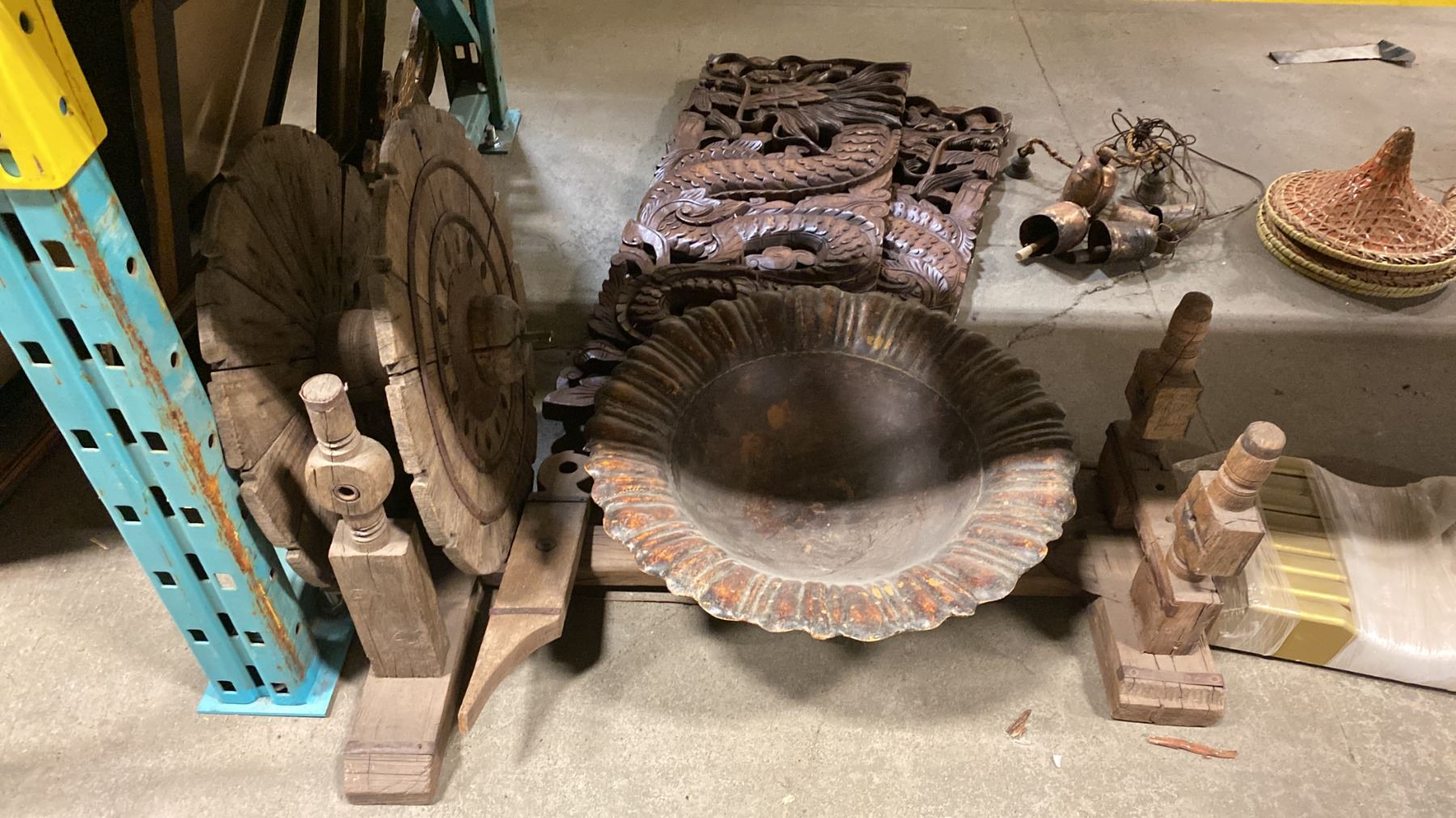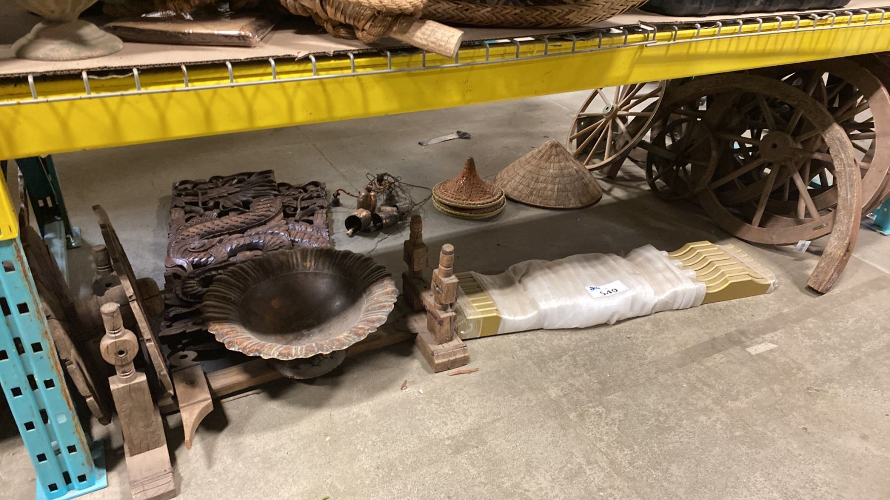 SHELF OF ASSORTED DECORATIVE WAGON WHEELS, WOODEN DECORATIVE ITEMS, BELLS & MORE