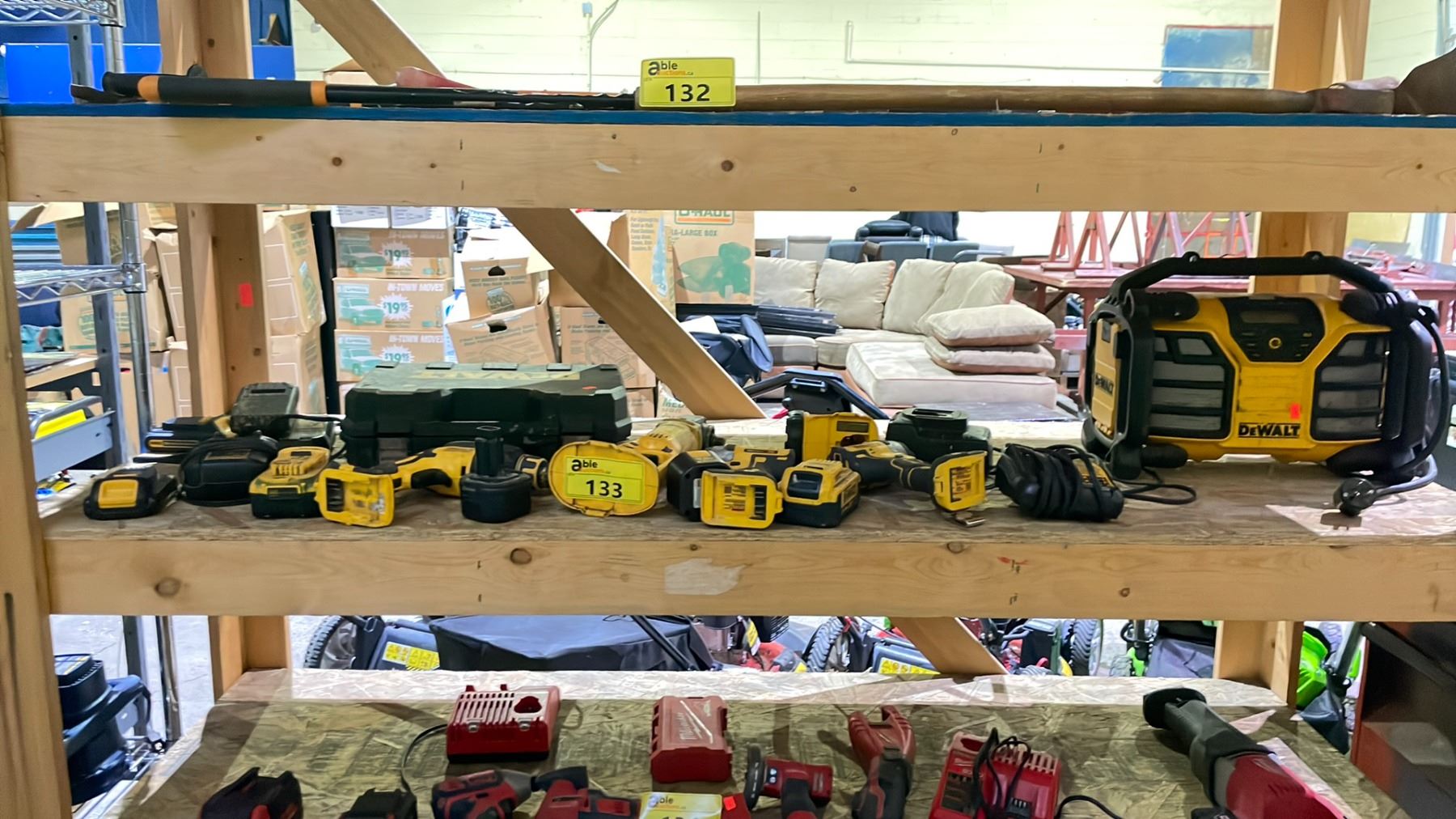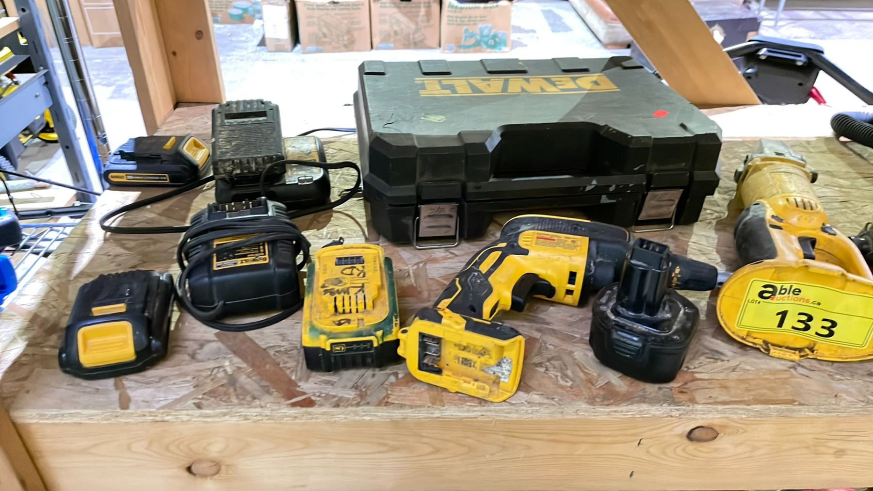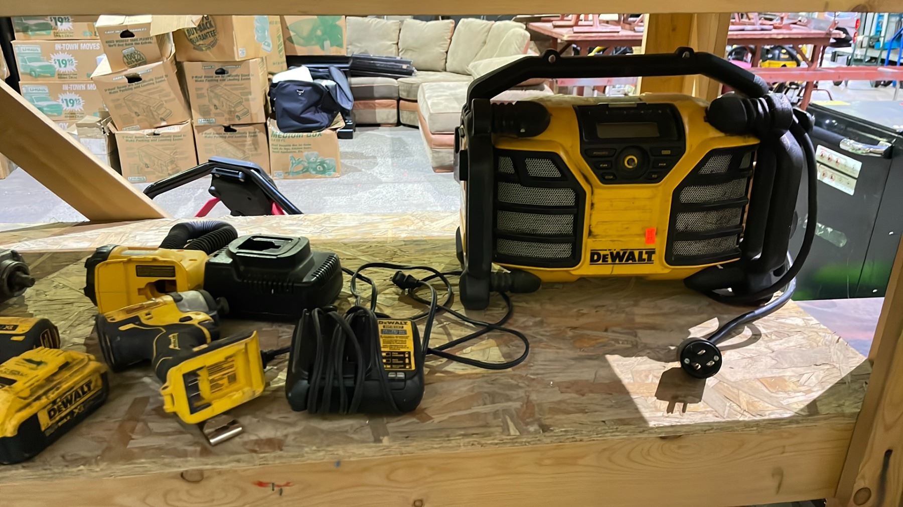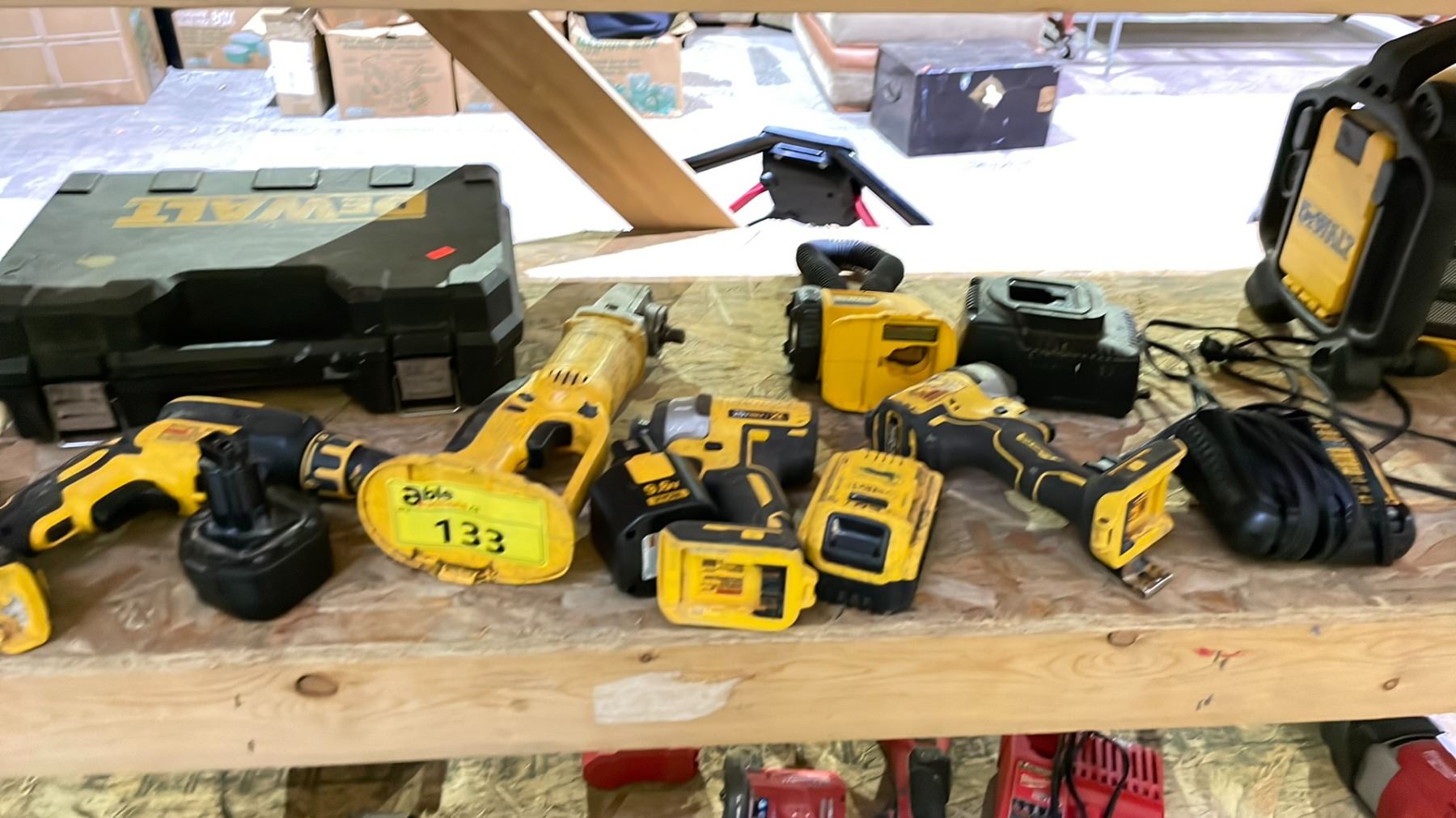 SHELF OF ASSORTED DEWALT TOOLS INCLUDING; DRILLS, FLASH LIGHT, STEREO, BATTERIES, CHARGERS & MORE