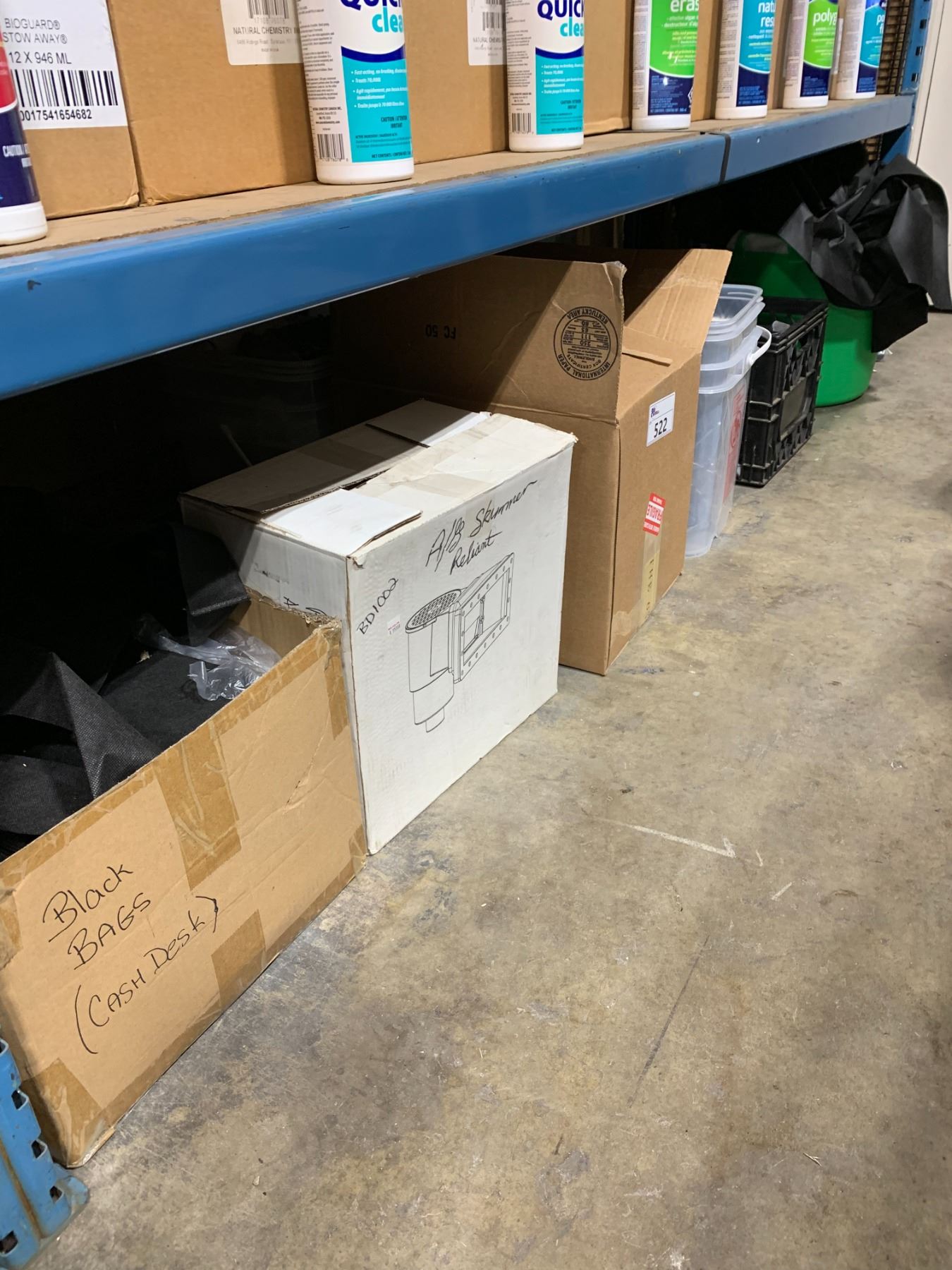 SHELF OF ASSORTED DISPLAY RACKING PARTS, BOTTLES, BAGS, & SKIMMER PARTS