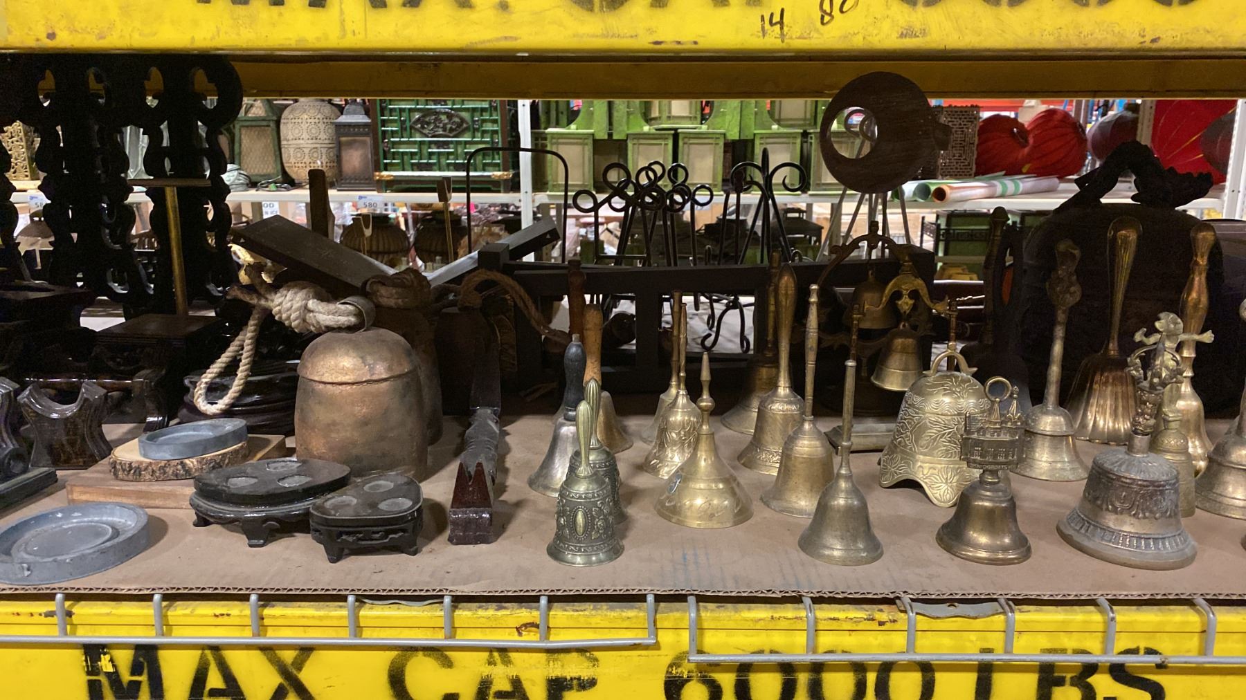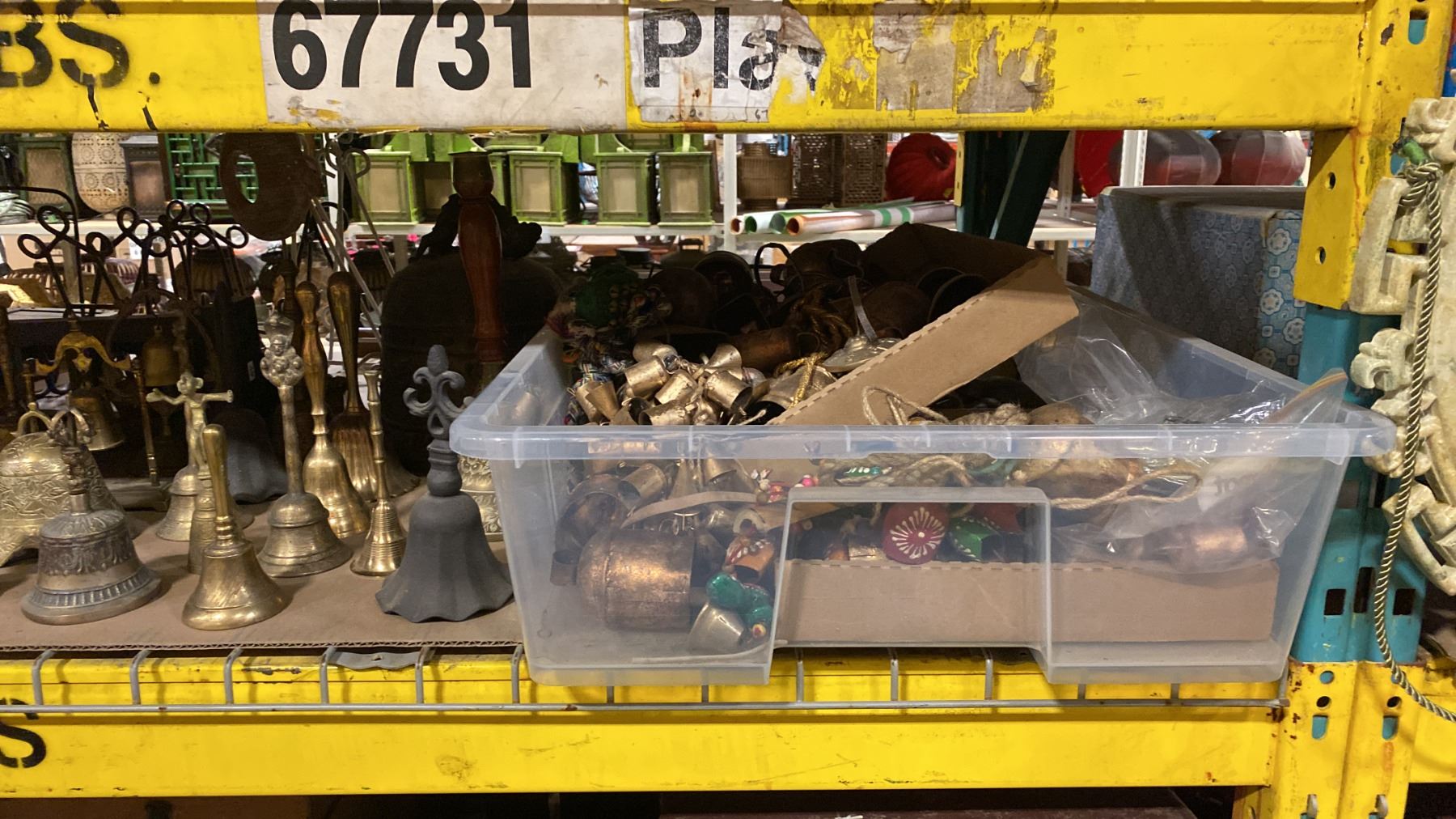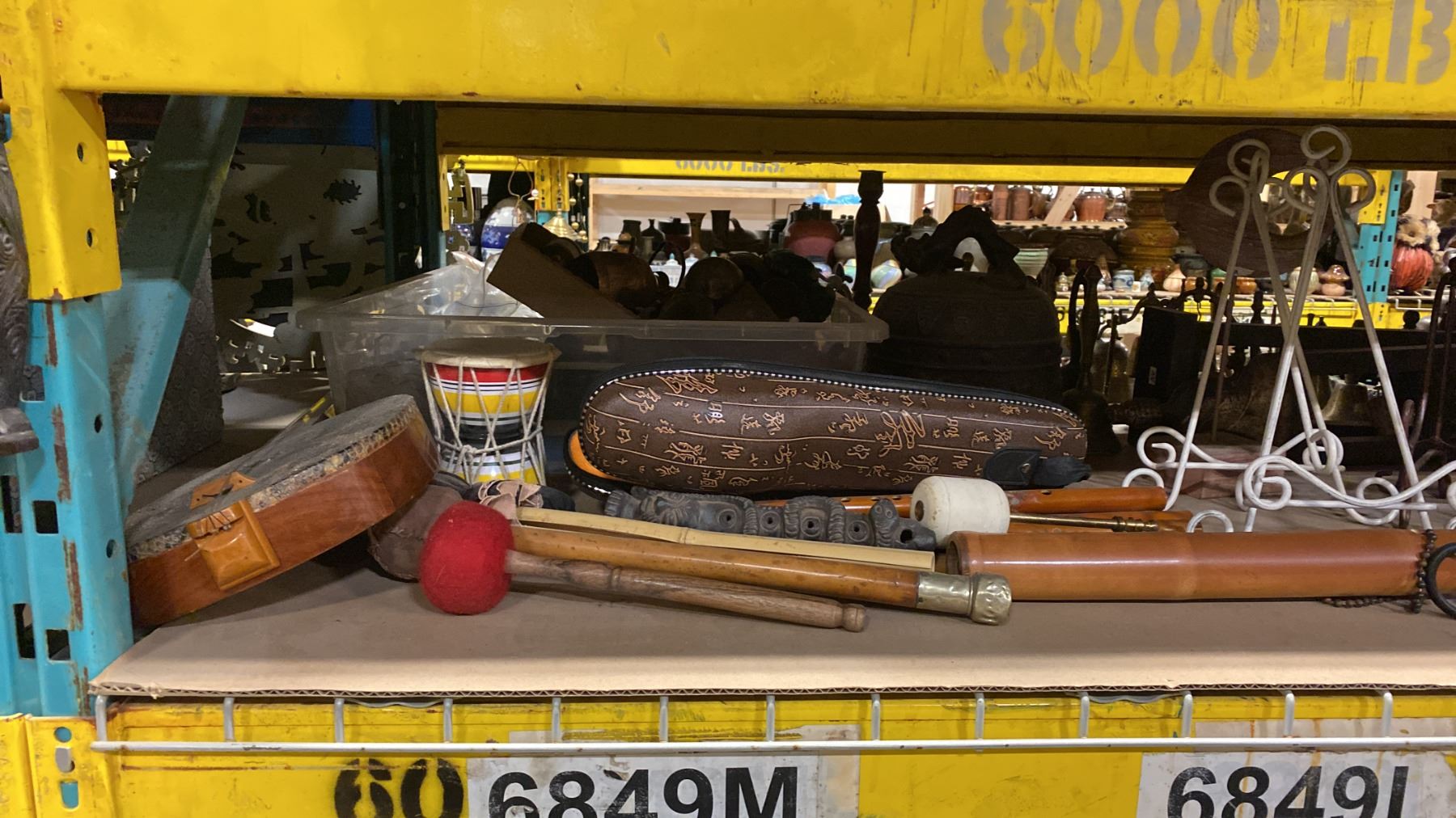 SHELF OF ASSORTED DISPLAY STANDS, ASSORTED INSTRUMENTS, LARGE COLLECTION OF BELLS & DECOR ITEMS