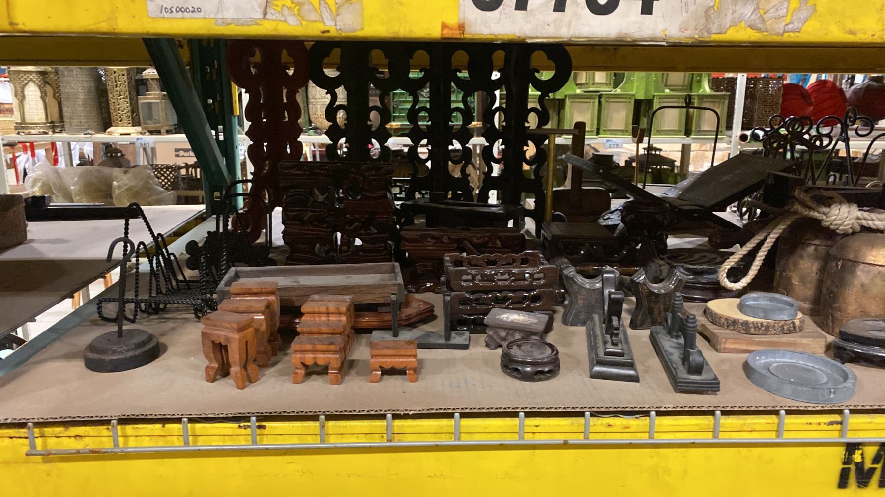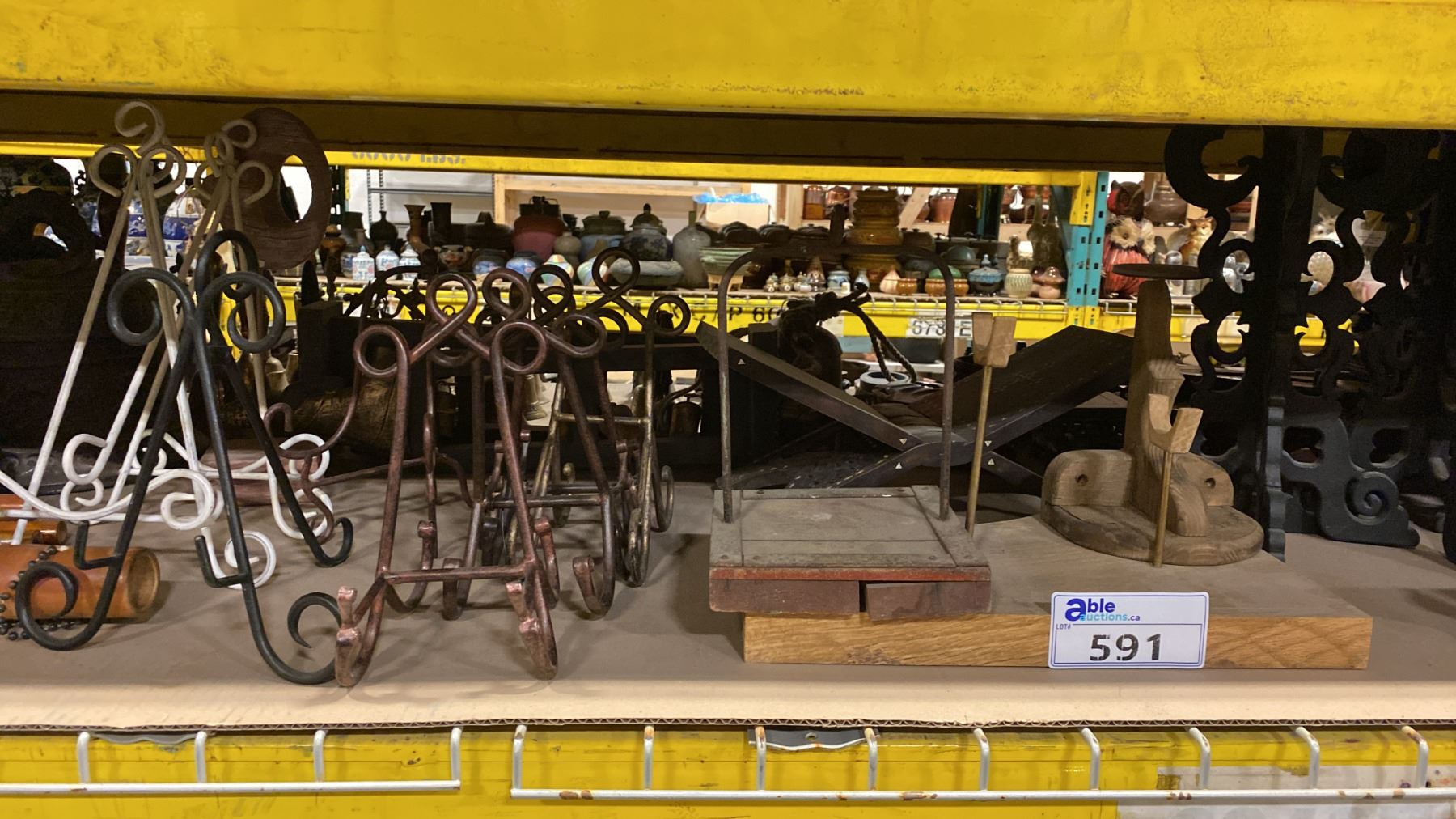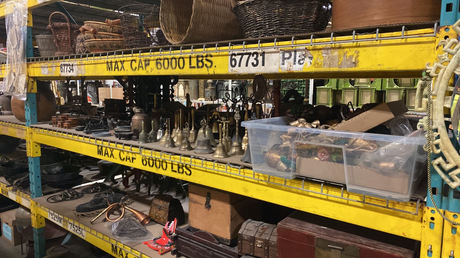 SHELF OF ASSORTED DISPLAY STANDS, ASSORTED INSTRUMENTS, LARGE COLLECTION OF BELLS & DECOR ITEMS