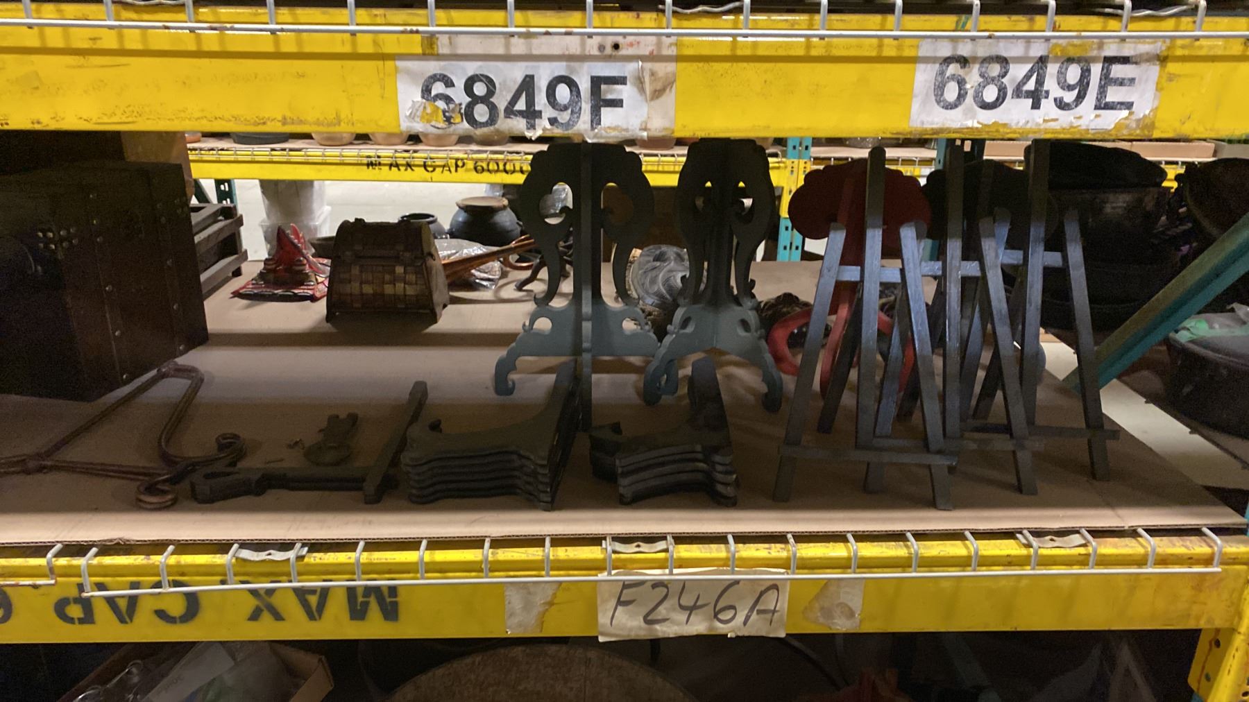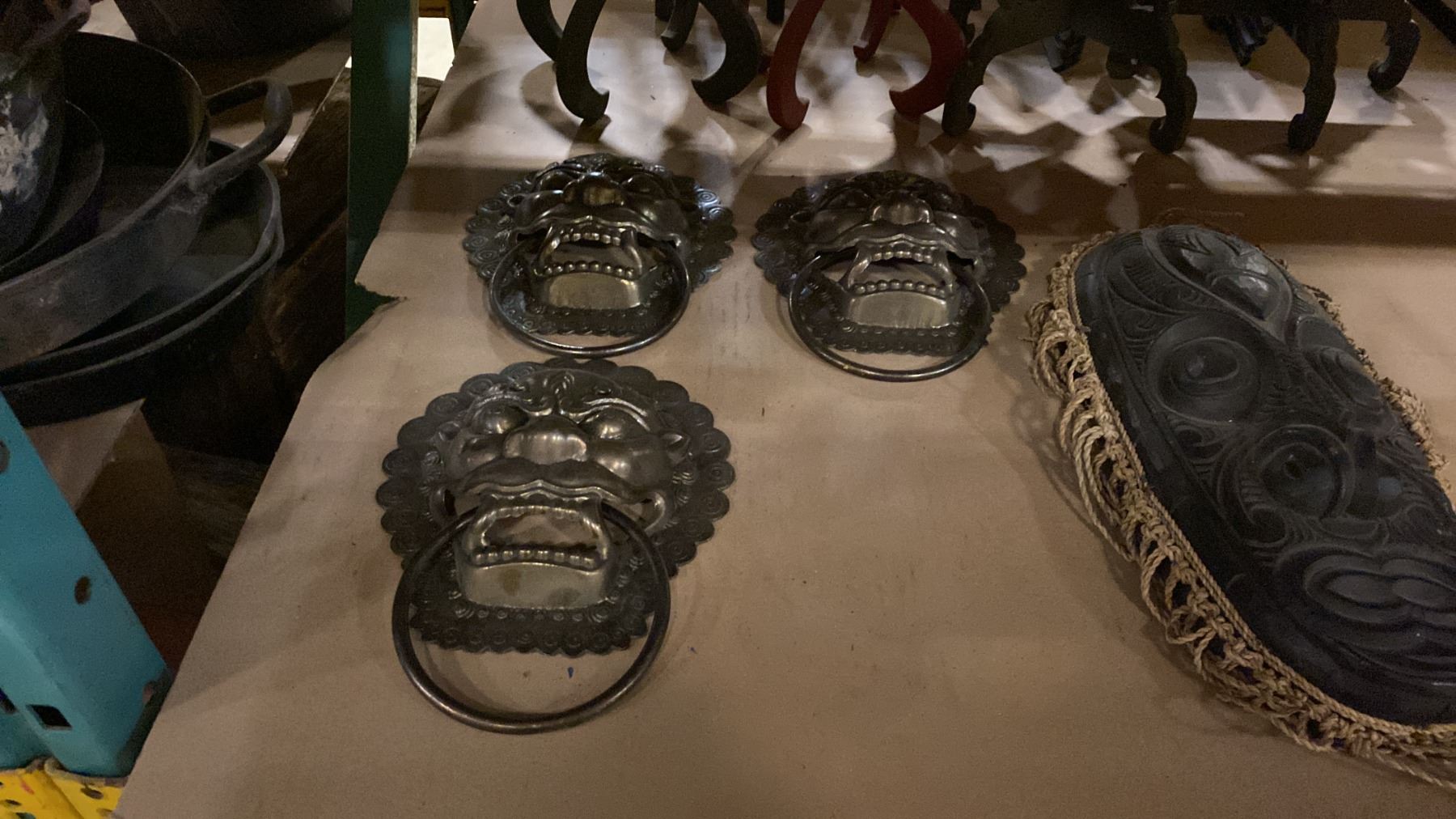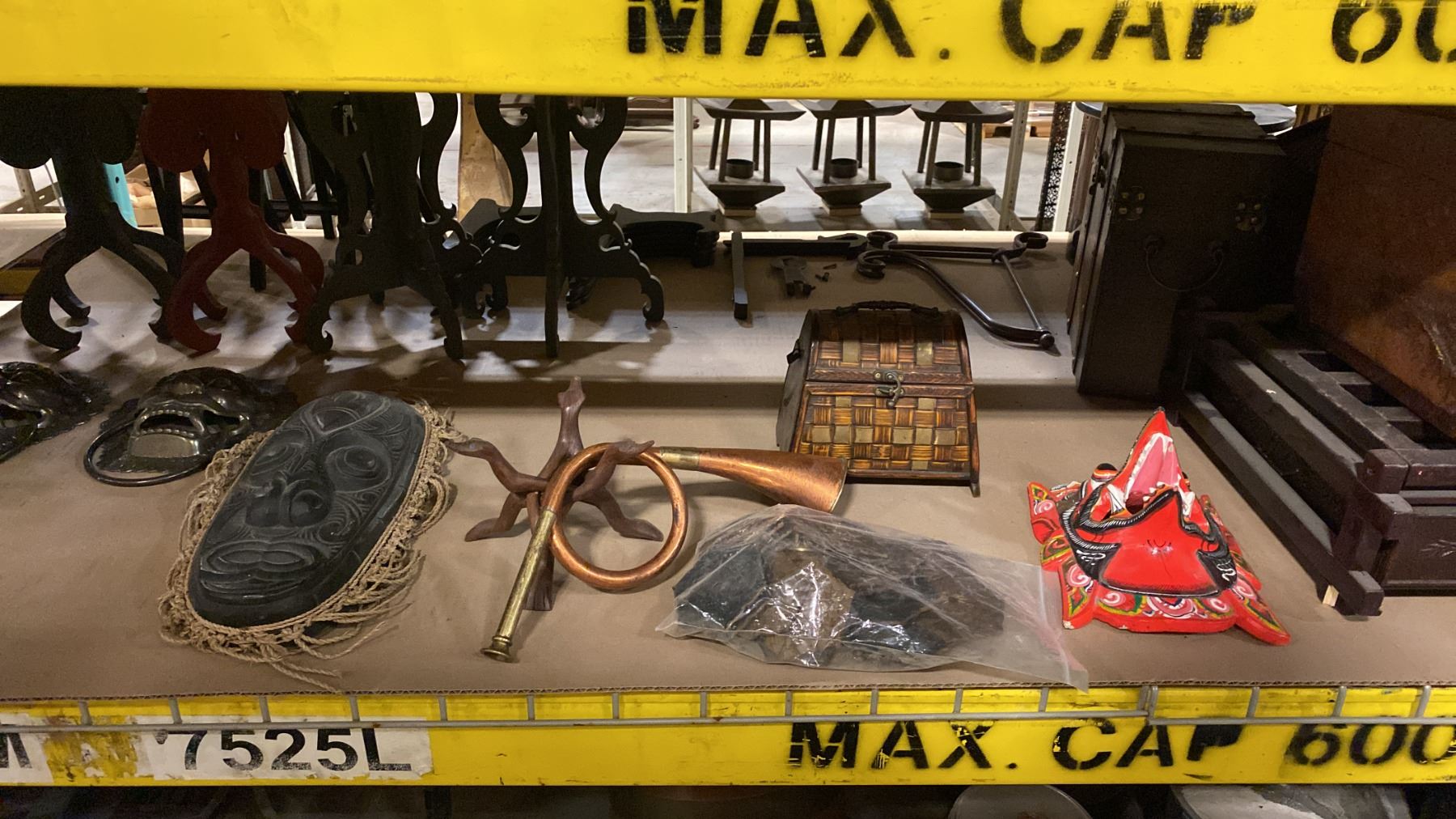 SHELF OF ASSORTED DISPLAY STANDS, MINI HARP, DECORATIVE MASKS & MORE