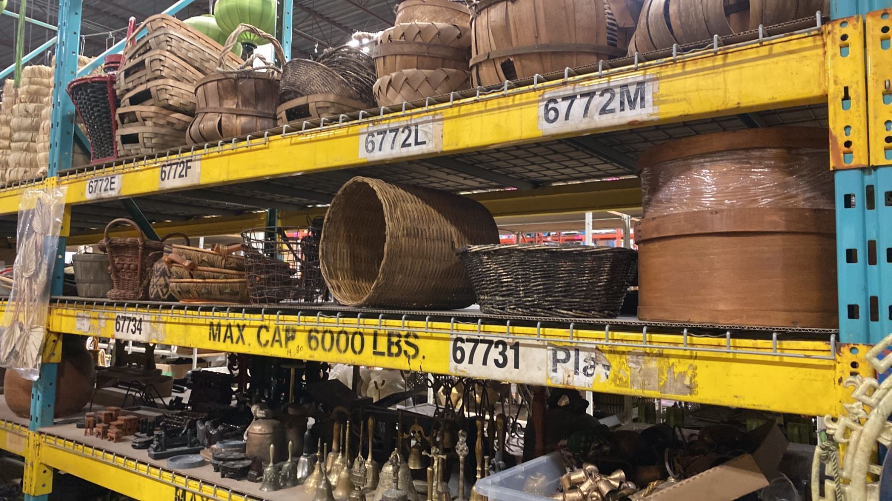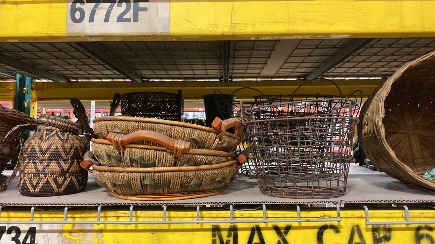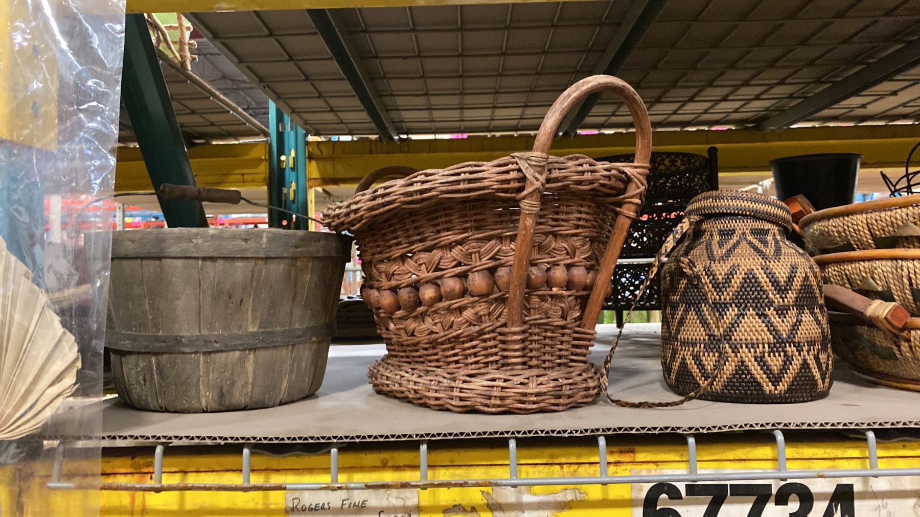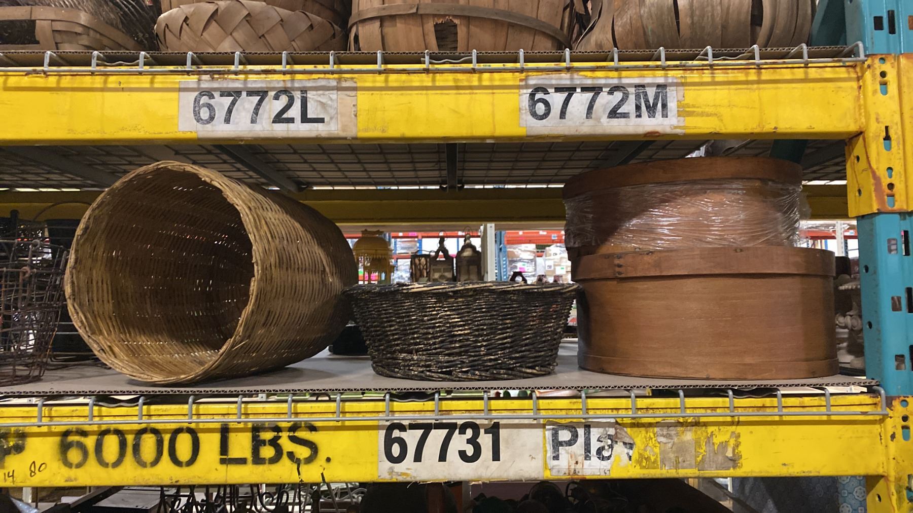 SHELF OF ASSORTED DISPLAY STANDS, WICKER/WIRE BASKETS & DECOR ITEMS