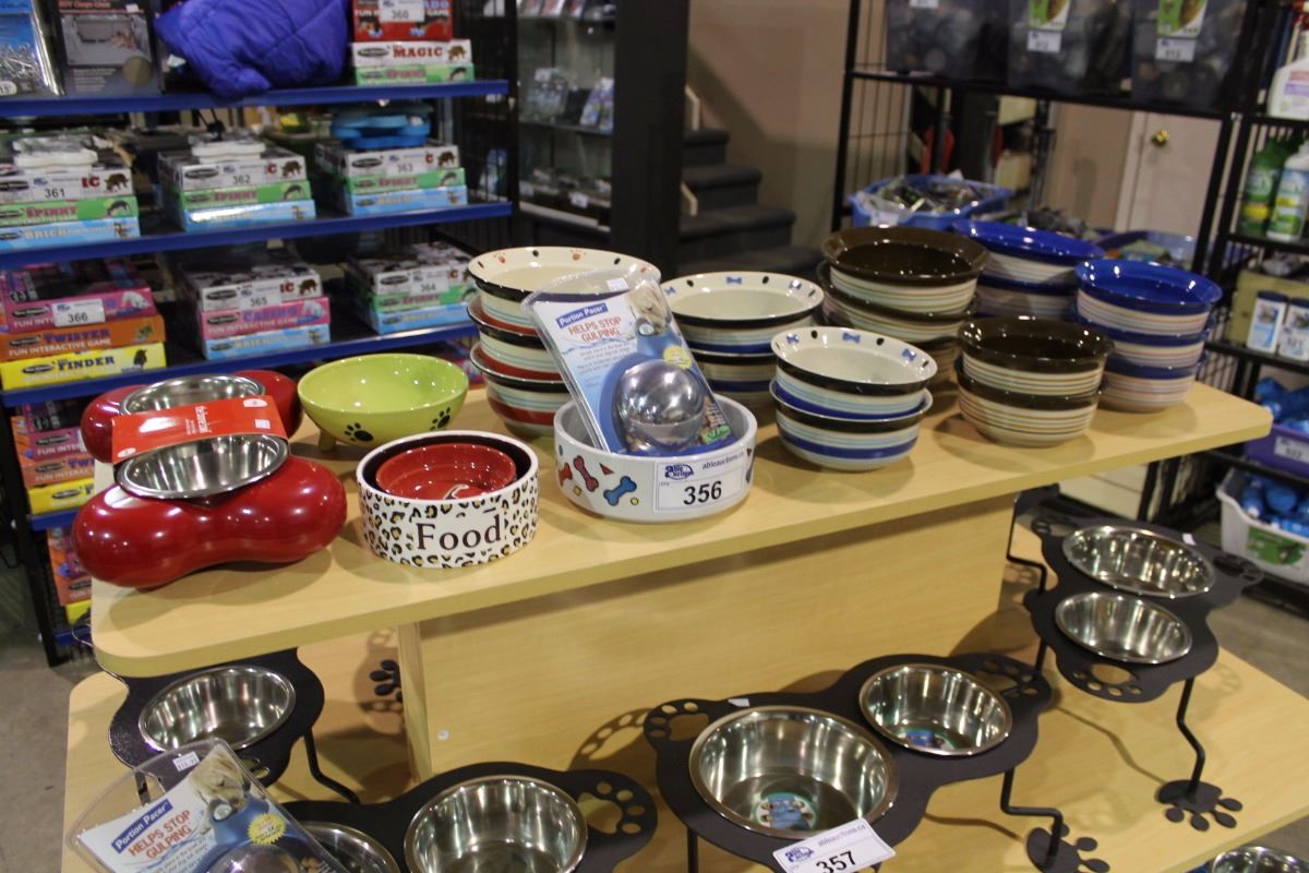 SHELF OF ASSORTED DOG BOWLS