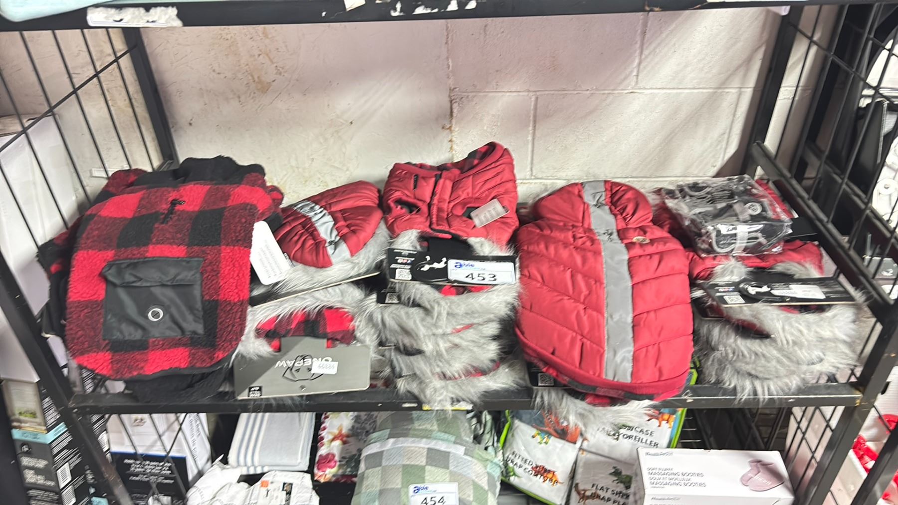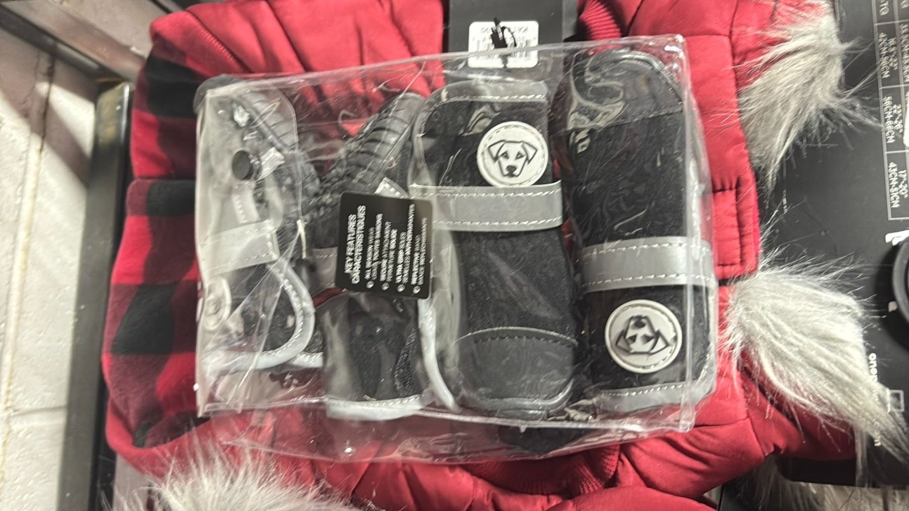 SHELF OF ASSORTED DOG GEAR INCLUDING; JACKETS & BOOTS