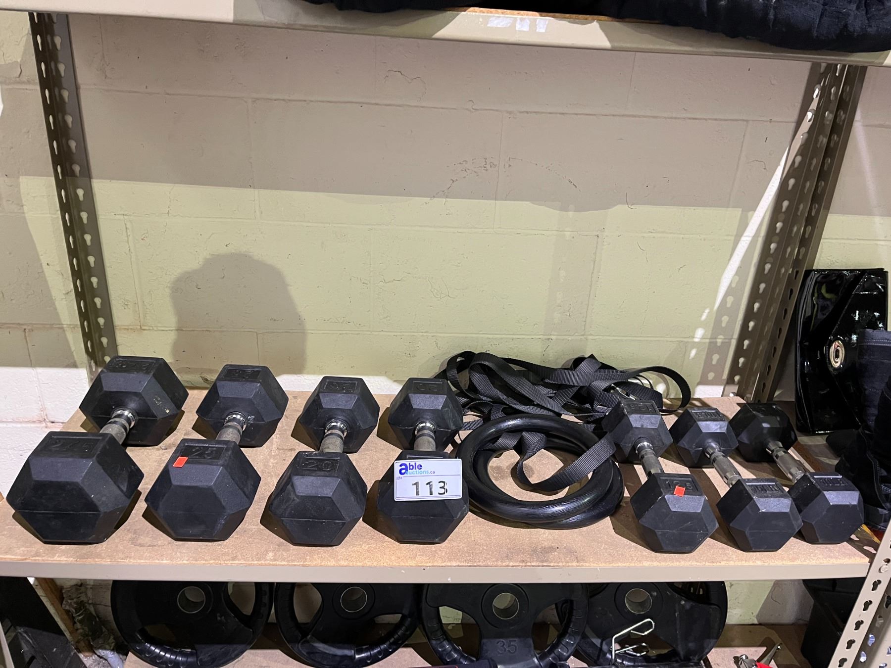 SHELF OF ASSORTED DUMBBELLS & GYMNAST RINGS