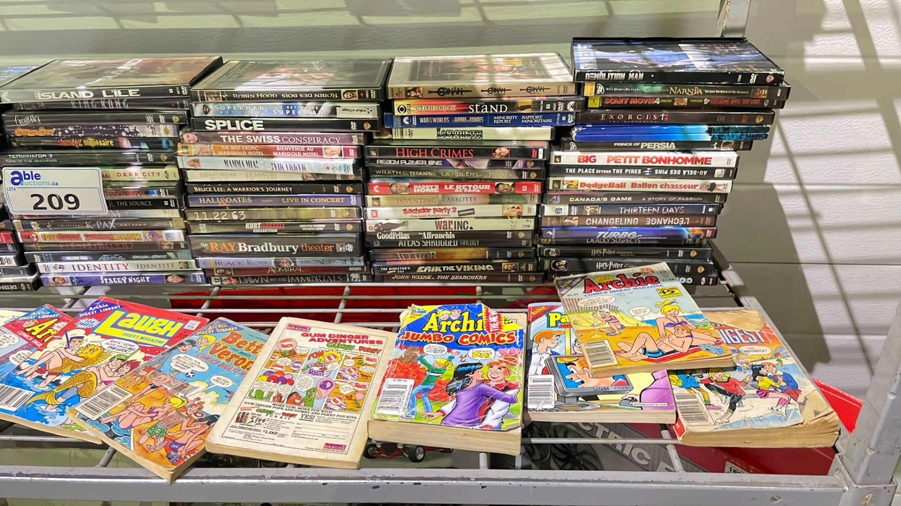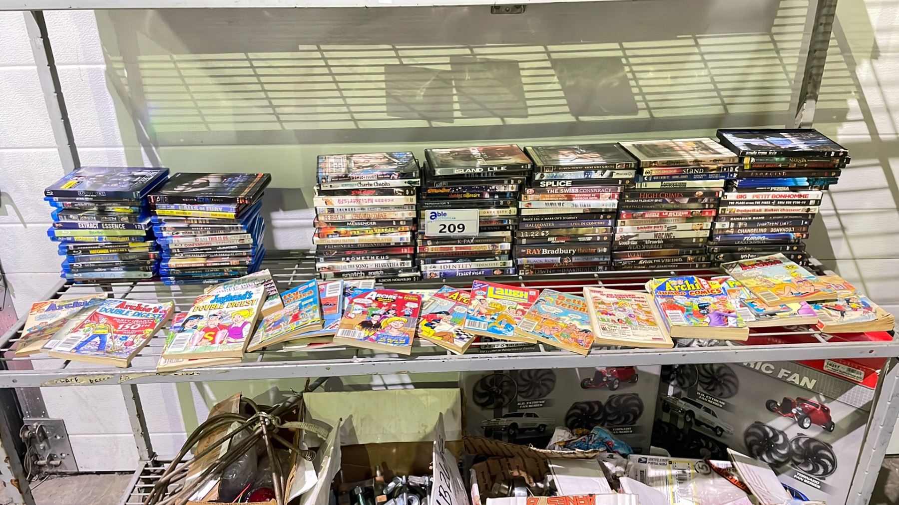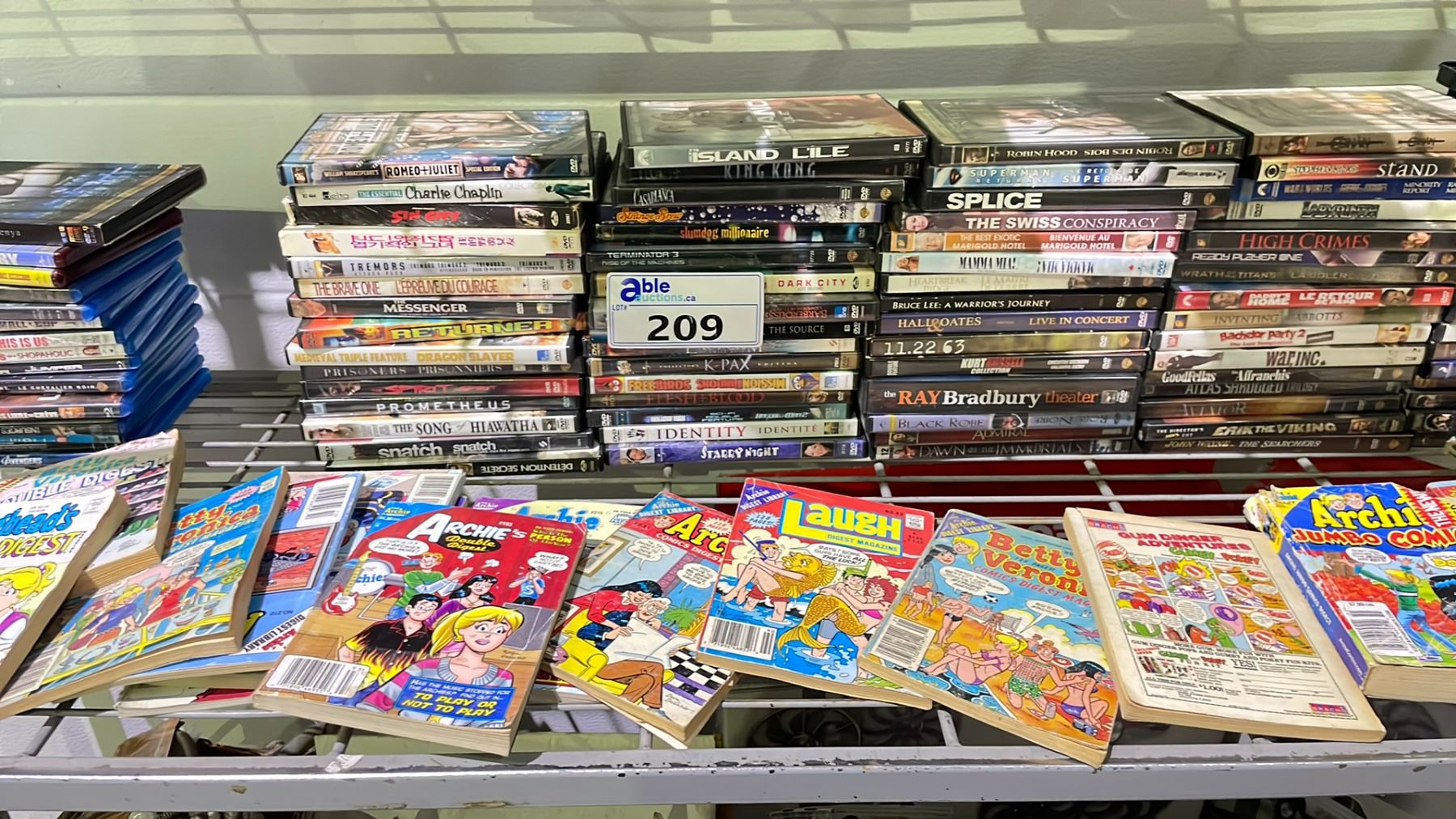 SHELF OF ASSORTED DVD'S & COMIC BOOKS
