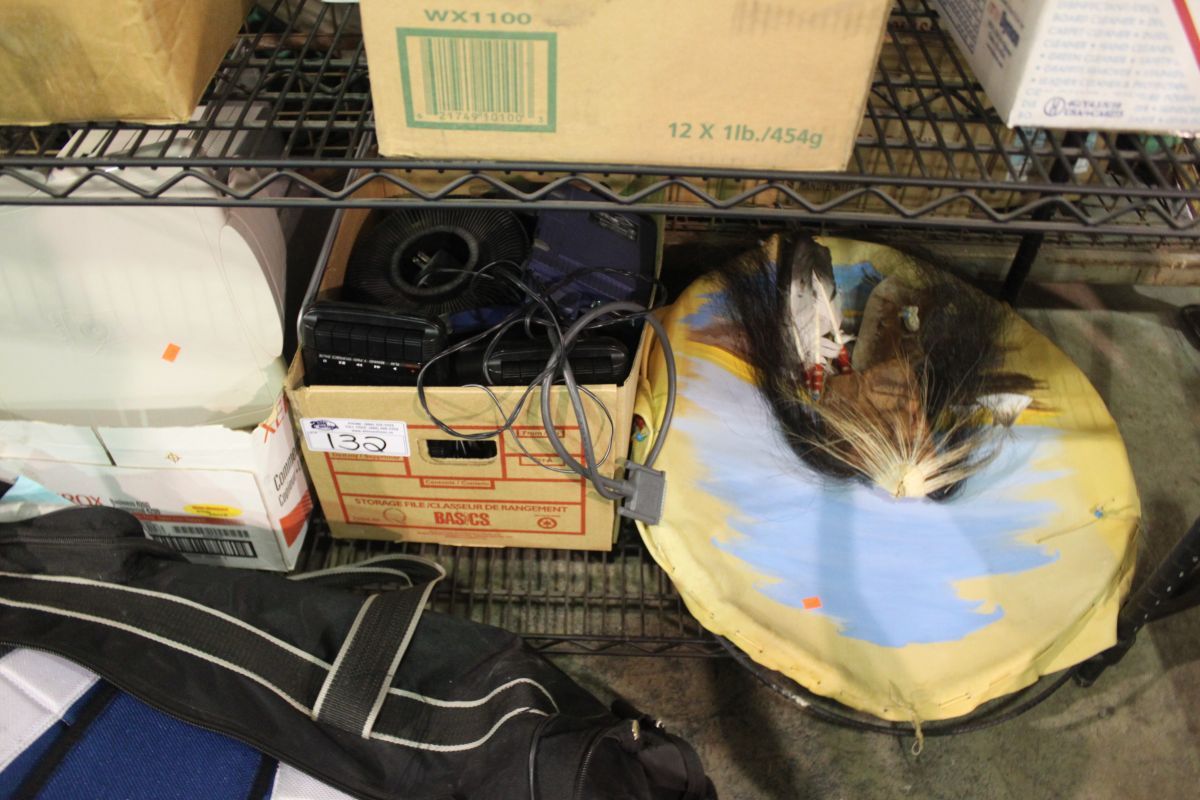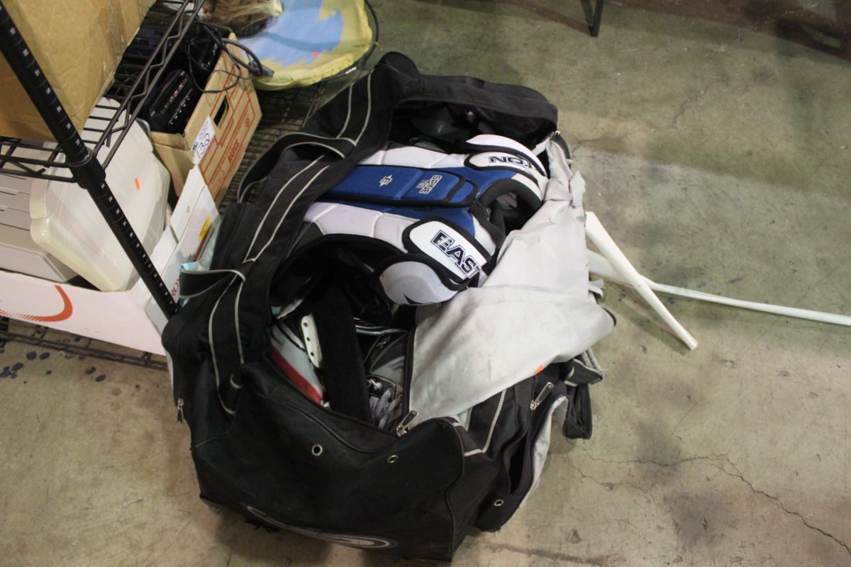 SHELF OF ASSORTED ELECTRONICS & HOCKEY EQUIPMENT