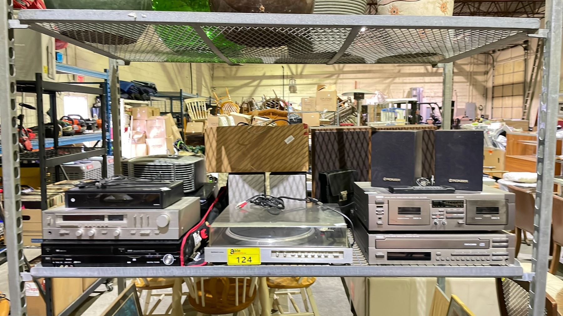 SHELF OF ASSORTED ELECTRONICS INCLUDING; TURNTABLE, STEREO RECEIVER, SPEAKERS & MORE