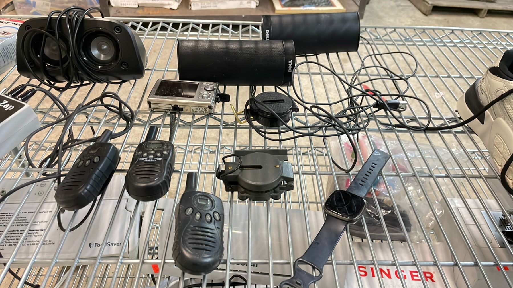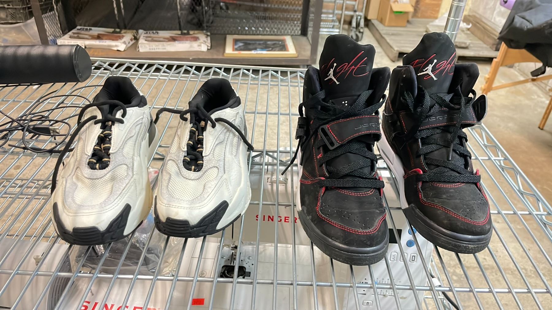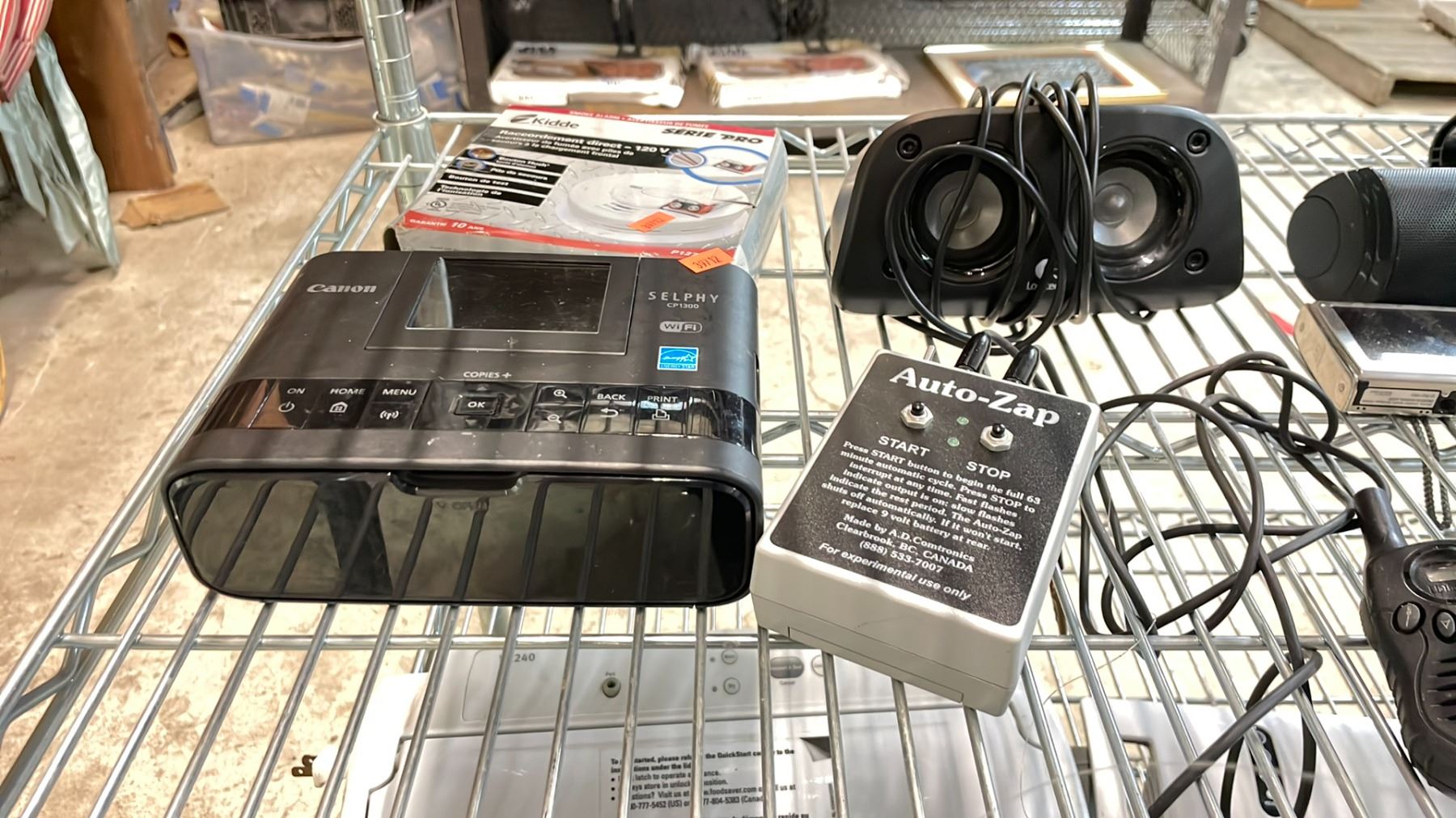 SHELF OF ASSORTED ELECTRONICS & SHOES, INCLUDES JORDAN FLIGHT SHOES *SZ 6Y US* CANON SELPHY CP1300 PHOTO PRINTER & MORE