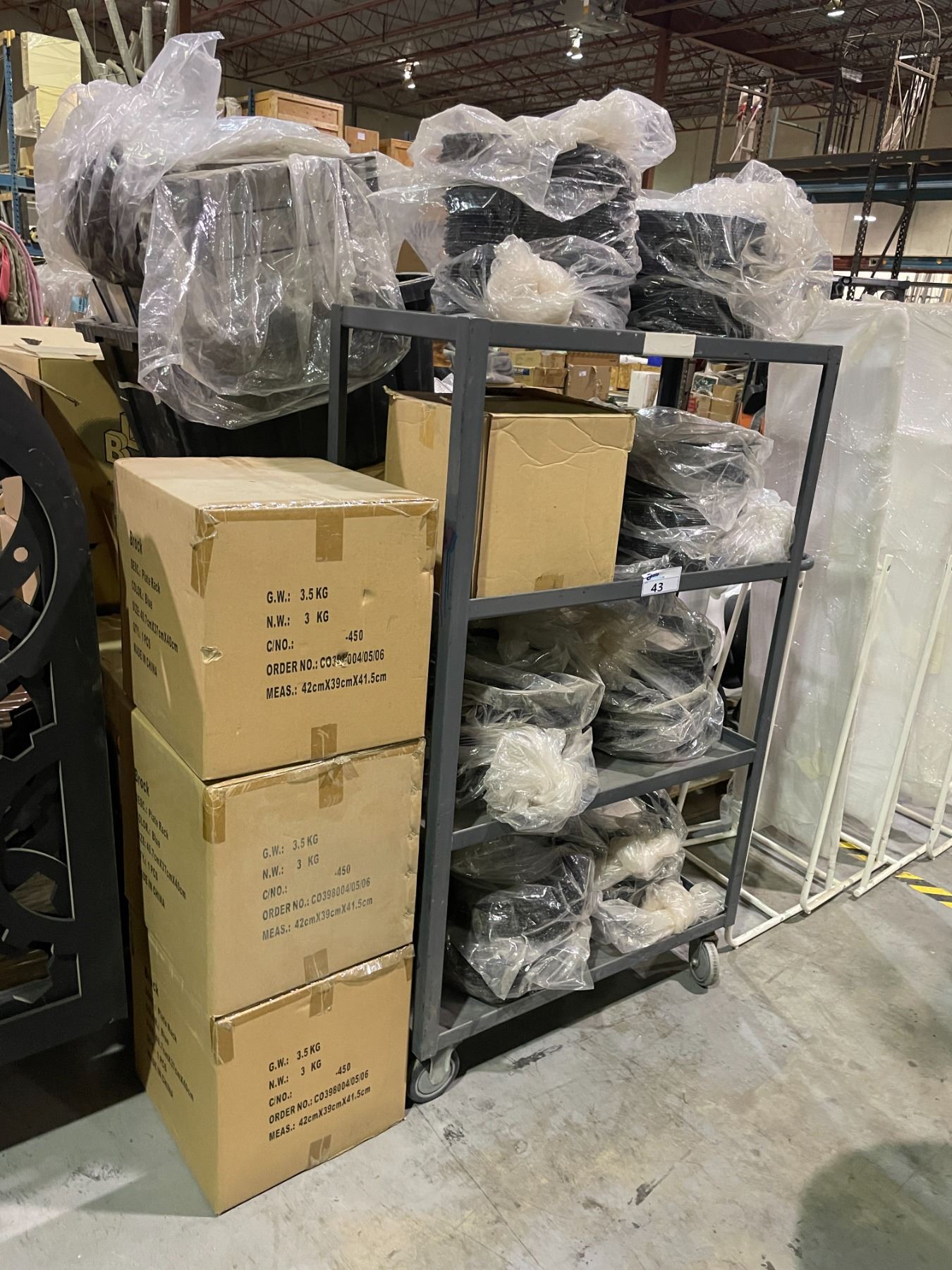 SHELF OF ASSORTED EVENT PLATES & 3 BOXES OF PLATE RACKS *GREY METAL MOBILE RACK NOT INCLUDED*