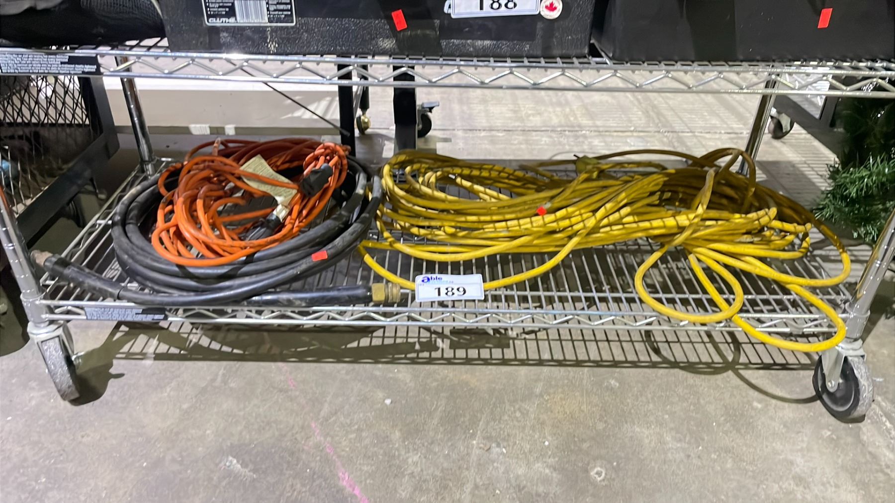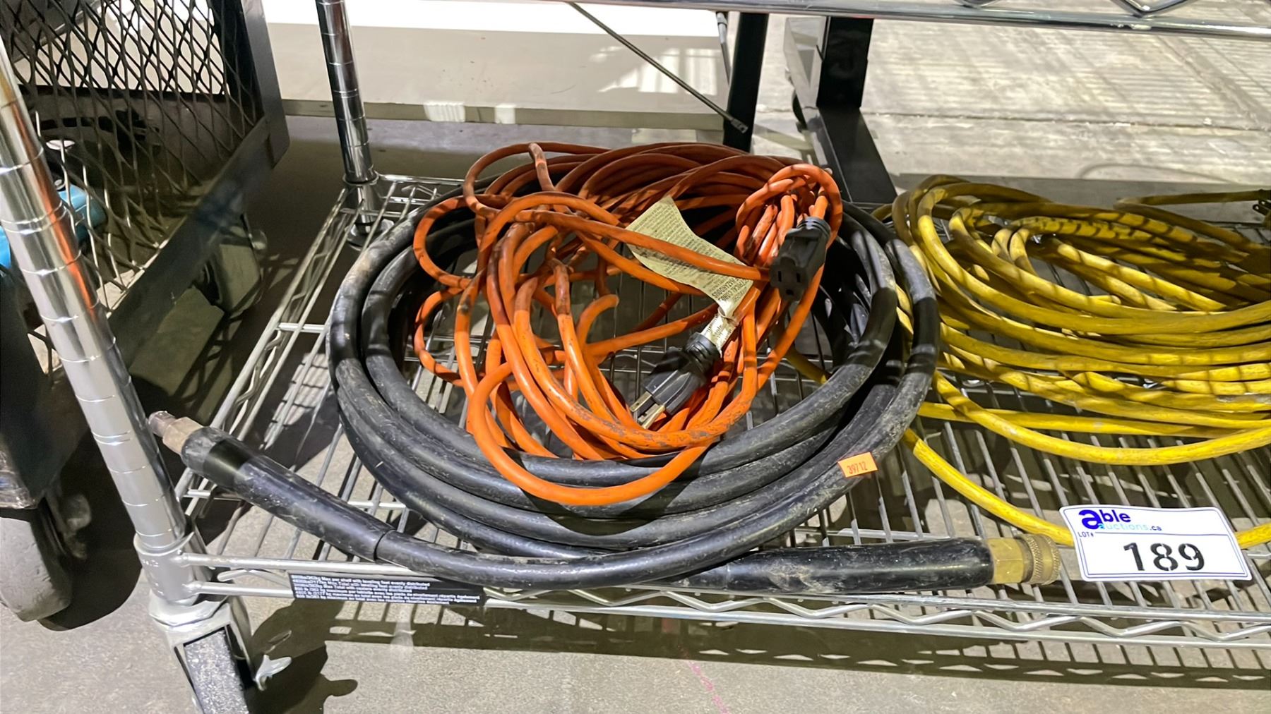 SHELF OF ASSORTED EXTENSION CORDS & HIGH PRESSURE HOSE