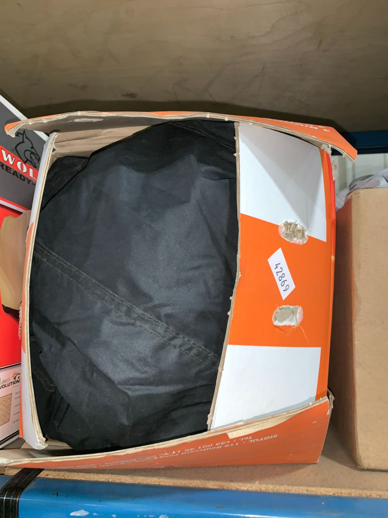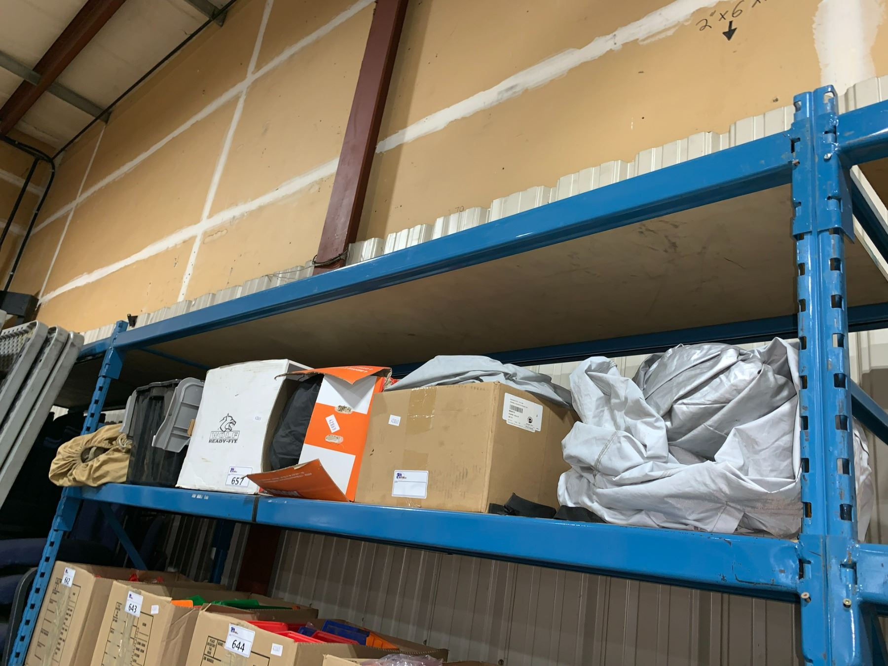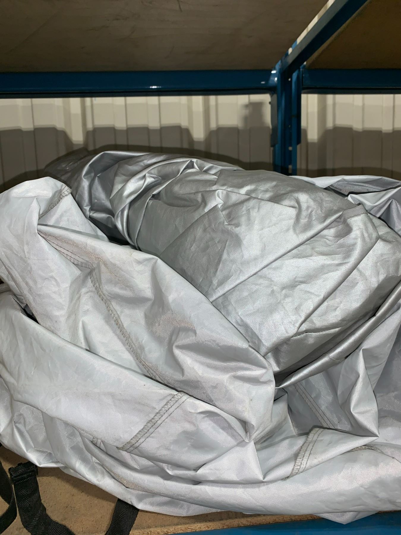 SHELF OF ASSORTED FABRIC / CANVAS CAR COVERS ( BINS INCLUDED )