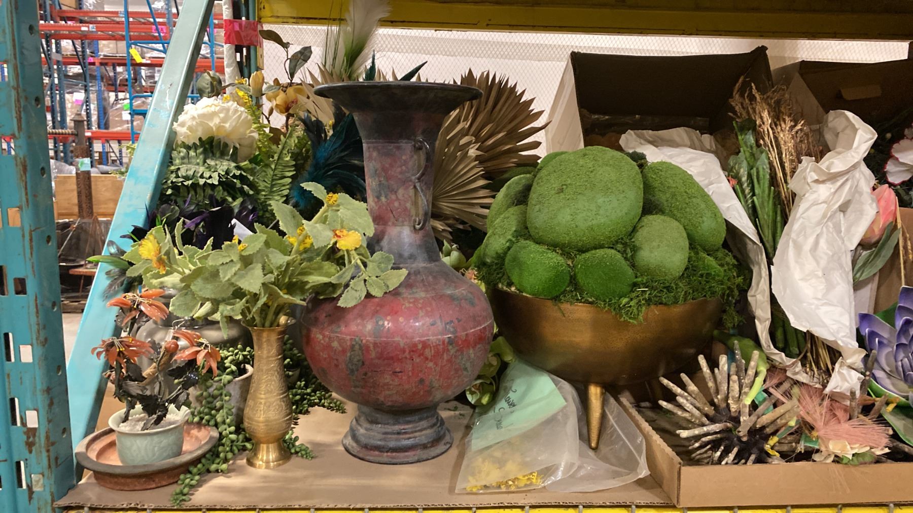 SHELF OF ASSORTED FAUX PLANTS/FLOWERS, FLOWER VASES/POTS & DECORATIVE ITEMS