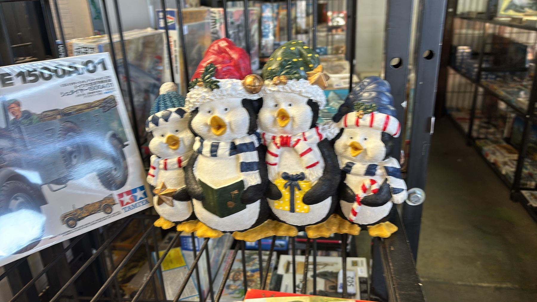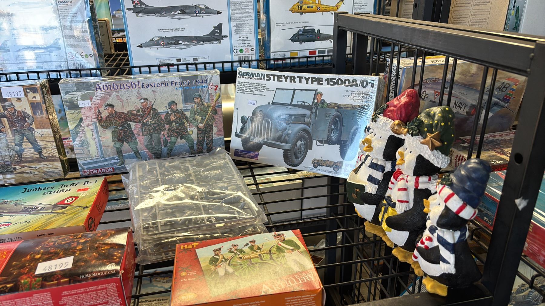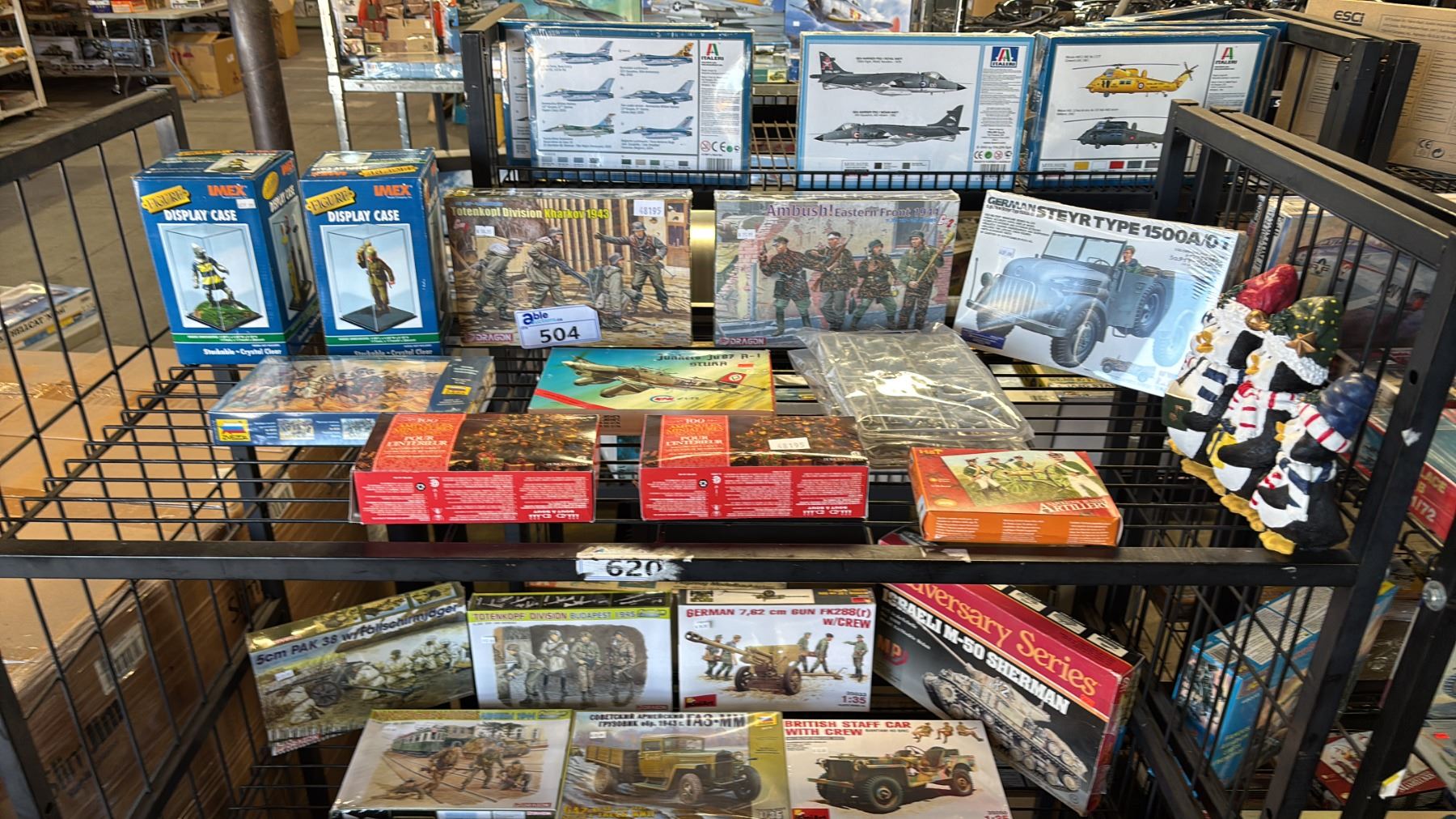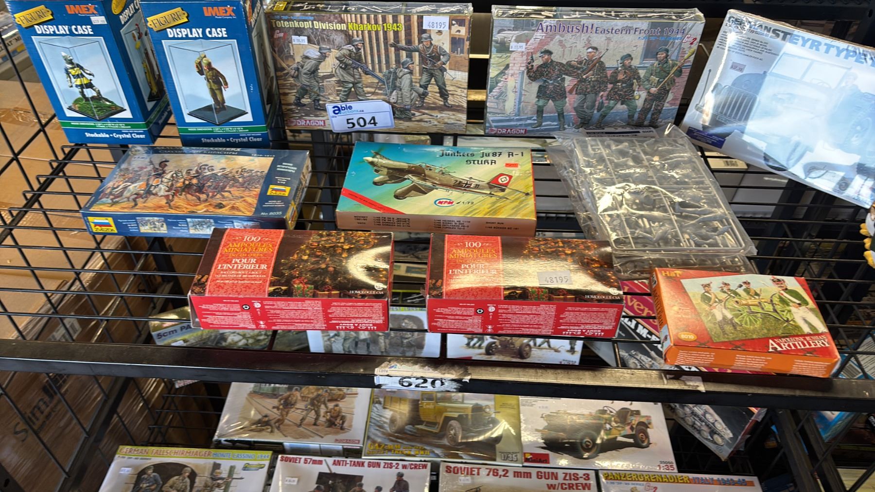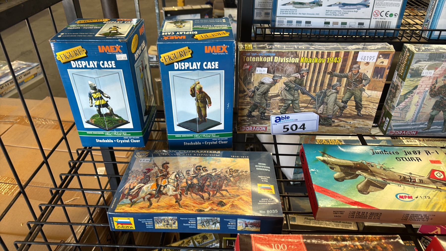 SHELF OF ASSORTED FIGURE DISPLAY CASES, AIRPLANE MODEL KIT, CHRISTMAS LIGHTS & MORE