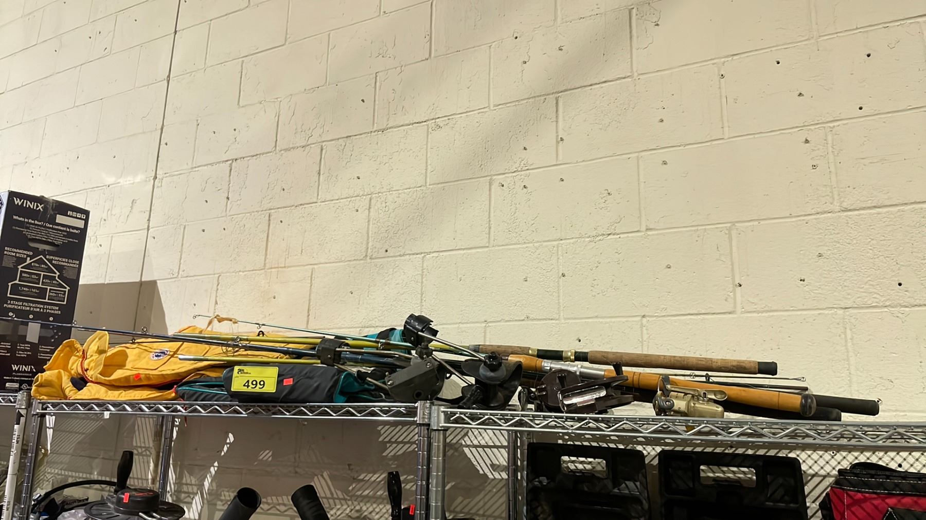 SHELF OF ASSORTED FISHING GEAR INCLUDING; RODS, RAIN JACKET, LIFE VEST & MORE