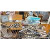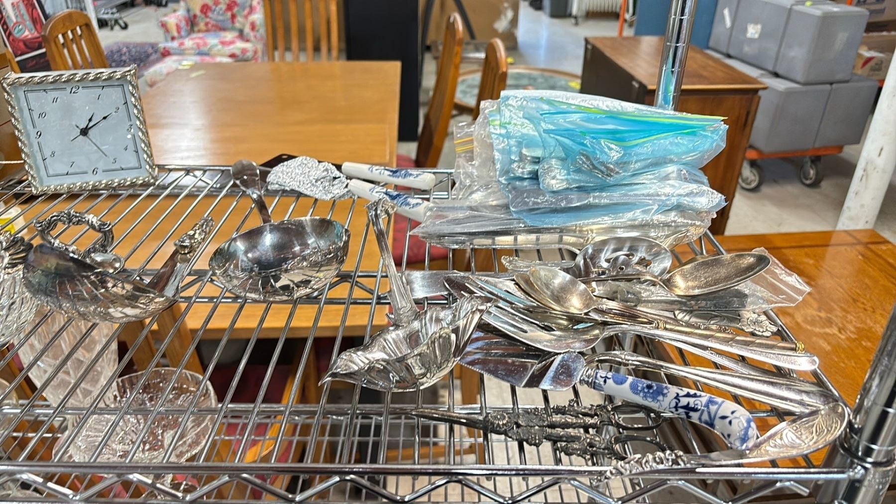 SHELF OF ASSORTED FLATWARE & COLLECTIBLES