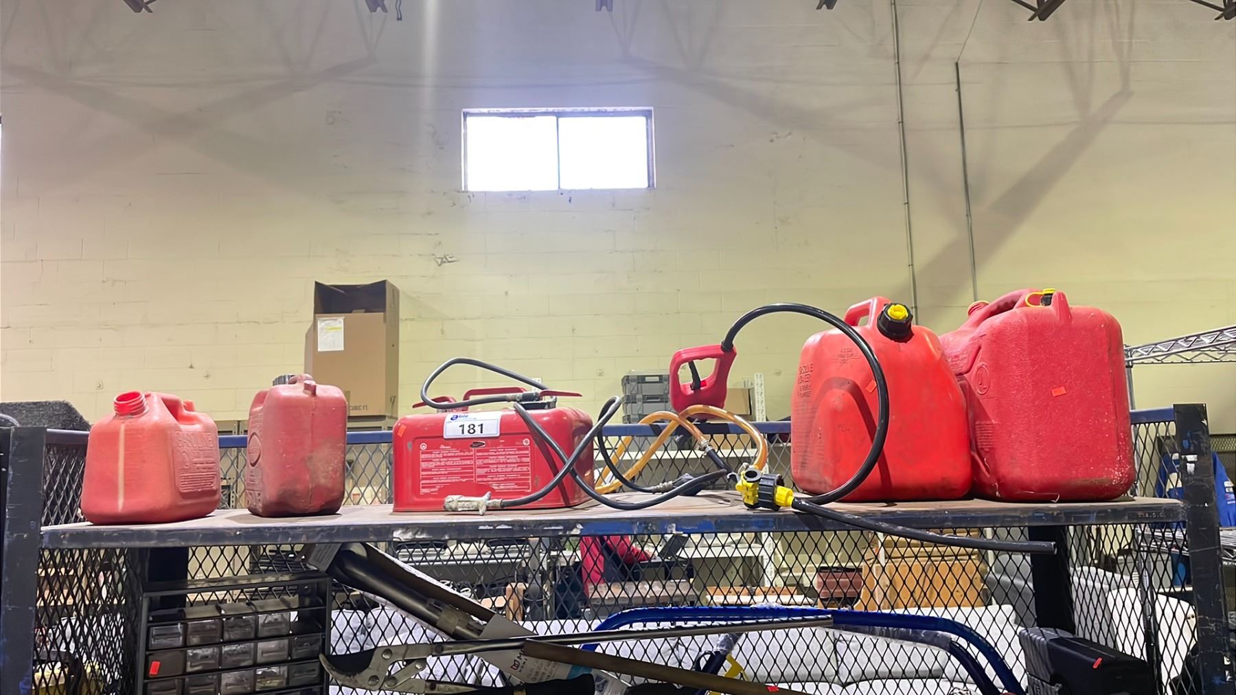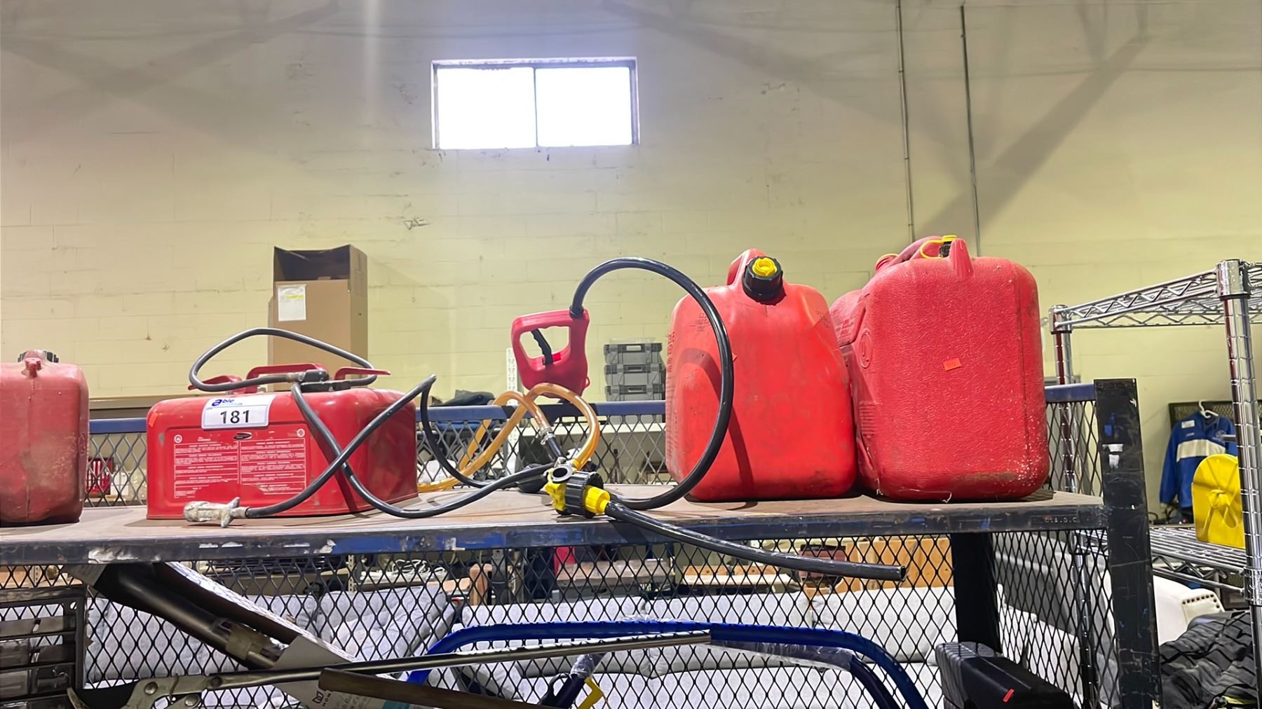 SHELF OF ASSORTED FUEL CANS & FUEL PUMP