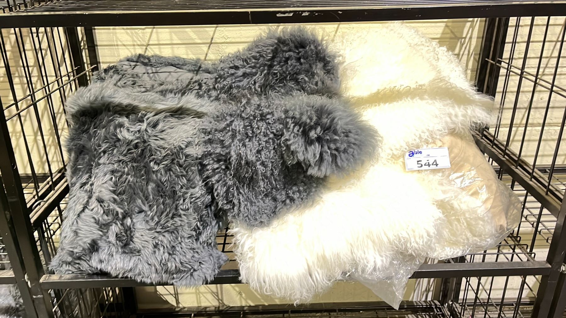 SHELF OF ASSORTED FUZZY CUSHIONS & AREA RUGS