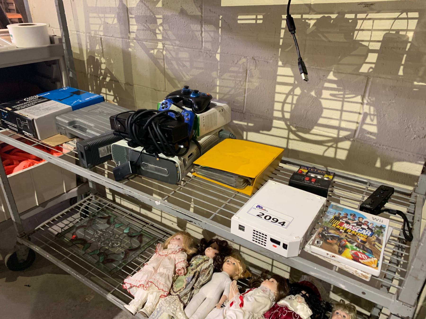 SHELF OF ASSORTED GAMING CONSOLES, GAMES, AND MOUNT