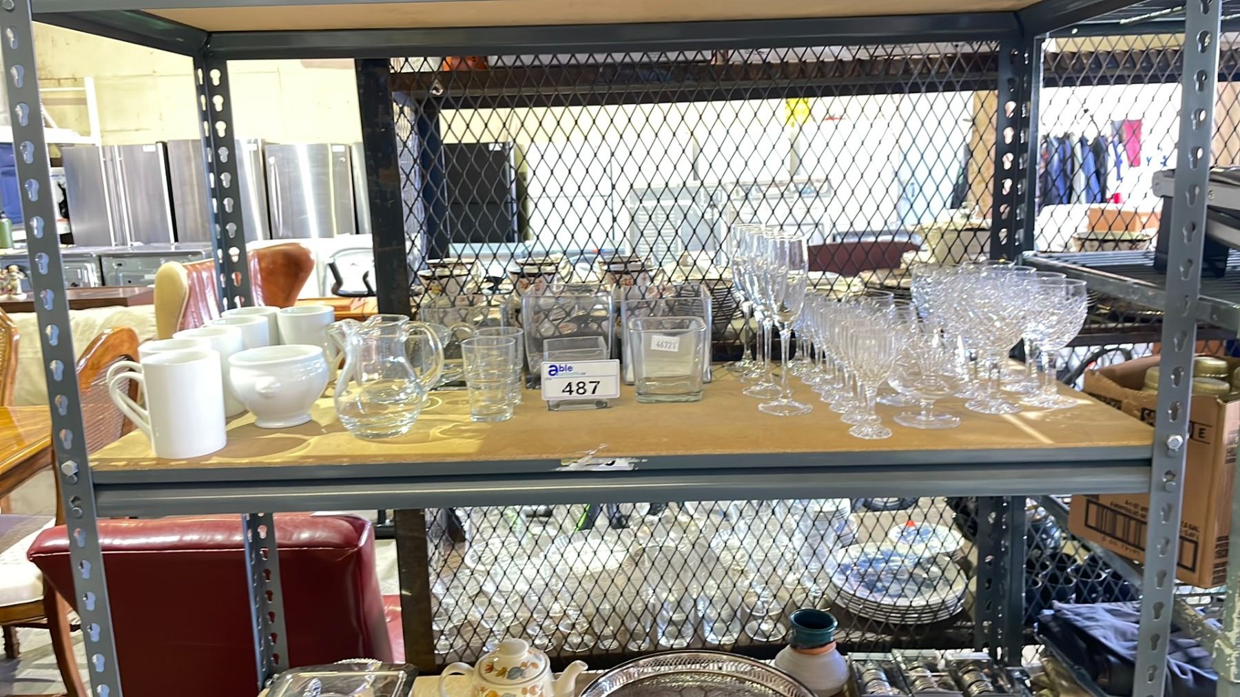 SHELF OF ASSORTED GLASSWARE, CRYSTALWARE, MILK GLASS PORCELAIN MUGS & MORE