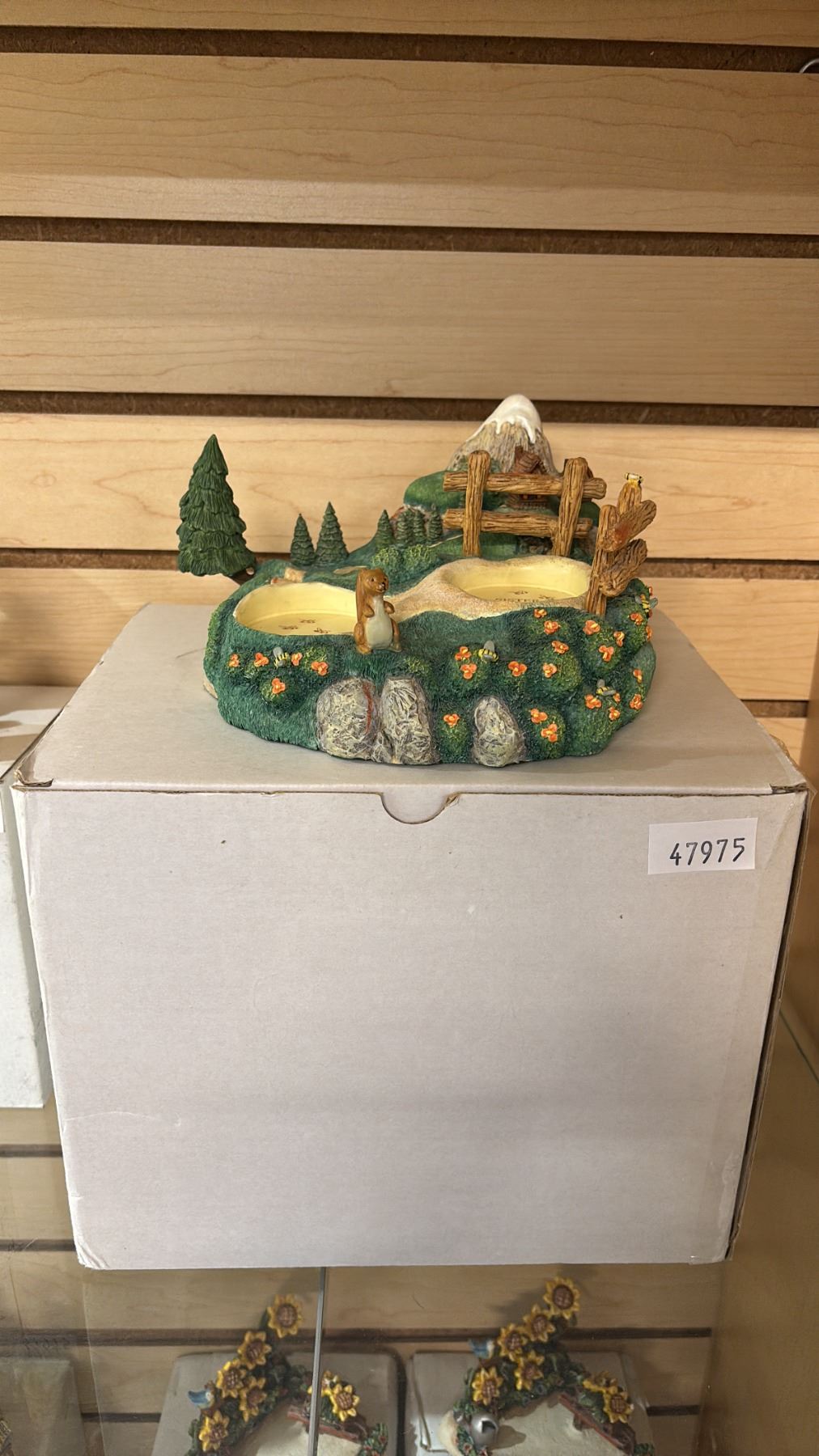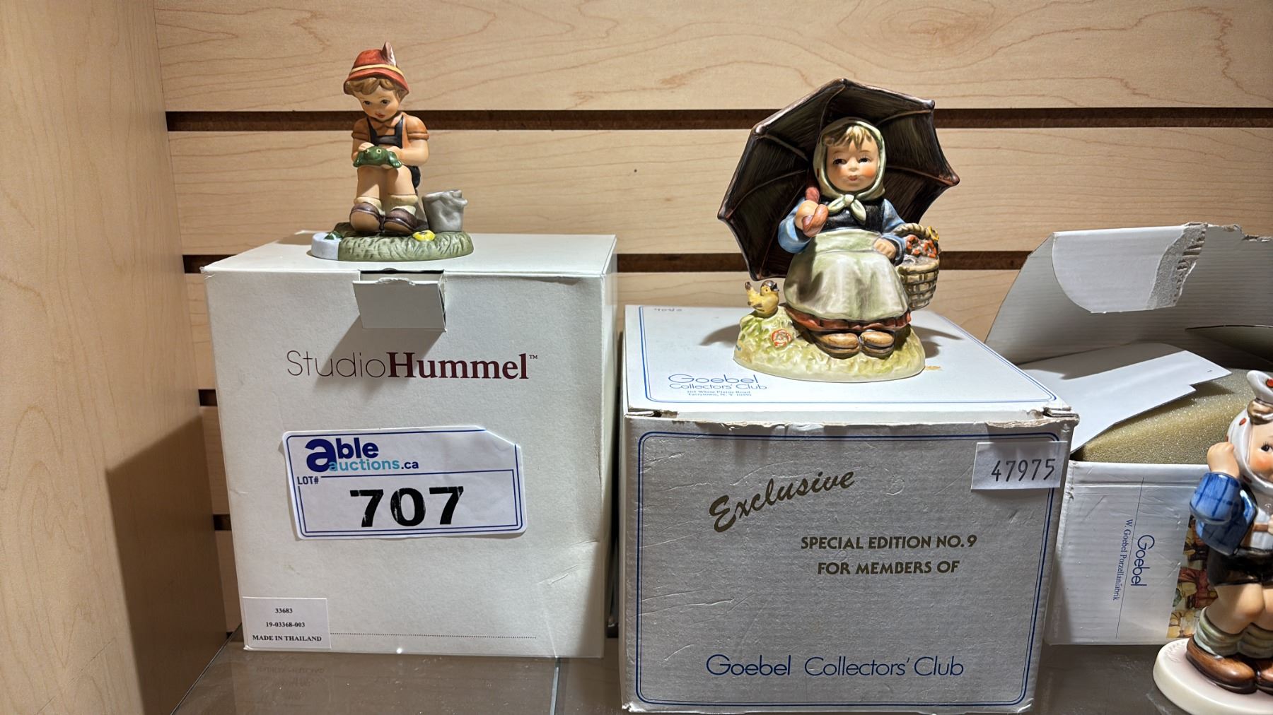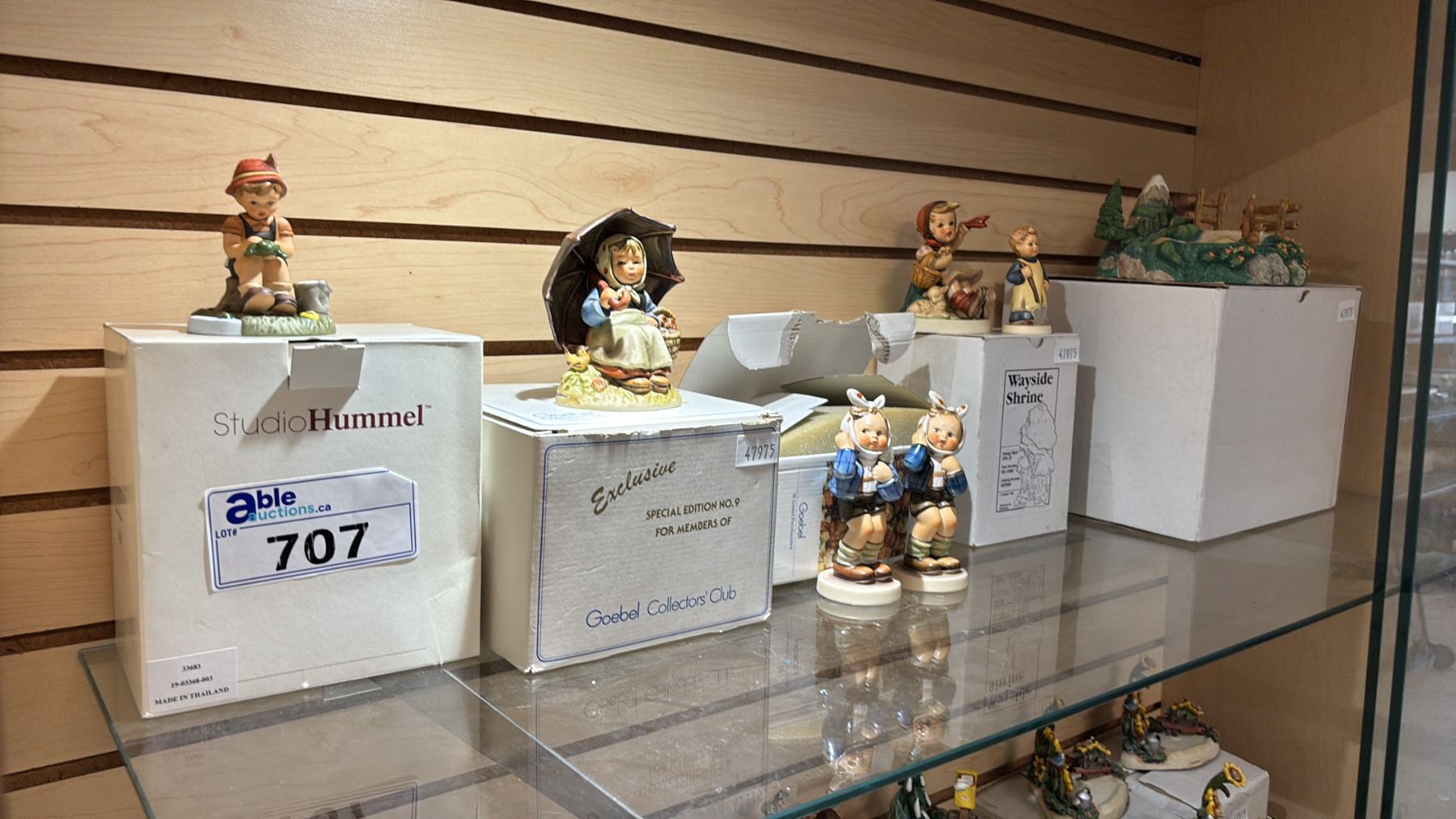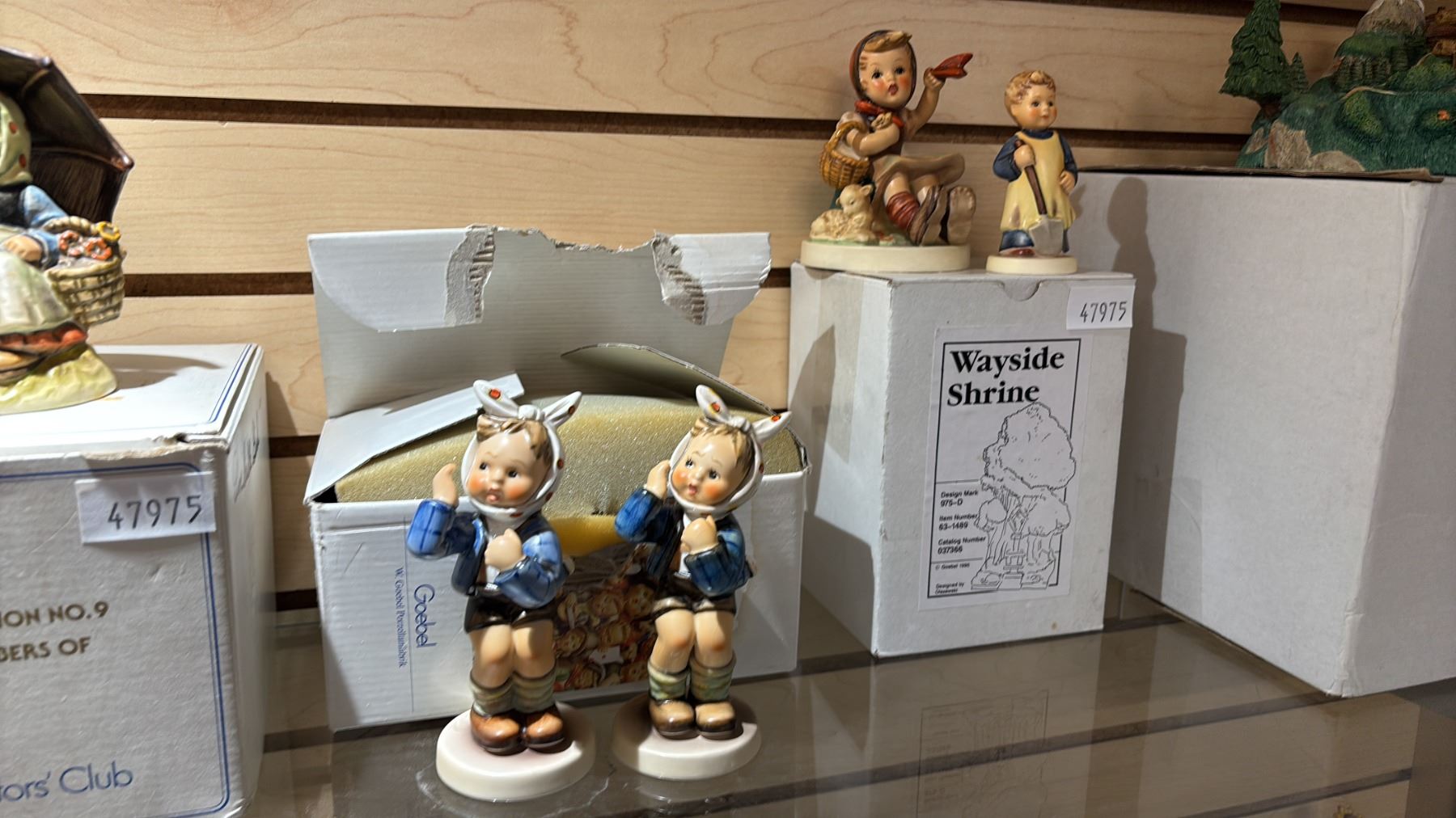 SHELF OF ASSORTED GOEBEL PORCELAIN FIGURINES WITH BOXES: INCLUDES A HUMMELSCAPE DISPLAY STAND