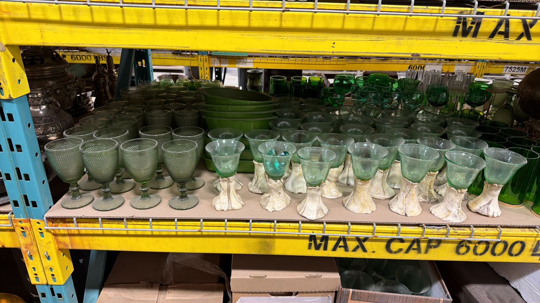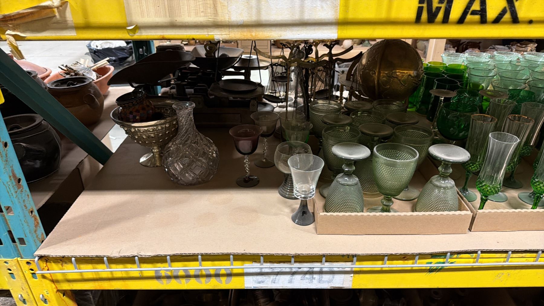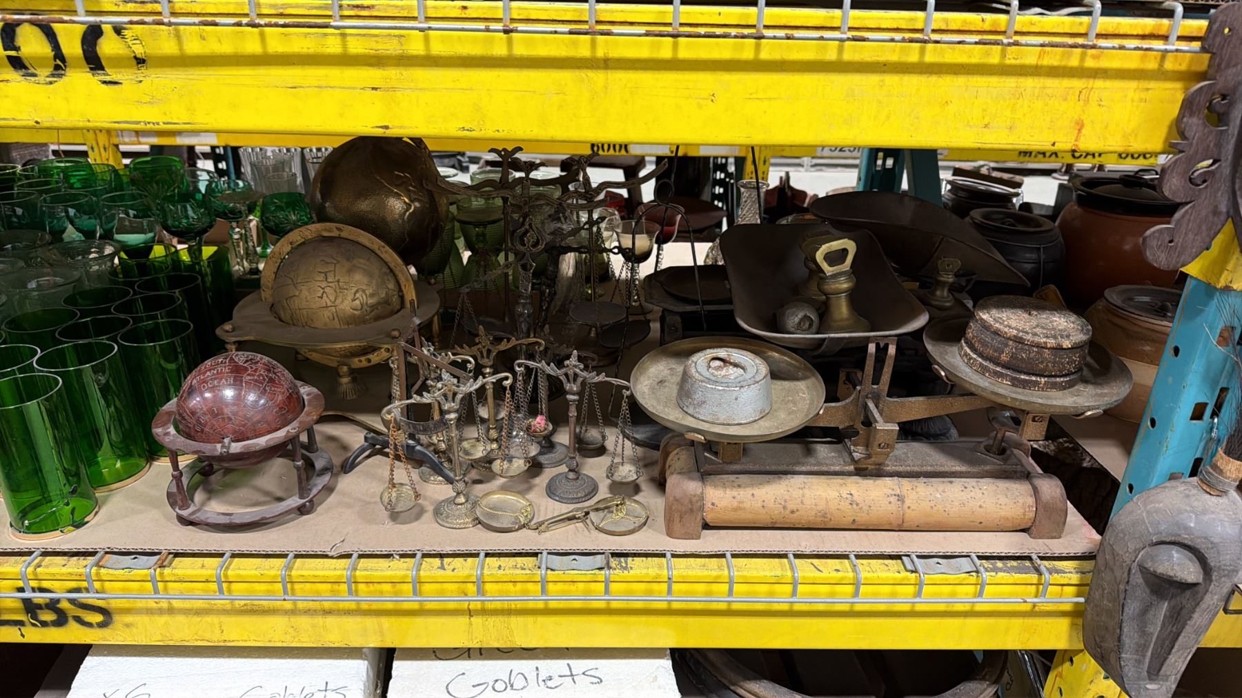 SHELF OF ASSORTED GREEN GLASS DRINKING GOBLETS/GLASSES, ANTIQUE BRASS SCALES, VINTAGE GLOBES & MORE