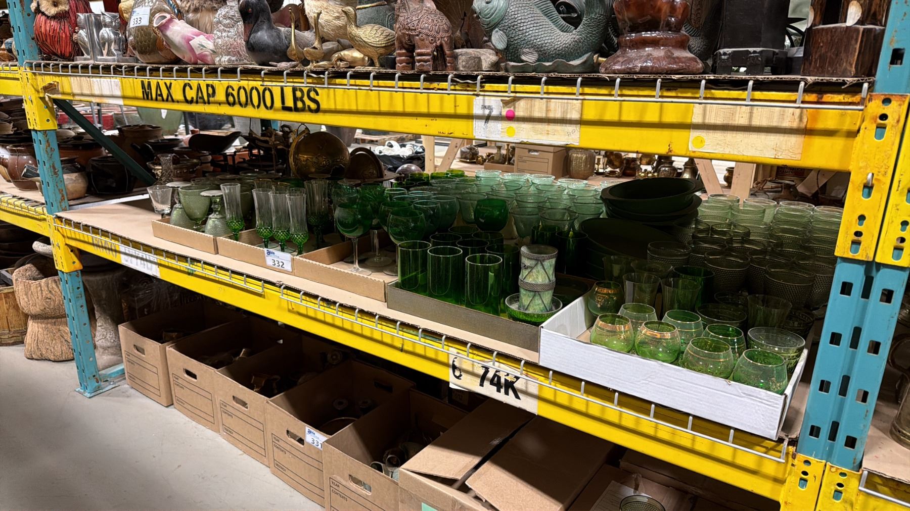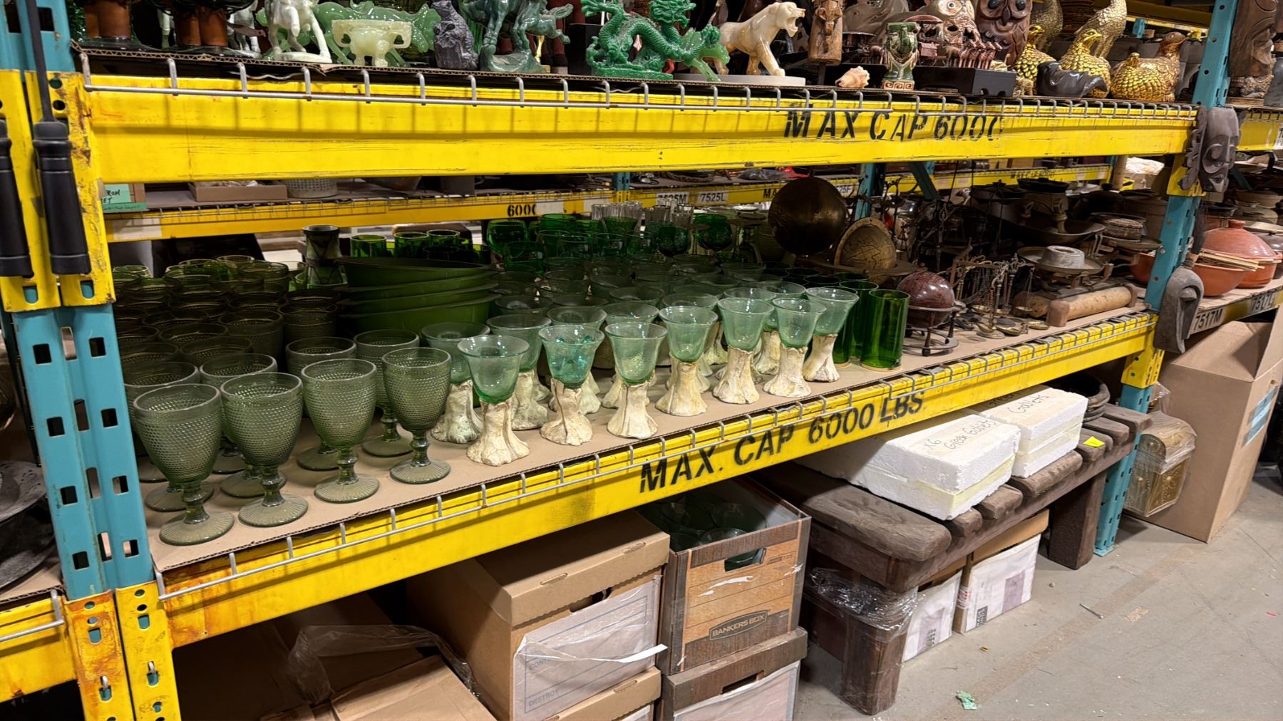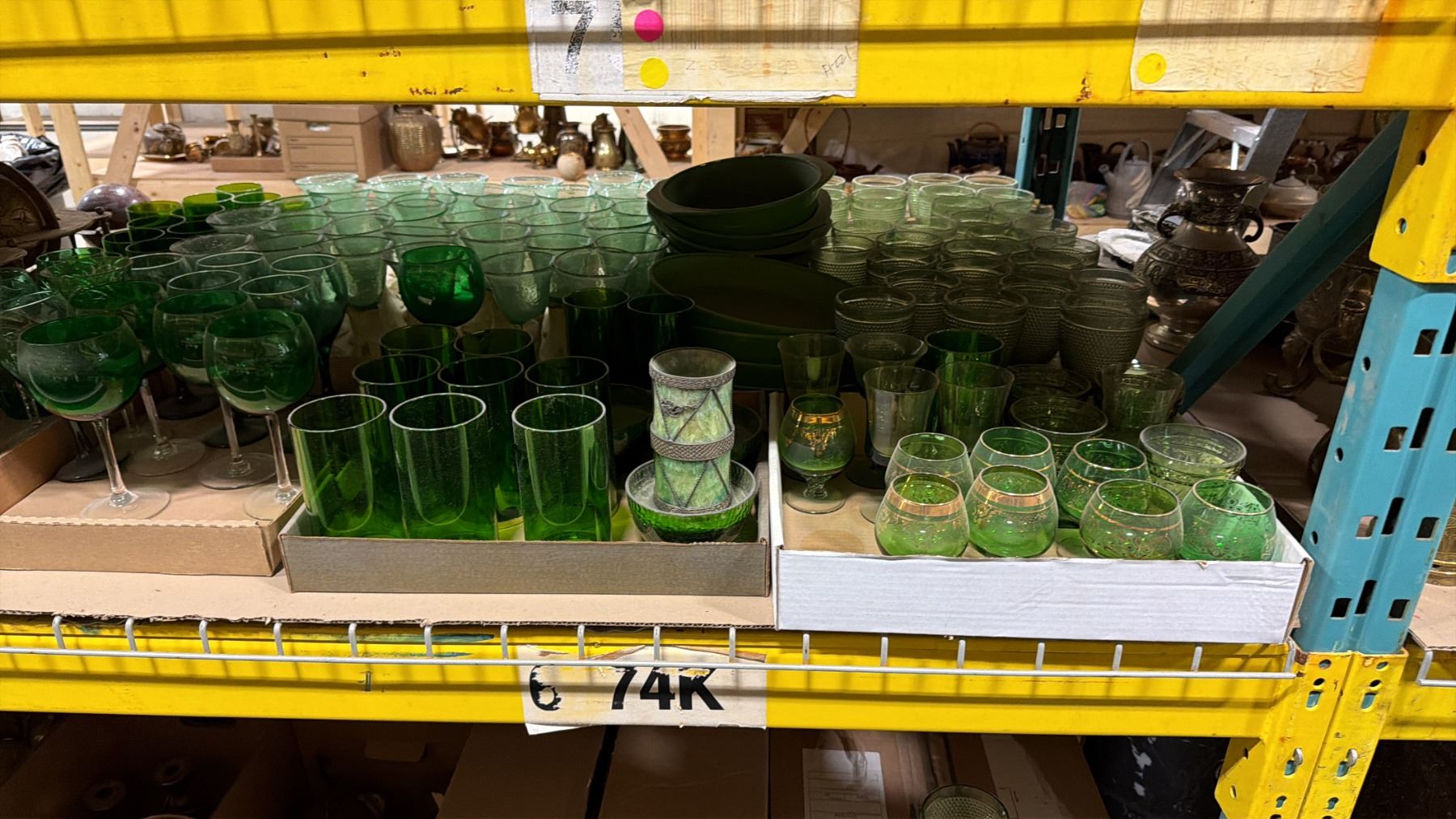 SHELF OF ASSORTED GREEN GLASS DRINKING GOBLETS/GLASSES, ANTIQUE BRASS SCALES, VINTAGE GLOBES & MORE