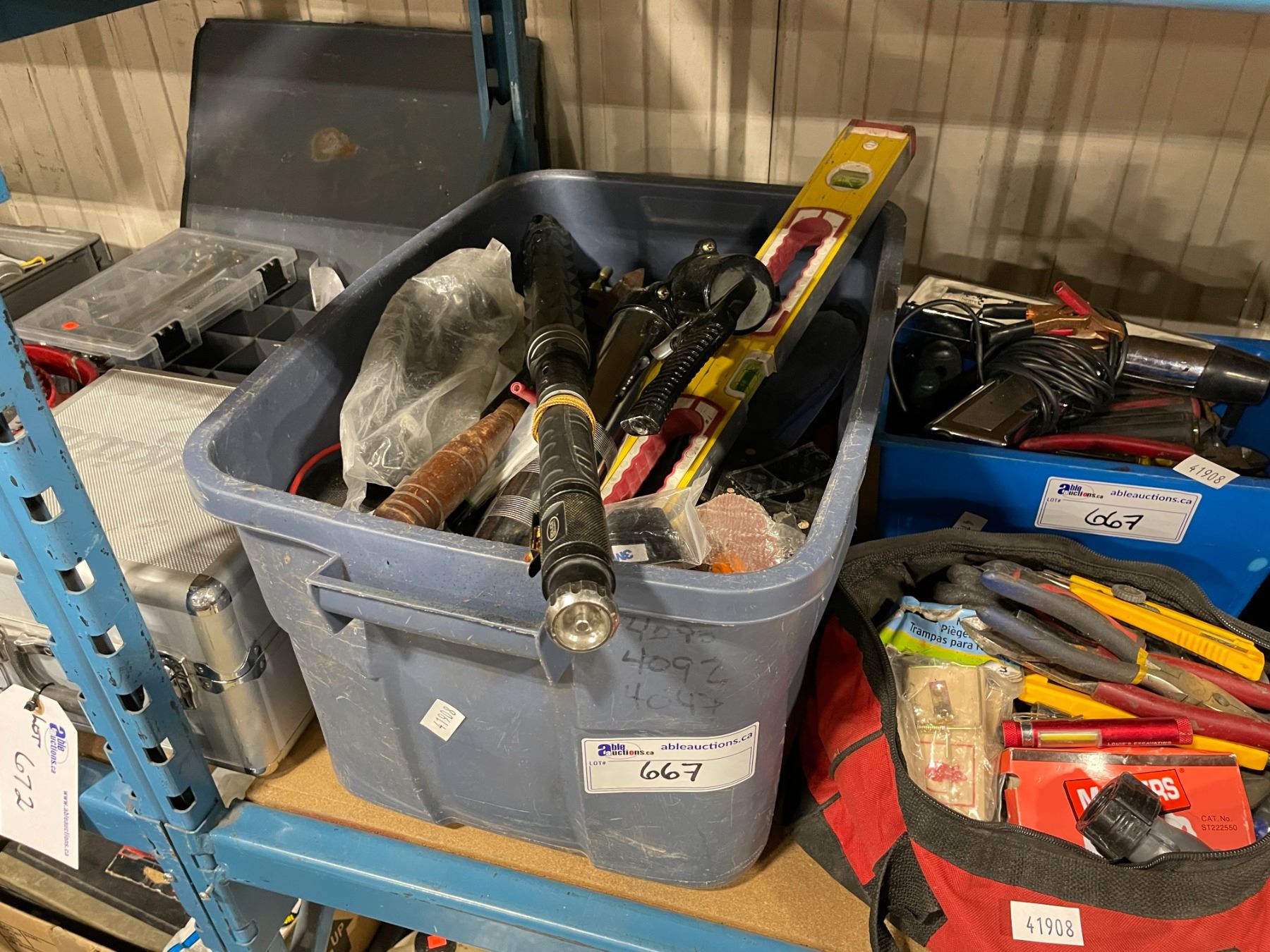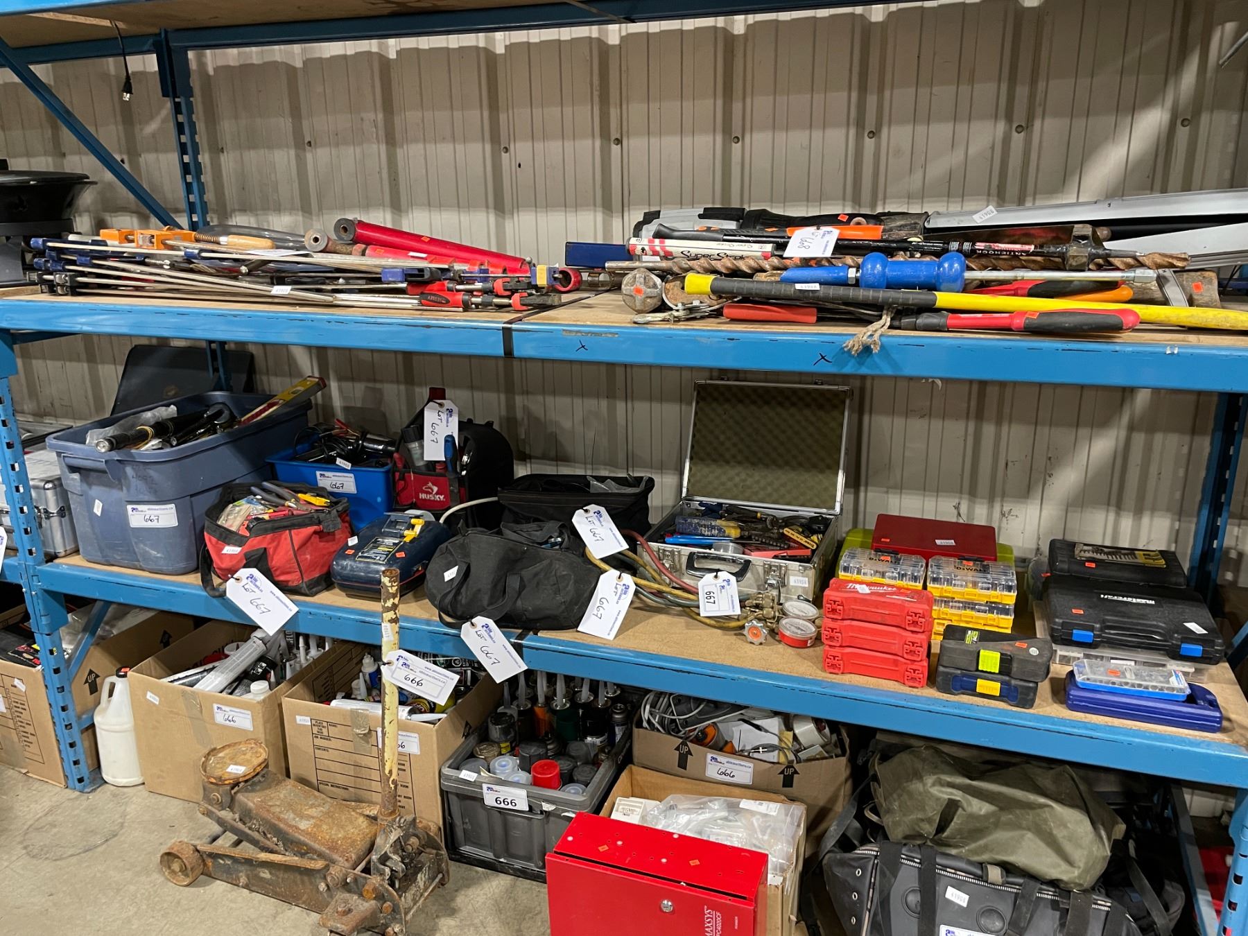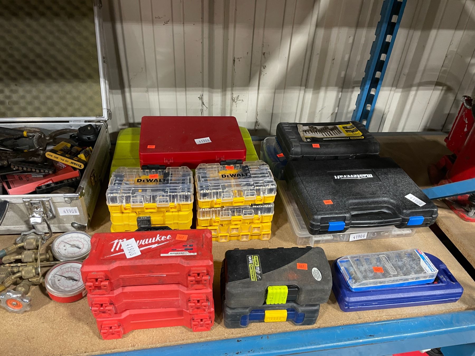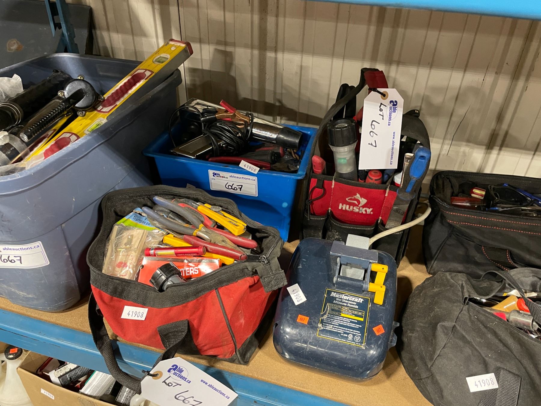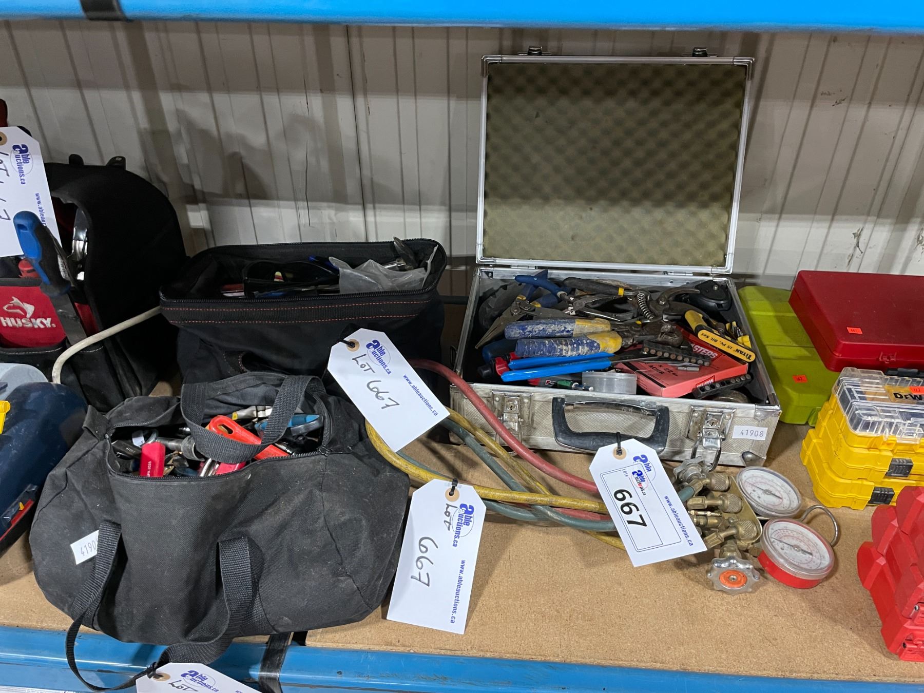 SHELF OF ASSORTED HAND TOOLS, TOOL BAGS, BIT SETS & MASTERCRAFT WET SHARPENER