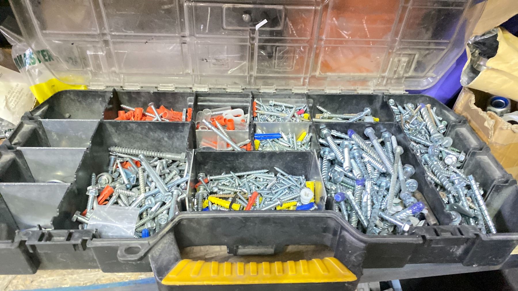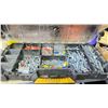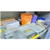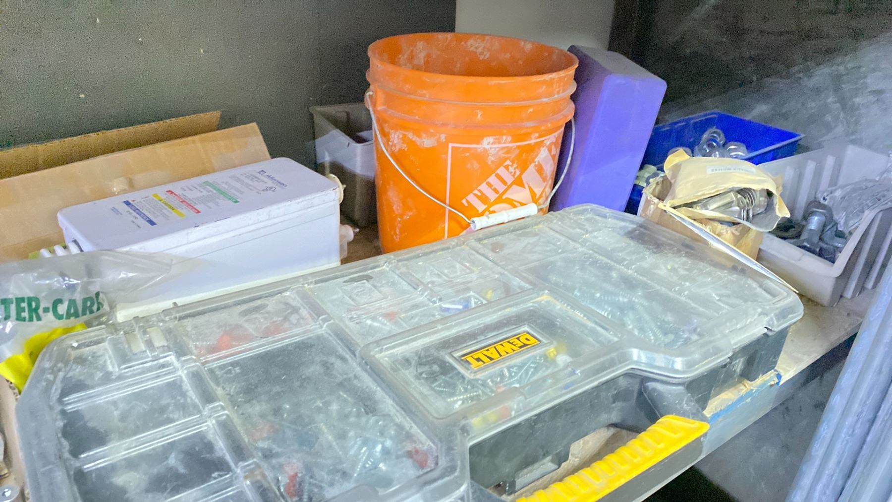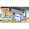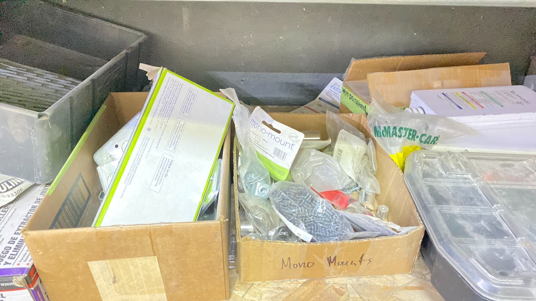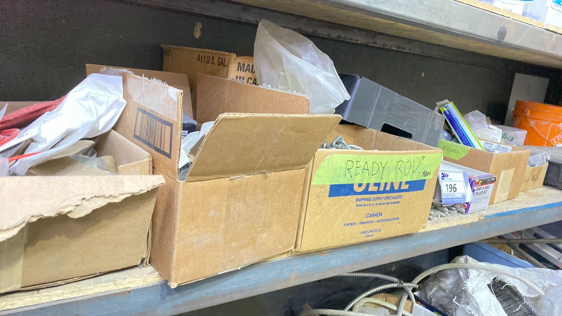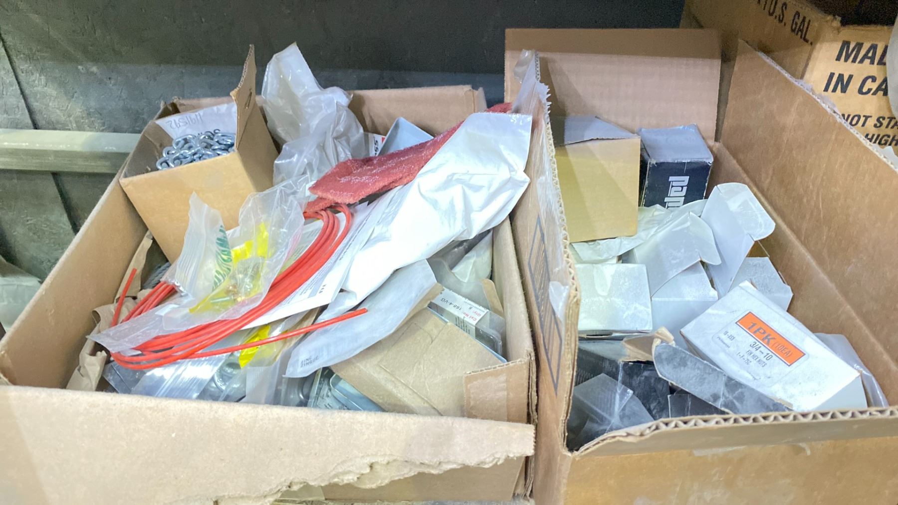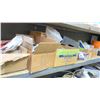SHELF OF ASSORTED HARDWARE, ELECTRICAL BOXES AND MORE