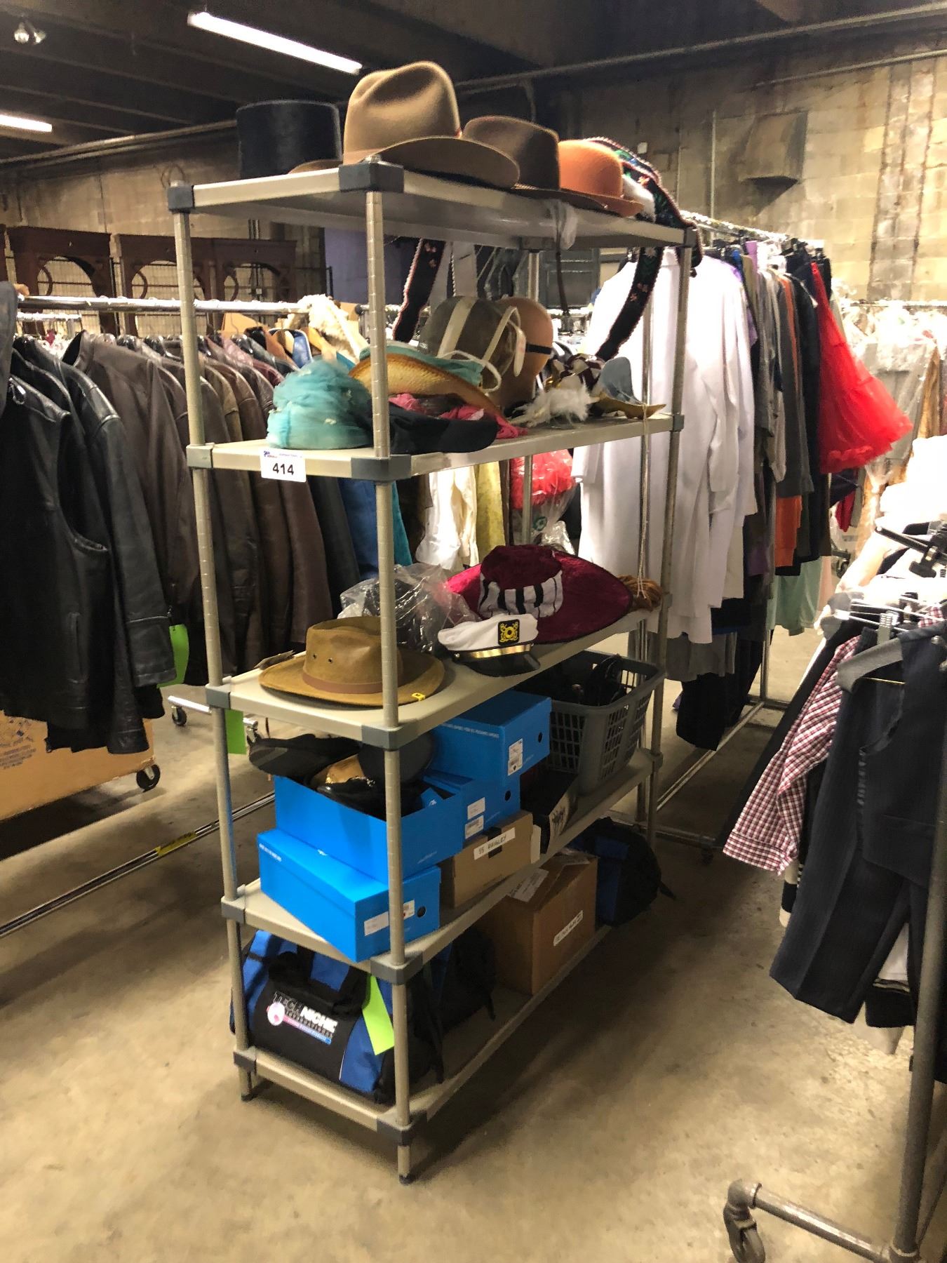 SHELF OF ASSORTED HATS, SHOES & MORE